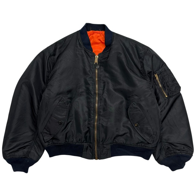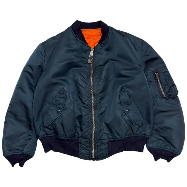 Size : L (身幅61cm 着丈62cm 袖丈61cm) 1980年代後半から1990年代初頭に製造された、アルファ インダストリーズ社製のMA-1フライトジャケット。 一般市場向けに製造された商用モデル。 無骨な黒に落ち着いたネイビーのリブが、都会的で洗練された印象に。裏地は王道のレスキューオレンジで、リバーシブルでの着用も可能です。 ジッパーはブラス製で、レザーの引き手も残っています。