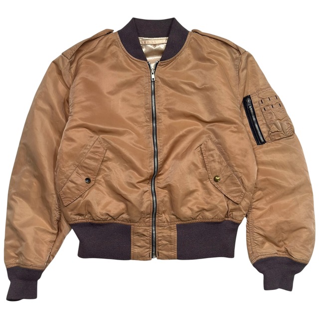 Size : 実寸 (身幅60cm 着丈61cm 袖丈65cm) 90年代、アルファインダストリーズ製のL-2Bフライトジャケット。 最大の特徴は、この絶妙な「シャンパンゴールド」のカラーリング。ミリタリー特有の無骨さを残しつつも、光沢のあるナイロンサテン生地がモードやタウンユースにも馴染む上品な一着に仕上がっています。 MA-1に似たシルエットですが、こちらは中綿のないライトゾーン(10°C〜30°C)用モデル。これからの季節、Tシャツの上にさらっと羽織るのに最適な一着です。