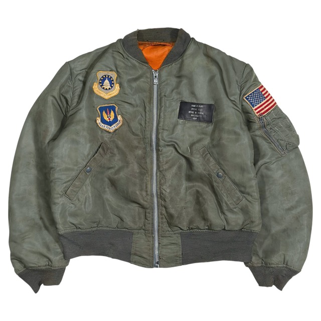 Size : L (身幅64cm 着丈60cm 袖丈63cm) 1967年納入、USAF実物のL-2Bフライトジャケットです。 MA-1と並ぶ名作ですが、こちらは中綿のないライトゾーン向けモデル。春秋の羽織りとして、また冬のレイヤードスタイルにも最適で、スッキリとしたシルエットが魅力です。 本品はスペック「MIL-J-7448H」。このモデルから肩のエポレットが廃止され、よりタウンユースに馴染むミニマルなデザインへと進化しています。ジッパーはヴィンテージ好きにはたまらない「CONMAR」製のブラスジップを搭載。レザーの引き手も残っています。 裏地は遭難時に発見されやすいよう採用されたレスキューオレンジ。