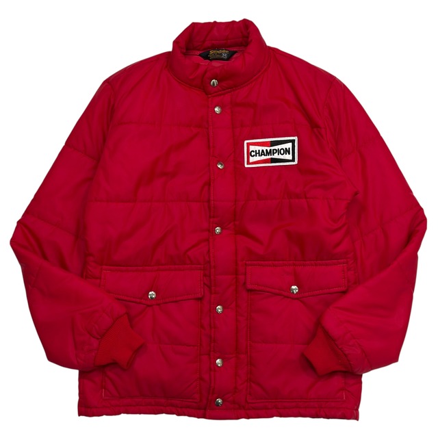 Size : M (身幅54cm 着丈74cm 袖丈68cm) 1970年代頃のSwingster社製、Championスパークプラグのオフィシャル・レーシングジャケット。 ボディは鮮やかなレーシングレッドのナイロンシェルで、内側には保温性に優れた中綿キルティングが施されています。フロントはジッパーとスナップボタンの二重構造になっており、風の侵入を防ぐ機能的な設計です。当時のレーシングウェアで圧倒的なシェアを誇ったスウィングスター社製ならではの、しっかりとした作りとクラシックなシルエットが魅力です。