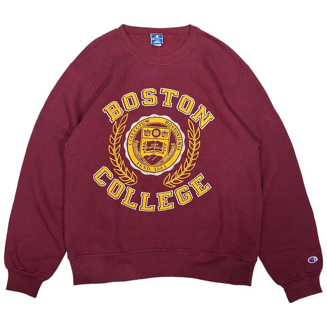 Size : L (身幅56cm 着丈67cm 袖丈63cm) 1990年代の、Champion 製カレッジスウェット。 フロントには「BOSTON」のアーチレターと、ボストンカレッジのシールドを組み合わせたカレッジグラフィック。周囲を囲う月桂樹デザインも含め、クラシックなカレッジスウェットらしい一枚です。 ボディはバーガンディ。イエロー×ホワイト配色のプリントで、全体にひび割れたラバープリントの表情もヴィンテージらしい雰囲気。 タグはChampionの青刺繍タグ、MADE IN U.S.A.表記入り。サイズはLARGE。 リバースウィーブではない分、シルエットもすっきりしていて普段のスタイルにも取り入れやすい一着。