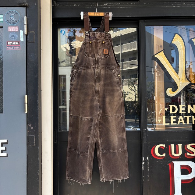 Size : 実寸 (ウエスト 36inch レングス 31inch) アメリカの老舗ワークウェアブランド、Carharttの定番モデル、ブランドを象徴する12オンスのヘビーウェイト・コットンダック生地を使用したビブオーバーオールです。 この“ダック”ファブリックは、Carharttの代名詞とも言える素材。 厚手でハリがありながらも着込むほどに柔らかく馴染み、経年で独特の風合いを生み出していきます。 主要な縫製箇所はトリプルステッチ仕上げ、膝はダブルニー構造で補強され、現場作業にも耐える頑丈な作り。 サイドにはツールポケットとハンマーループ、背面にもループが付き、実用性の高さも魅力です。 ワークウェアとして生まれながら、タウンユースにも自然に馴染む一本。 程よくフェードしたダックの色味や、生地の表情も含めて、Carharttらしい魅力がしっかり感じられます。 ワークパンツやデニムとはまた違う存在感を持った、永く付き合える定番アイテムです。