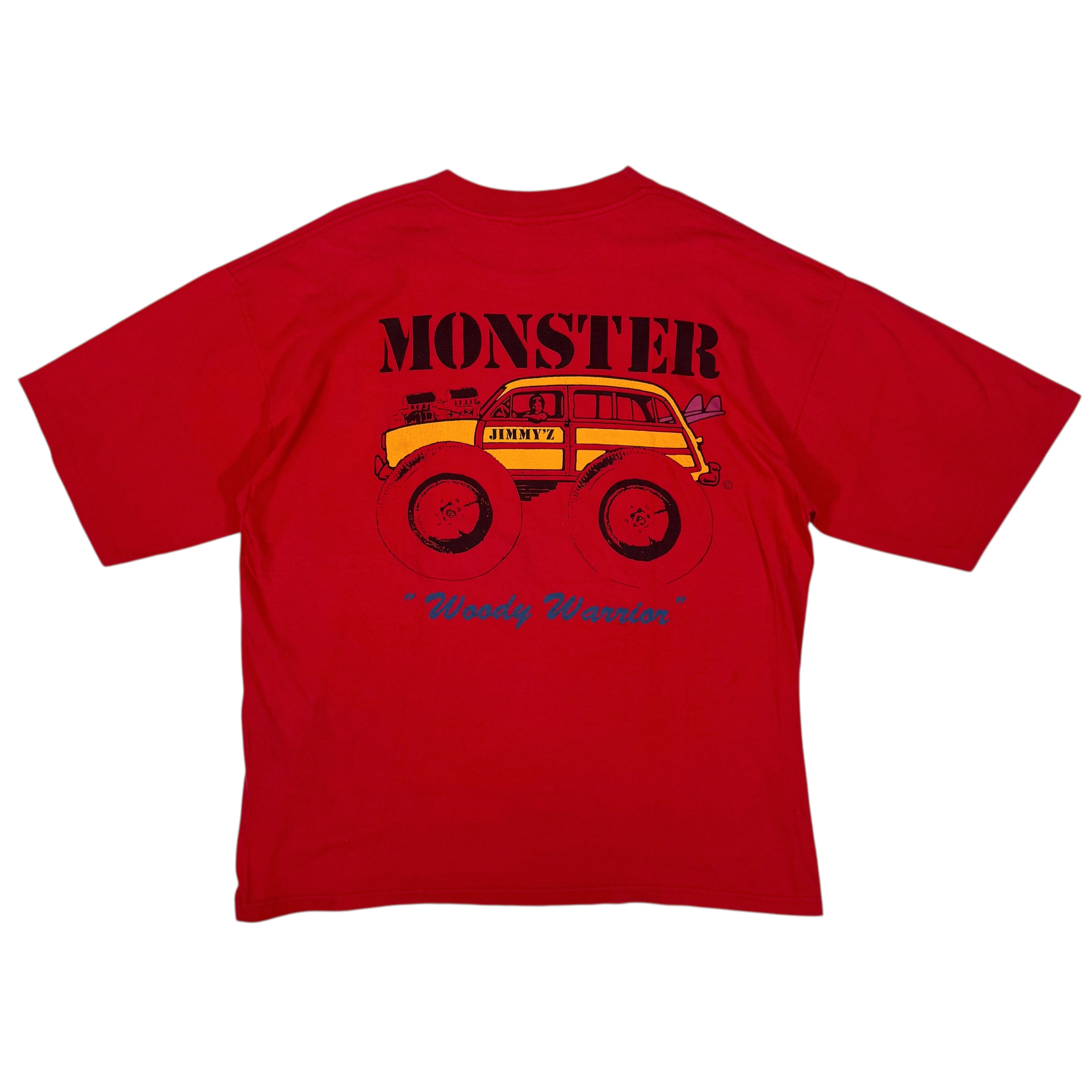 鮮やかなレッドボディに、バックにはモンスタートラック化したウッディワゴンがプリントされた一枚。