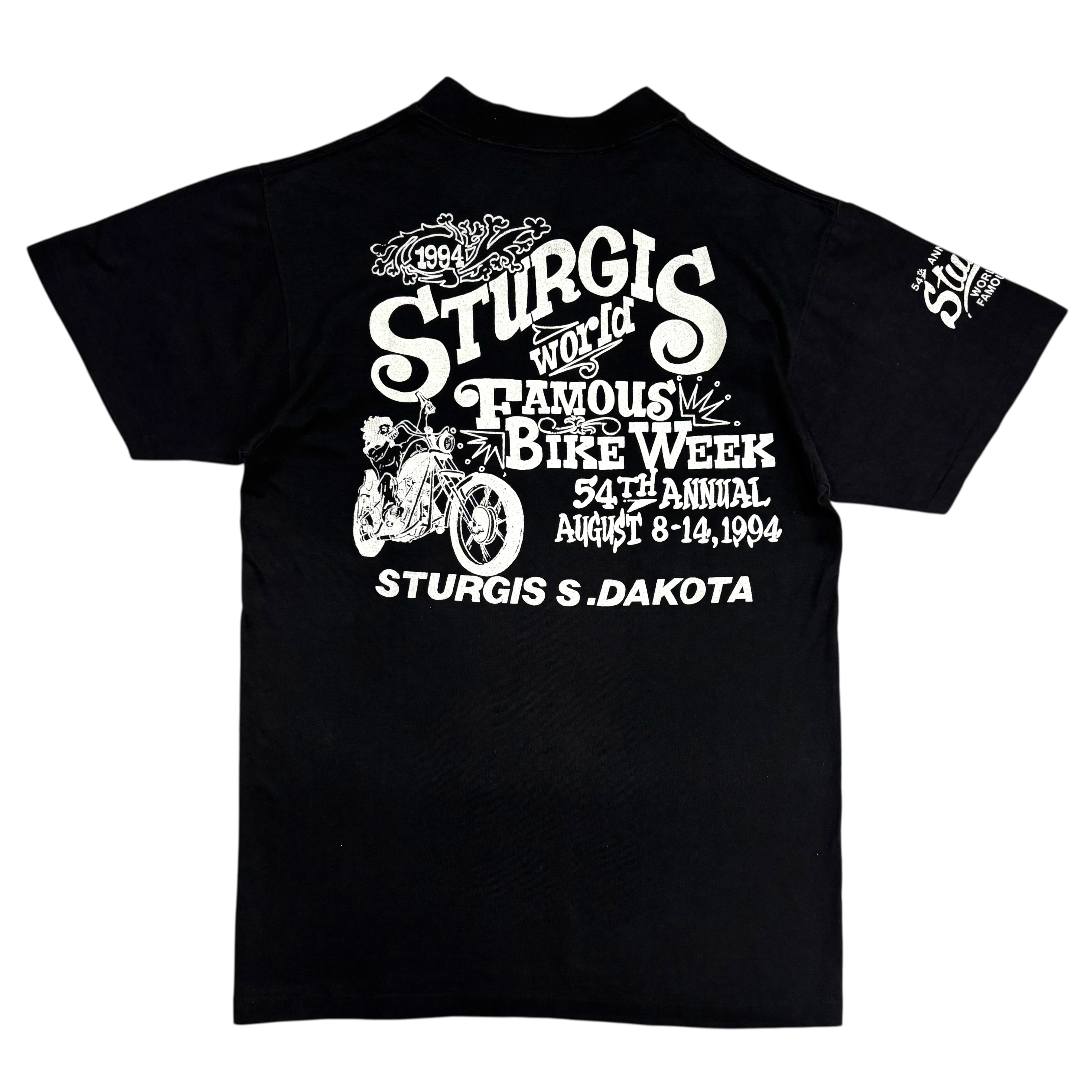 稲光が走る岩山にチョッパーが描かれたフロント。バックには“STURGIS WORLD FAMOUS BIKE WEEK”のロゴ、左袖にもイベント名入りで、三面プリントと豪華仕様◎