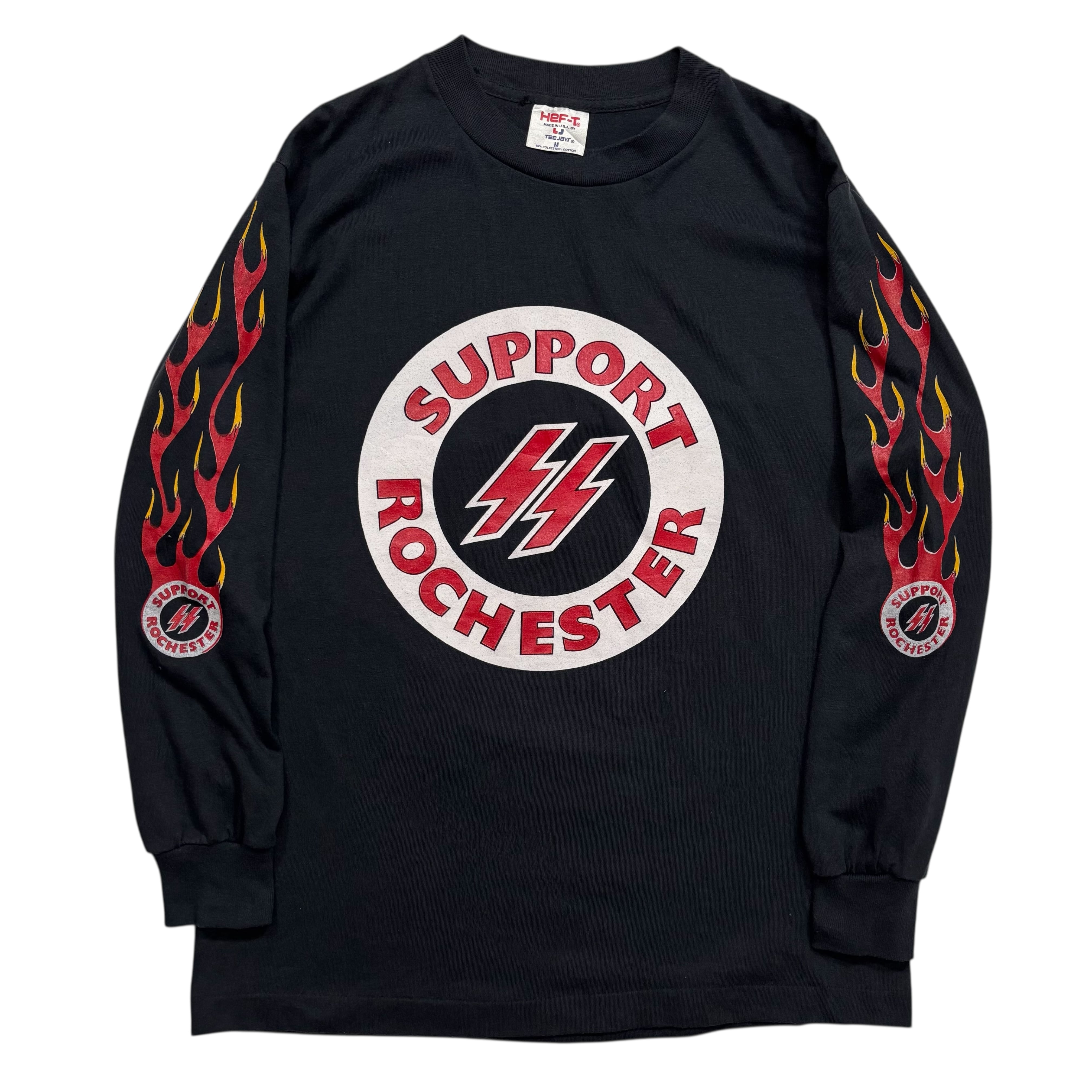 フロントには「SUPPORT ROCHESTER」の文字とともに、稲妻ロゴを大胆にレイアウト。両袖には燃え上がるようなフレイム柄のプリントが入り、袖口には再びサークルロゴが配置された、抜群の存在感を誇る一着です。