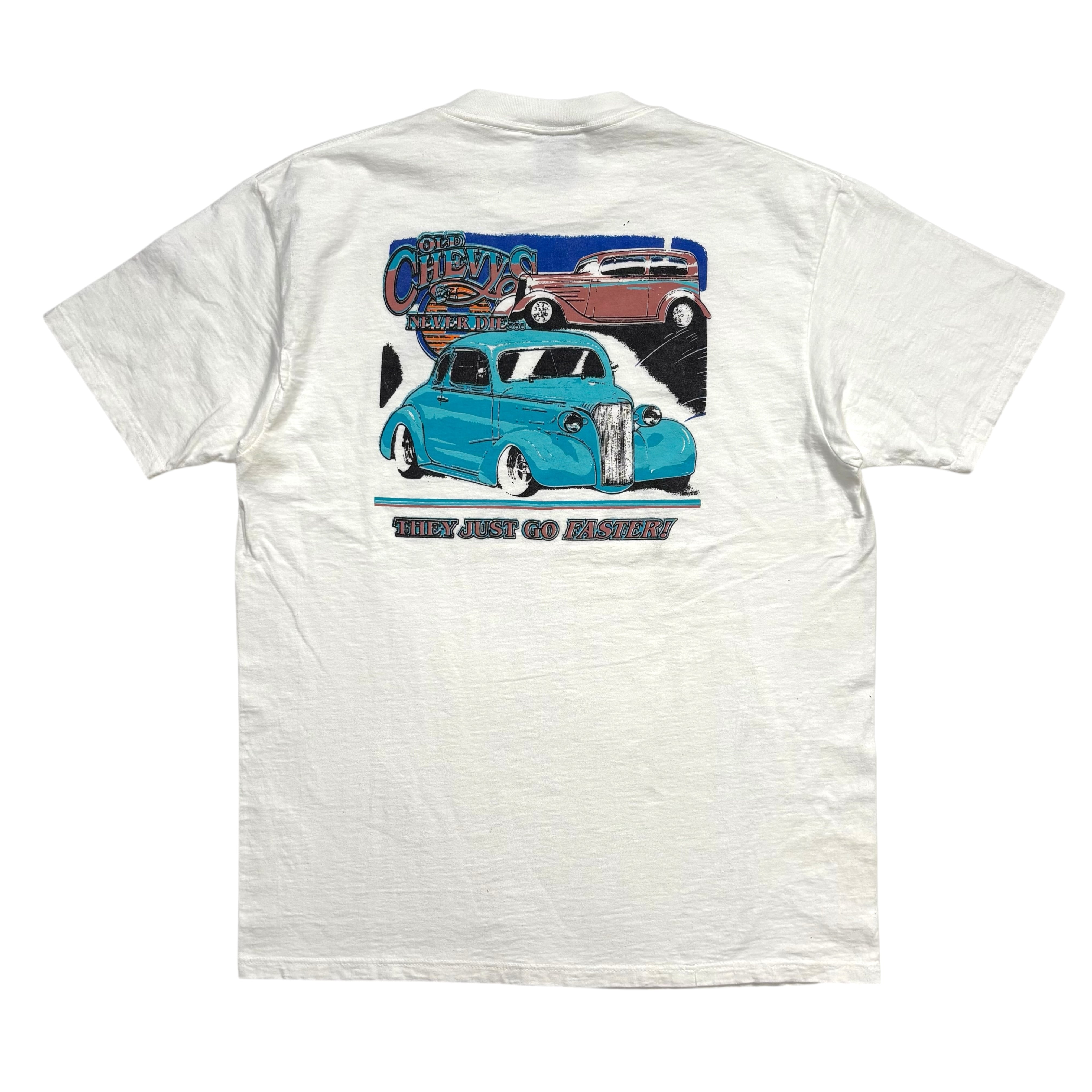 クラシック・シボレーをテーマにした、アメリカンホットロッド系のグラフィックTシャツ。