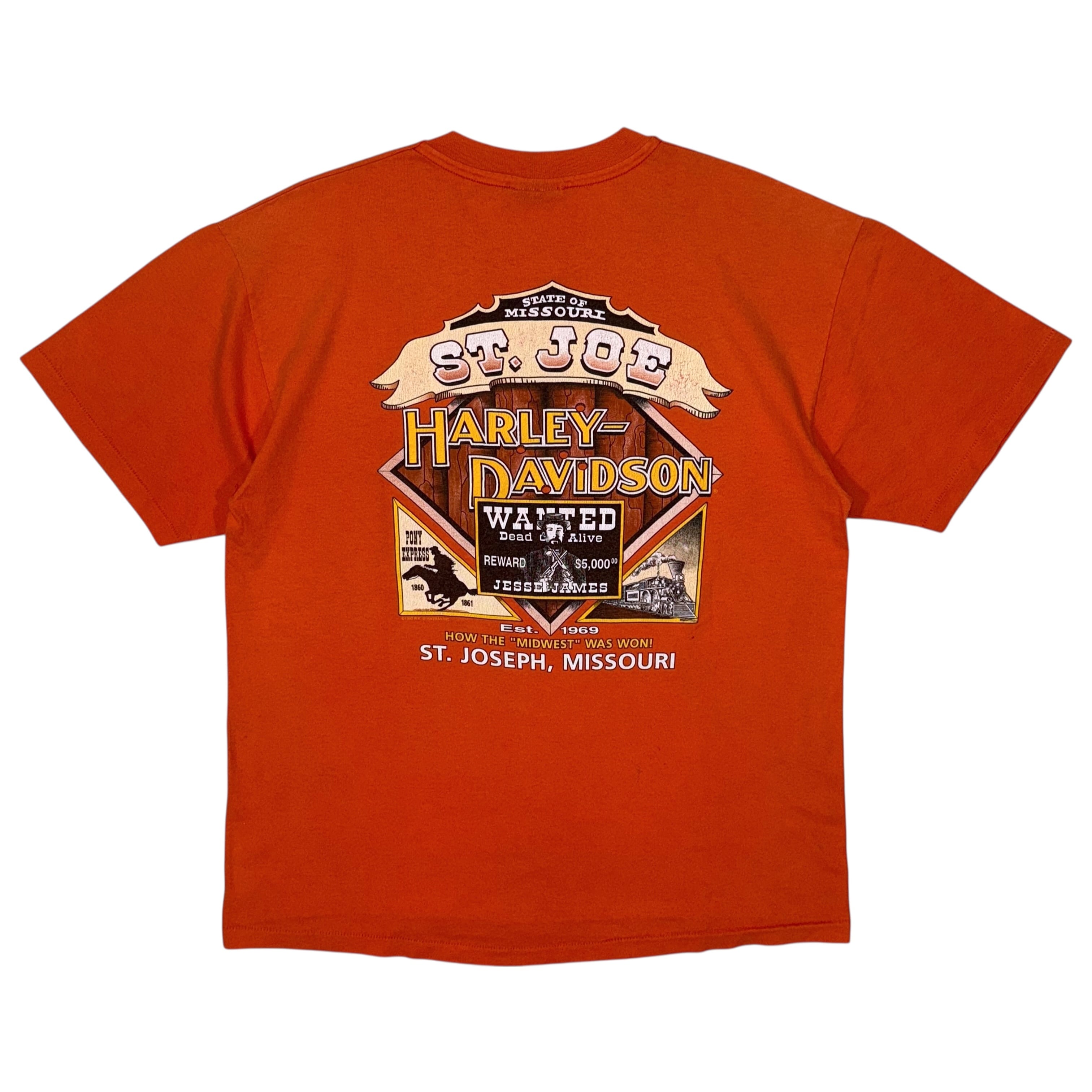 フロントにはスピード感ある“Sportster”ロゴ。背面にはディーラー拠点のミズーリ州セントジョセフにちなんだグラフィックが大きく入り、「JESSE JAMES」や「PONY EXPRESS」「機関車」といった西部開拓時代のモチーフでまとめられた、ローカル色の強い一枚。