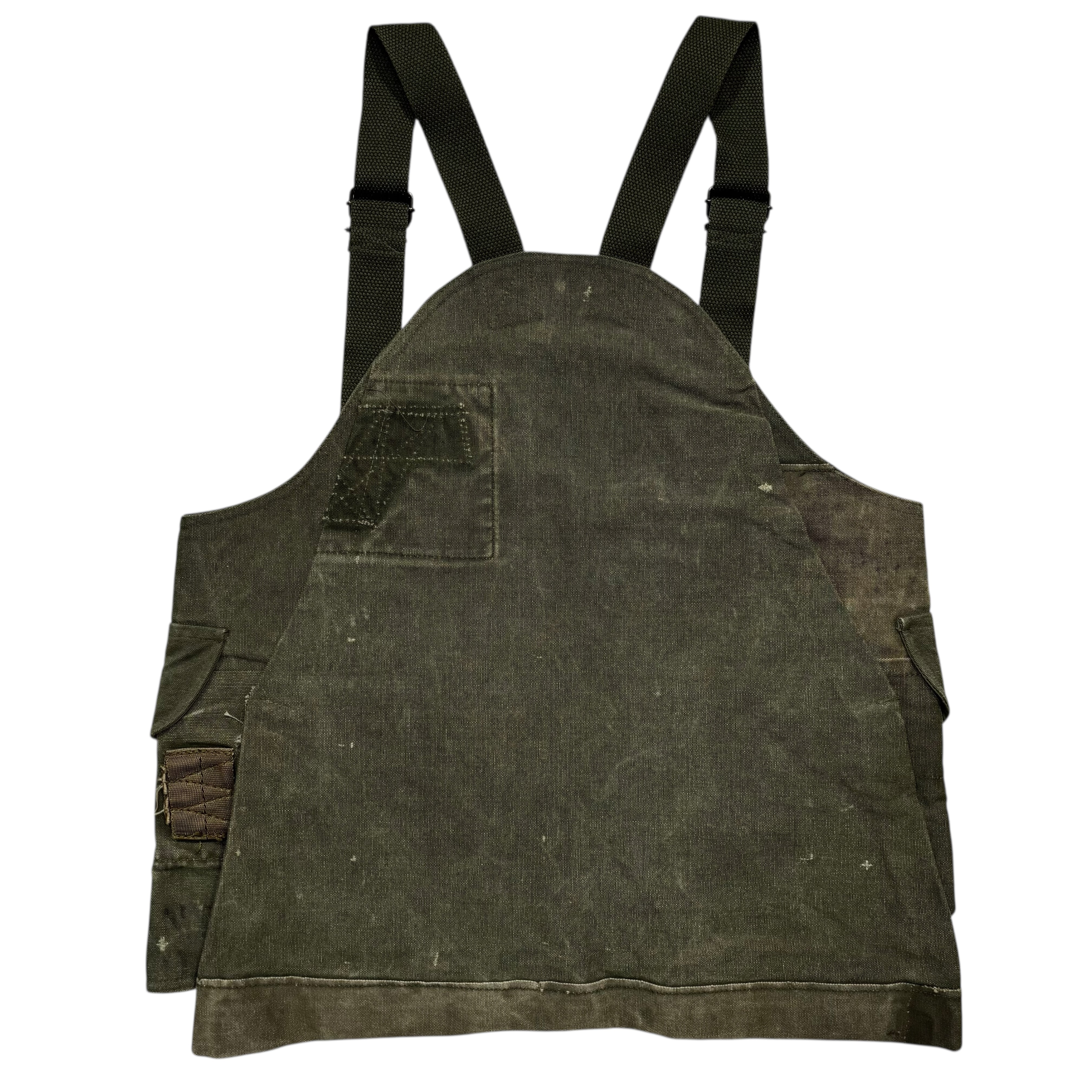 Vintage物のUS Military Duffel Bagを解体してHunting Vestにアップサイクルした逸品。狩猟用のベストなので、仕留めた獲物を収納する為の大きなゲームポケットが背面にあったり、マチ入りのパッチポケットなど、大容量のポケットが随所に施され機能性は勿論、そのルックスがアクセントになり、タウンユースでも抜群の存在感を発揮します。フロントストラップ、ショルダーストラップの調節によって、Tシャツからヘビーアウターまでレイヤードが対応可能。サクっと取り入れるだけでマンネリ解消にも一役買う優れものです。