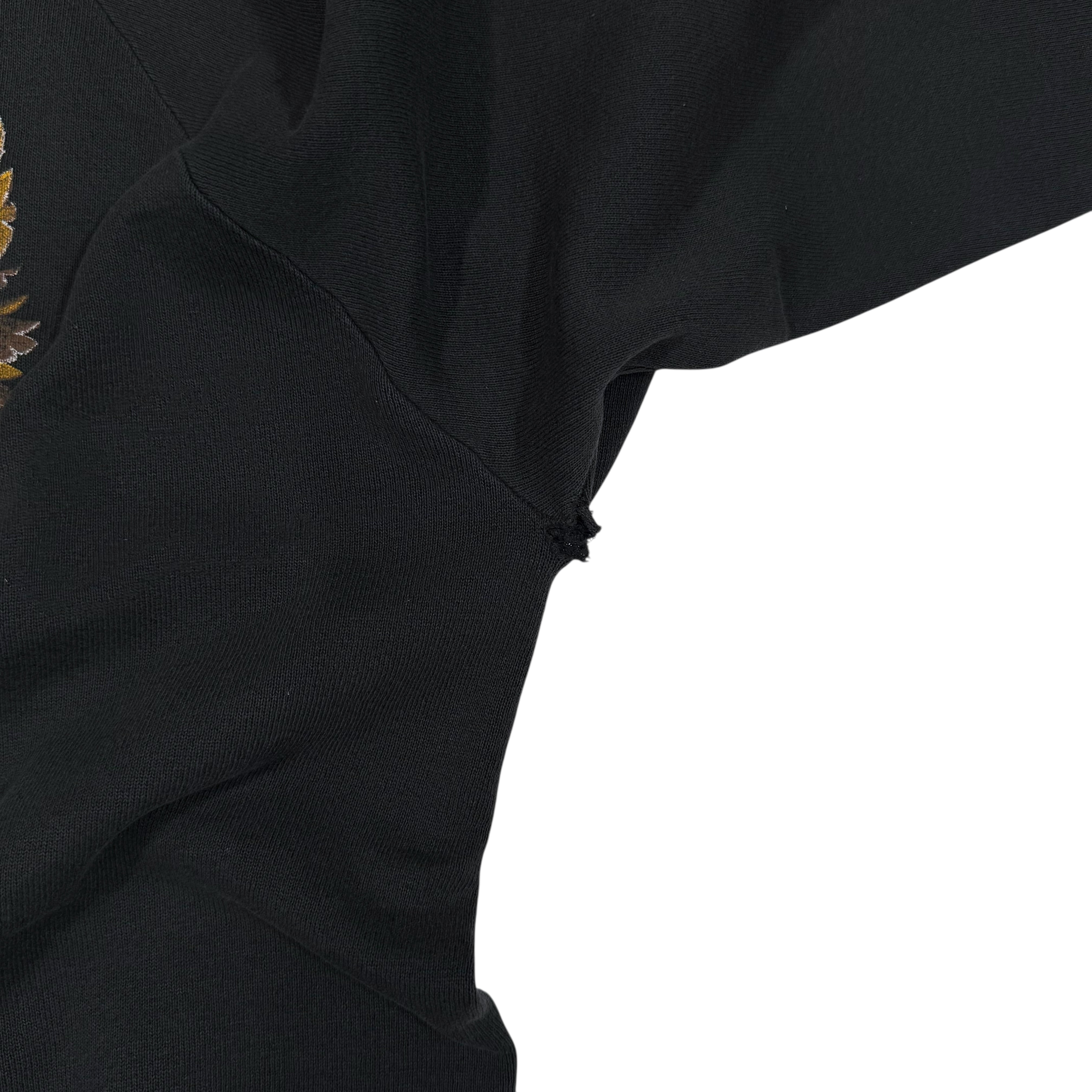 当時のスウェット特有の生地感や、やや色褪せたプリントの風合いがヴィンテージらしい魅力を放っています。ブラックボディにブルーの差し色が効いたバランス感も絶妙です。