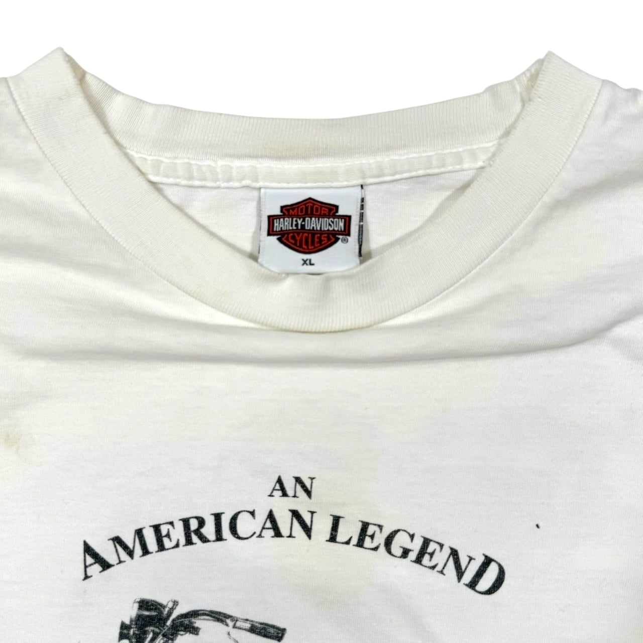 フロントは「AN AMERICAN LEGEND」の文字とクラシックなHarleyバイクのプリント、両袖には「HARLEY-DAVIDSON」のロゴが縦に入ったロンTらしい仕様。