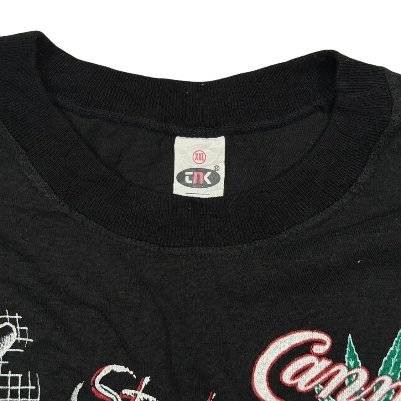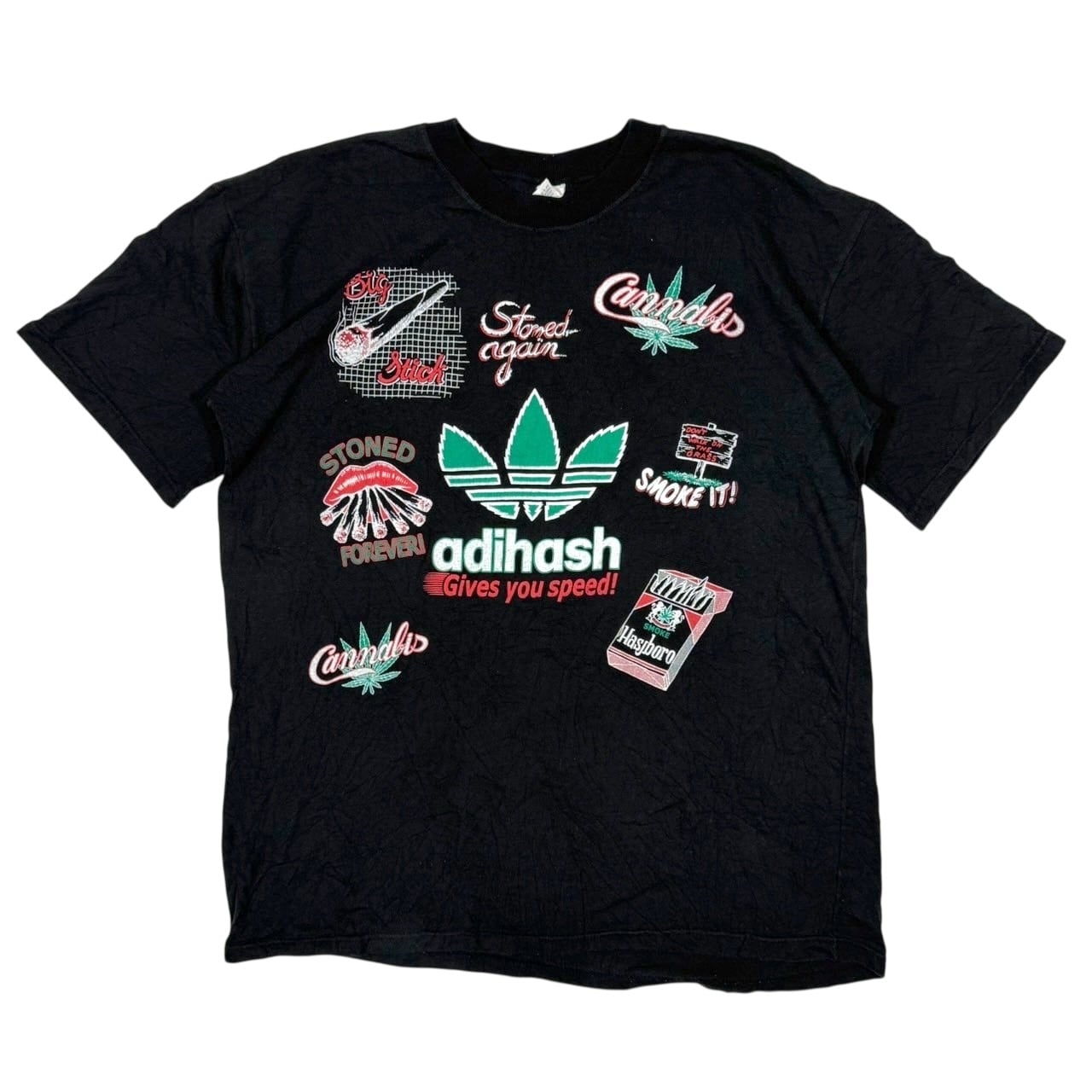 90’s〜頃のパロディTee、「adihash」モチーフの一枚です。フロント全面にぎっしりと大麻カルチャーをテーマにしたプリントが入っていて、ブランドロゴやタバコのパッケージをもじったデザインなど、インパクト抜群。