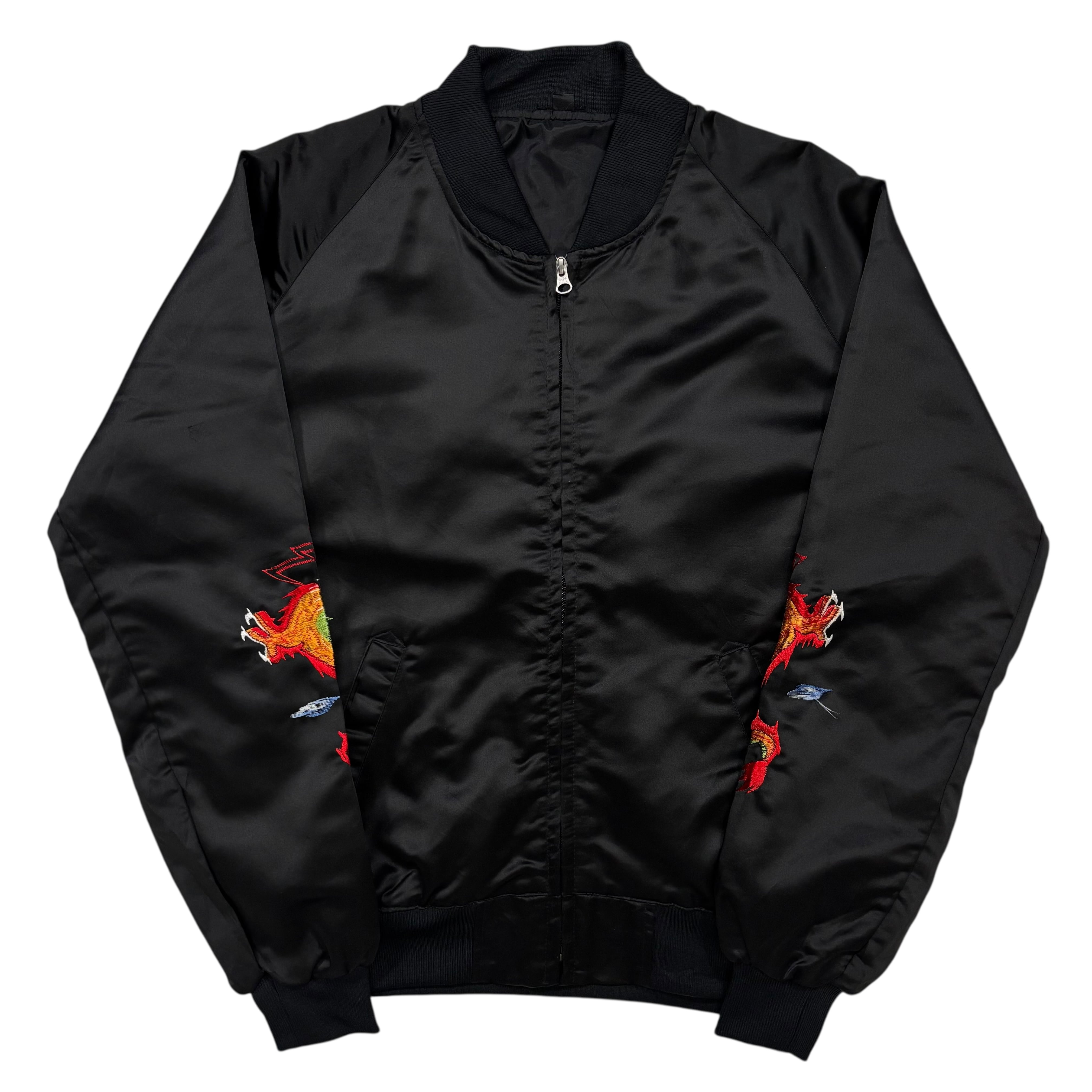光沢のあるブラックサテンボディに、背面には日本地図と龍の大判刺繍、両袖にも龍の刺繍が入る豪華仕様。