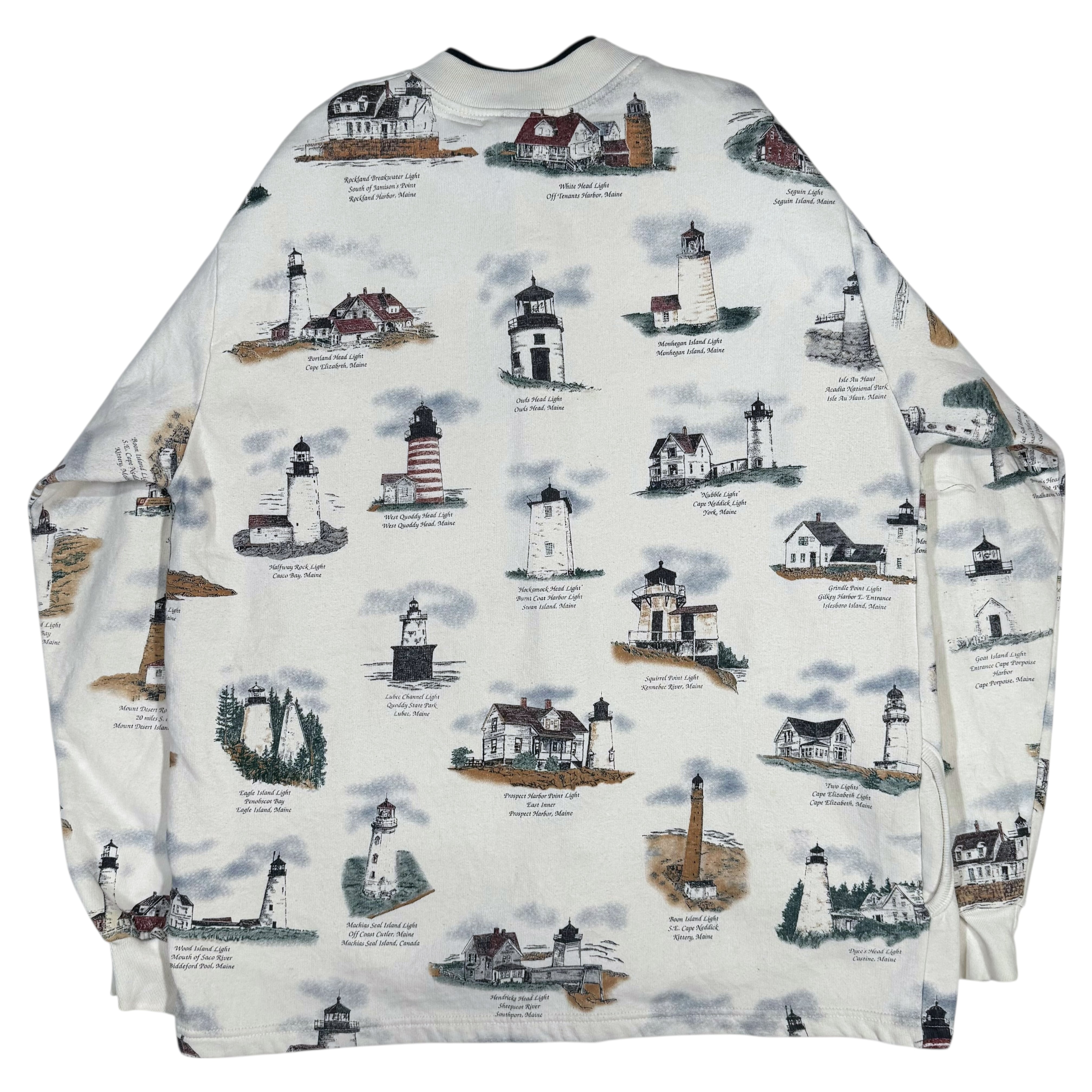 生成りベースの柔らかなボディに、アメリカ東海岸・メイン州周辺の灯台を描いたイラストが全面にプリントされた一着。Portland Head Light、White Head Light、West Quoddy Head Lightなど、アメリカ北東部の海岸を象徴する名所が描かれています。
