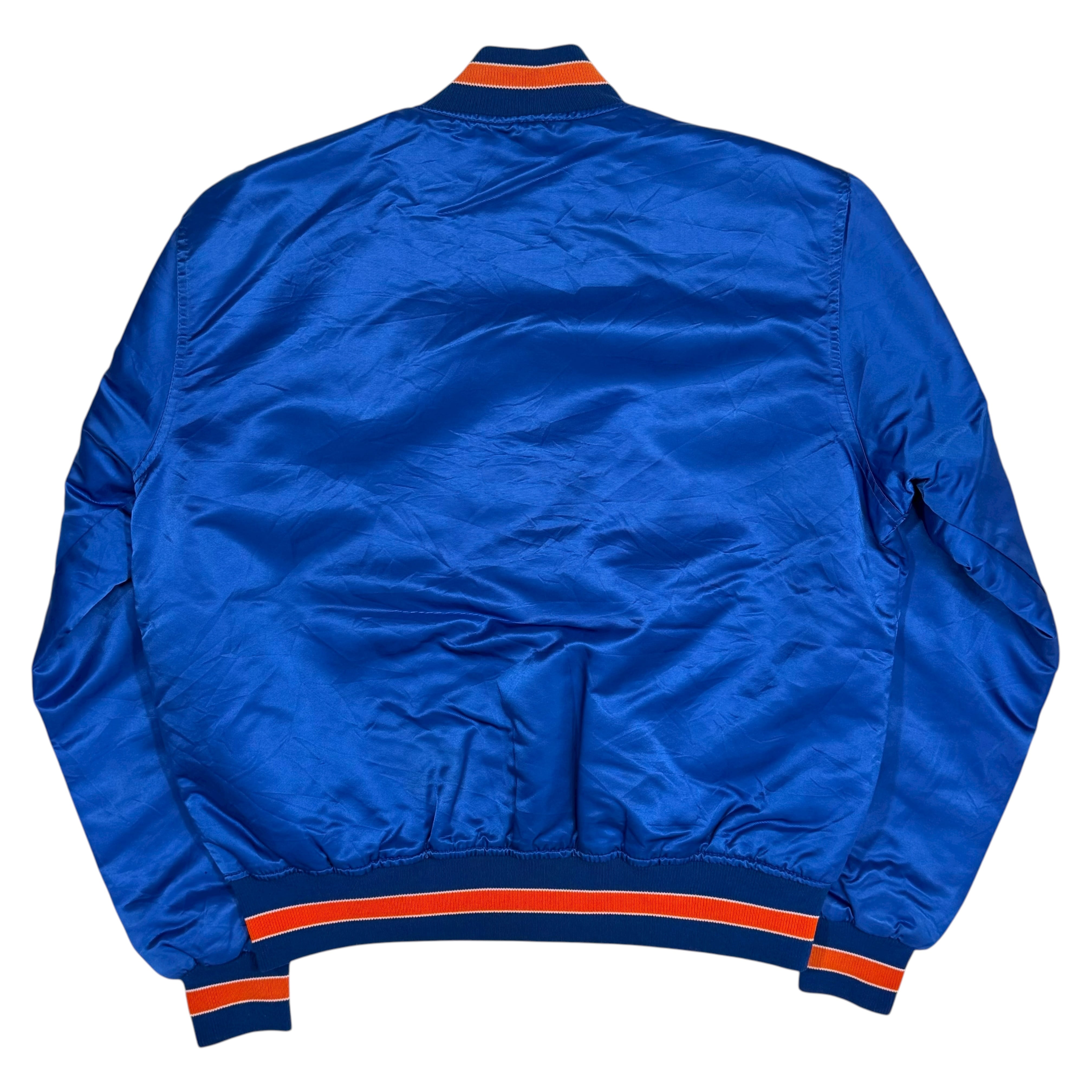 ロイヤルブルーのナイロンサテン系シェルに、胸はフェルトの“NY”ワッペン、左袖はスカイライン入りの円形Metsパッチ。フロントは同色塗装のスナップボタン、襟・袖口・裾はブルー×オレンジ×ホワイトのライン入りリブでまとまりの良い一枚。
