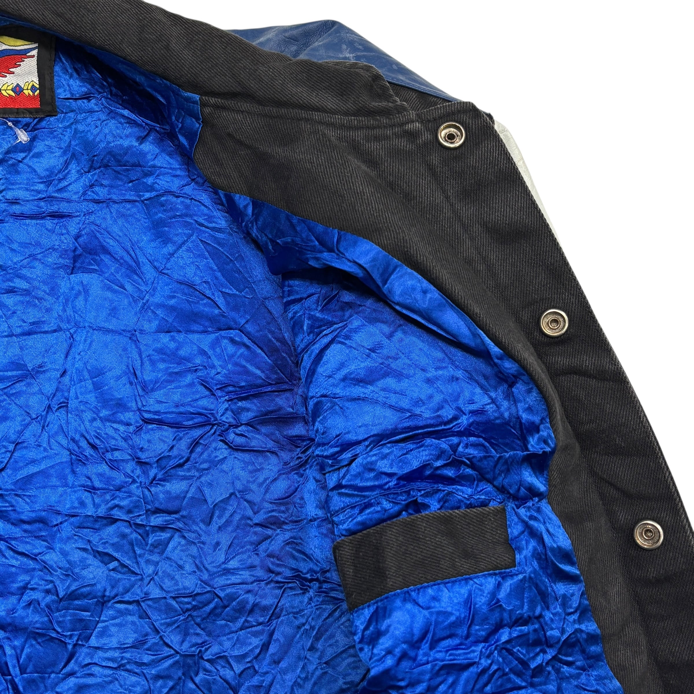 ブラックのデニムボディにブルー・レッド・ホワイトを切り替えた配色で、袖と襟裏はレザー切り替えになったデザイン。