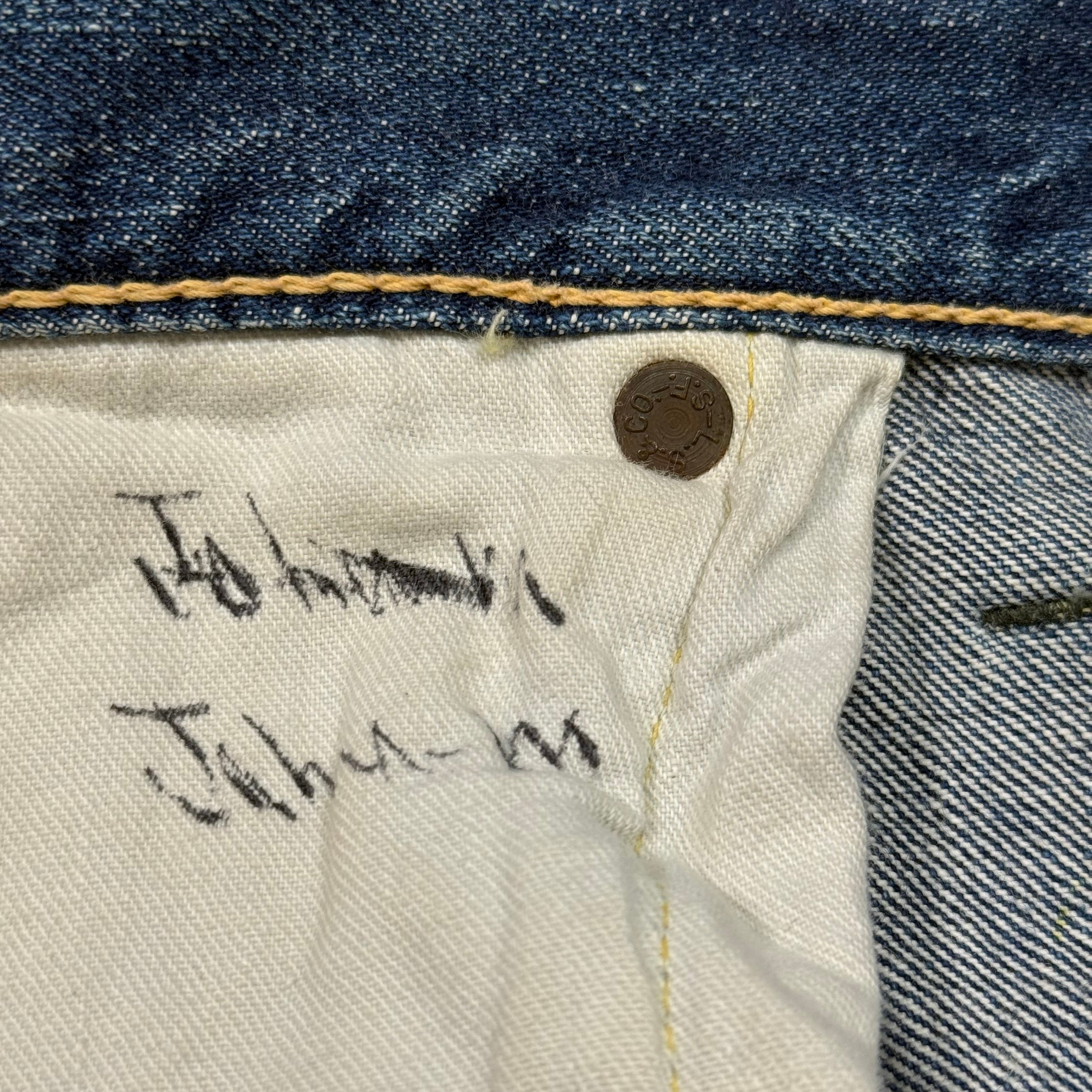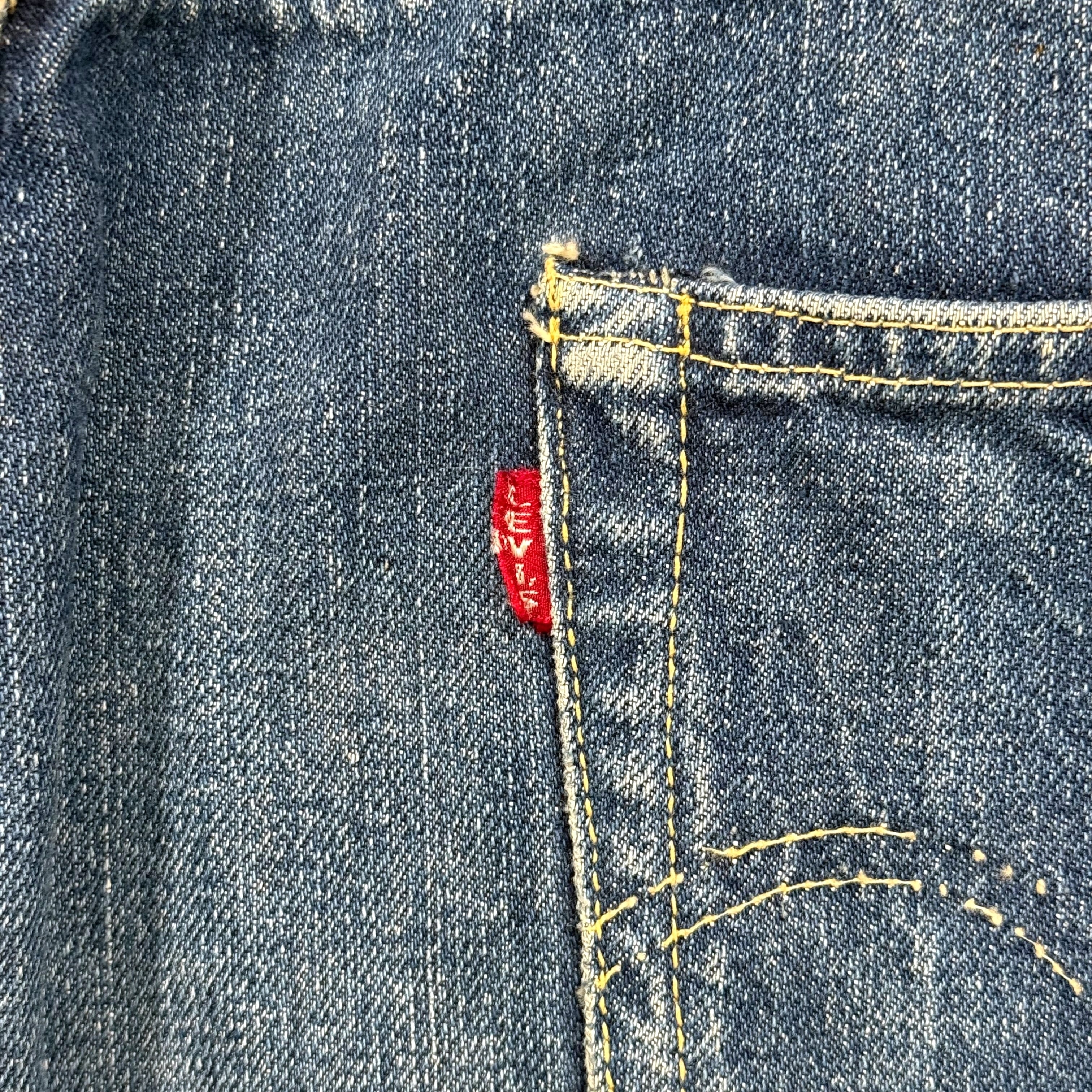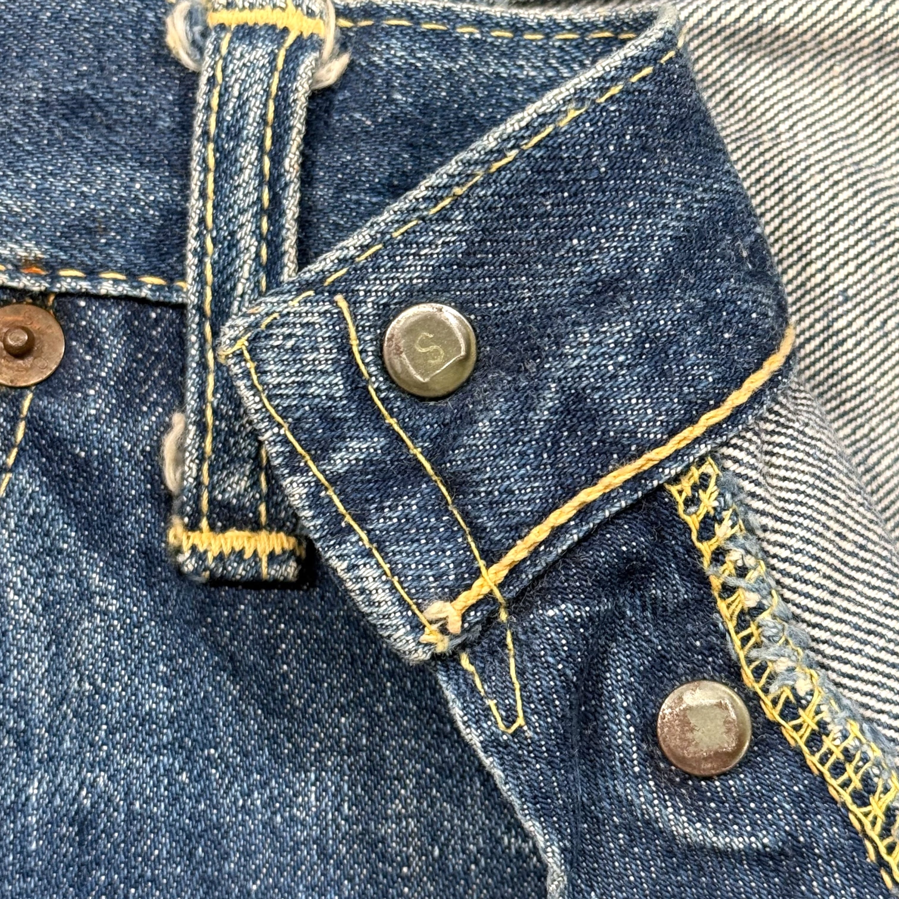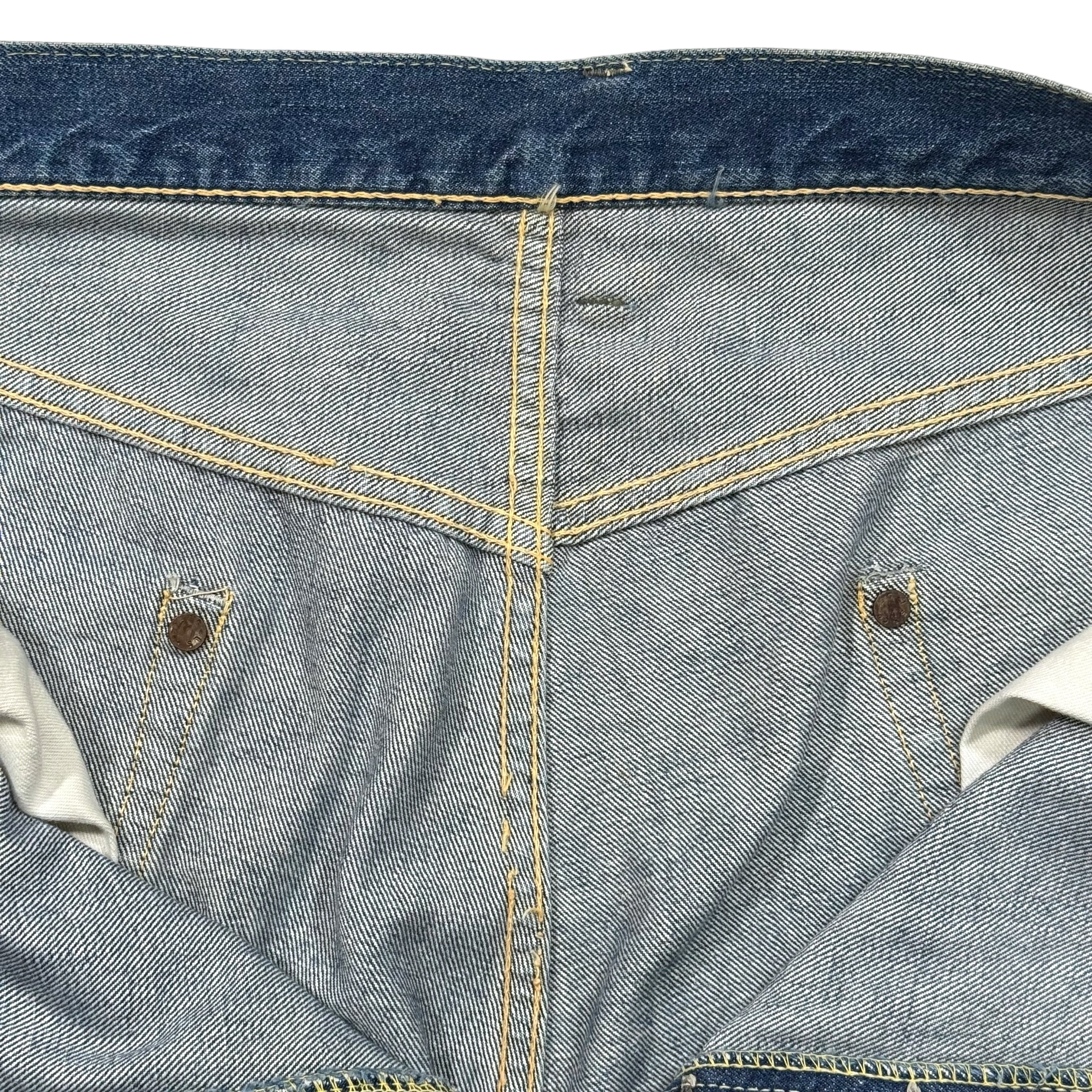 60’s頃の Levi’s 501XX、紙パッチ期の一本です。オフセットループにオールイエローステッチ、銅の隠しリベット、両面タブの均等V、トップボタンのV字ステッチ、ボタン裏刻印「S」、トップボタン以外は足長R、リベット裏に刻印無し。
