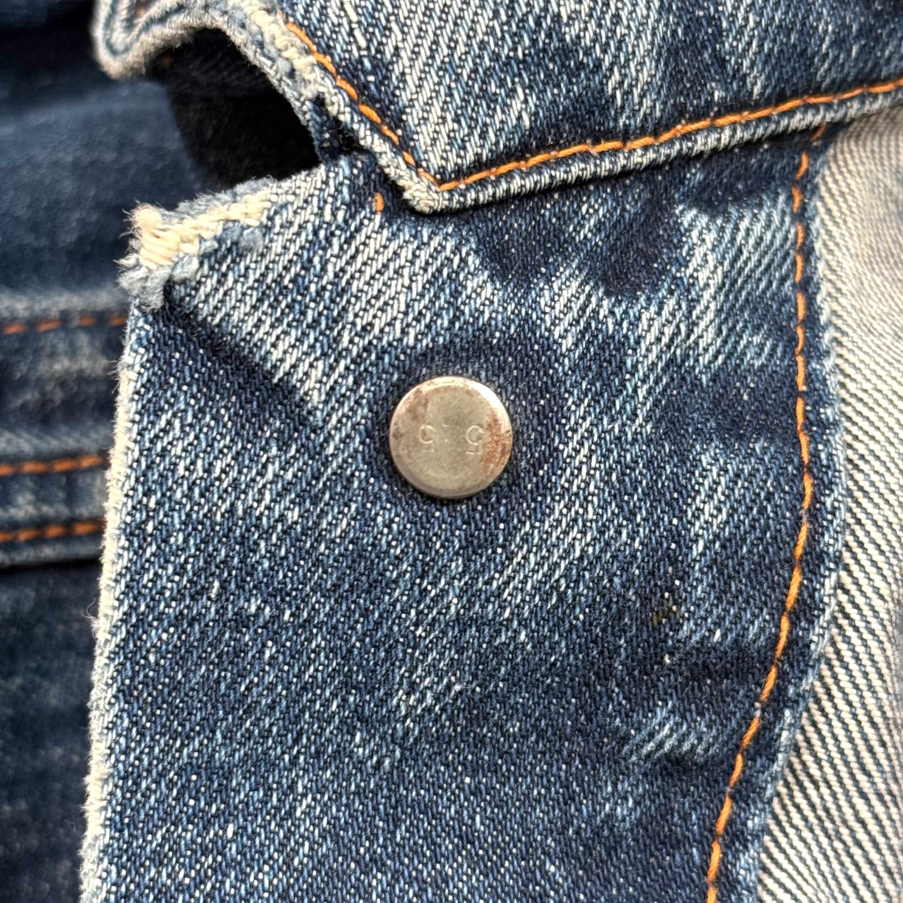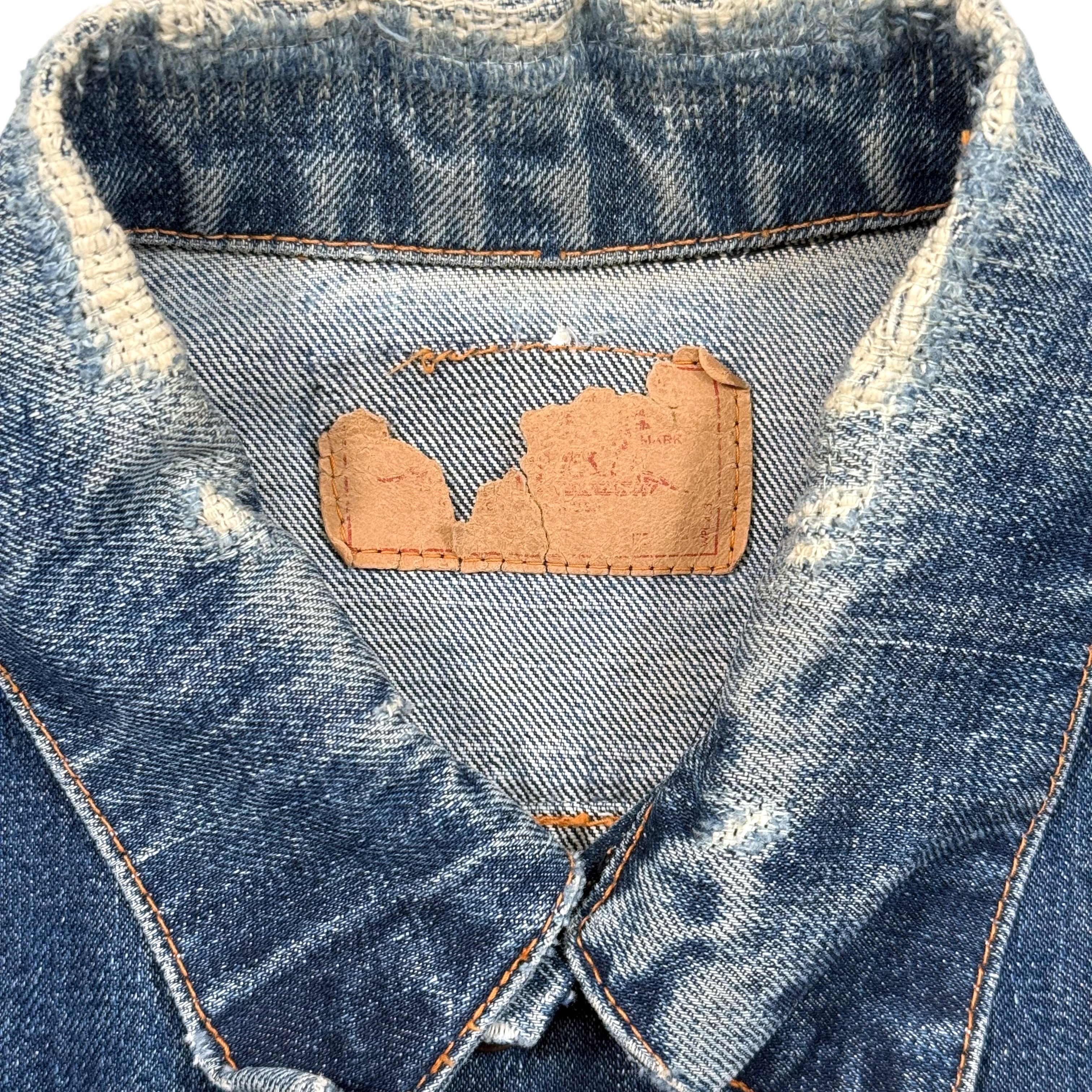 色はミドル〜やや濃いめのブルーで、ヨークまわりや前立て、ポケットフラップにしっかりしたアタリが出た一本。アームホールはカットオフされており、ステッチ残りやフリンジ感のあるほつれがいいラフさになっています。襟まわりには擦れ・小ダメージがありますが、致命的な破れはありません。