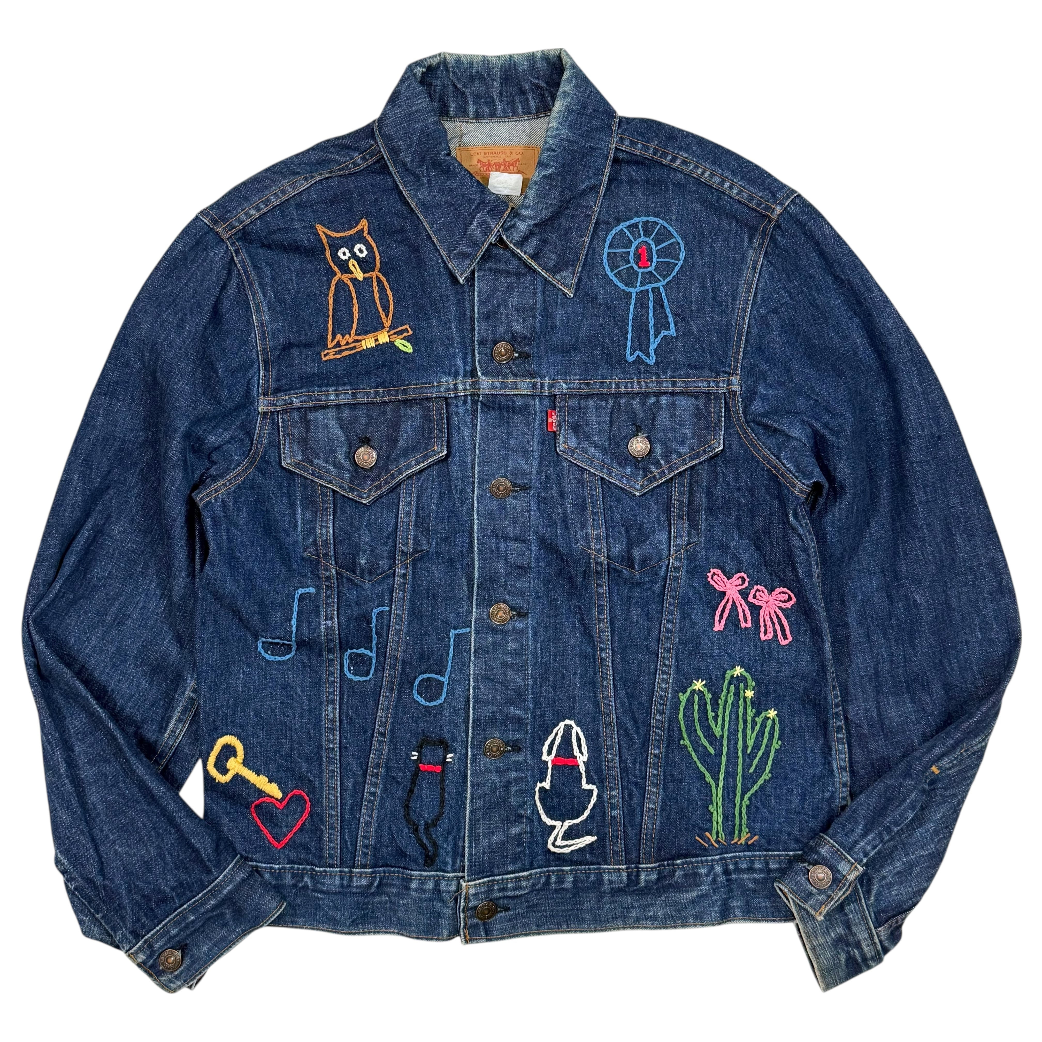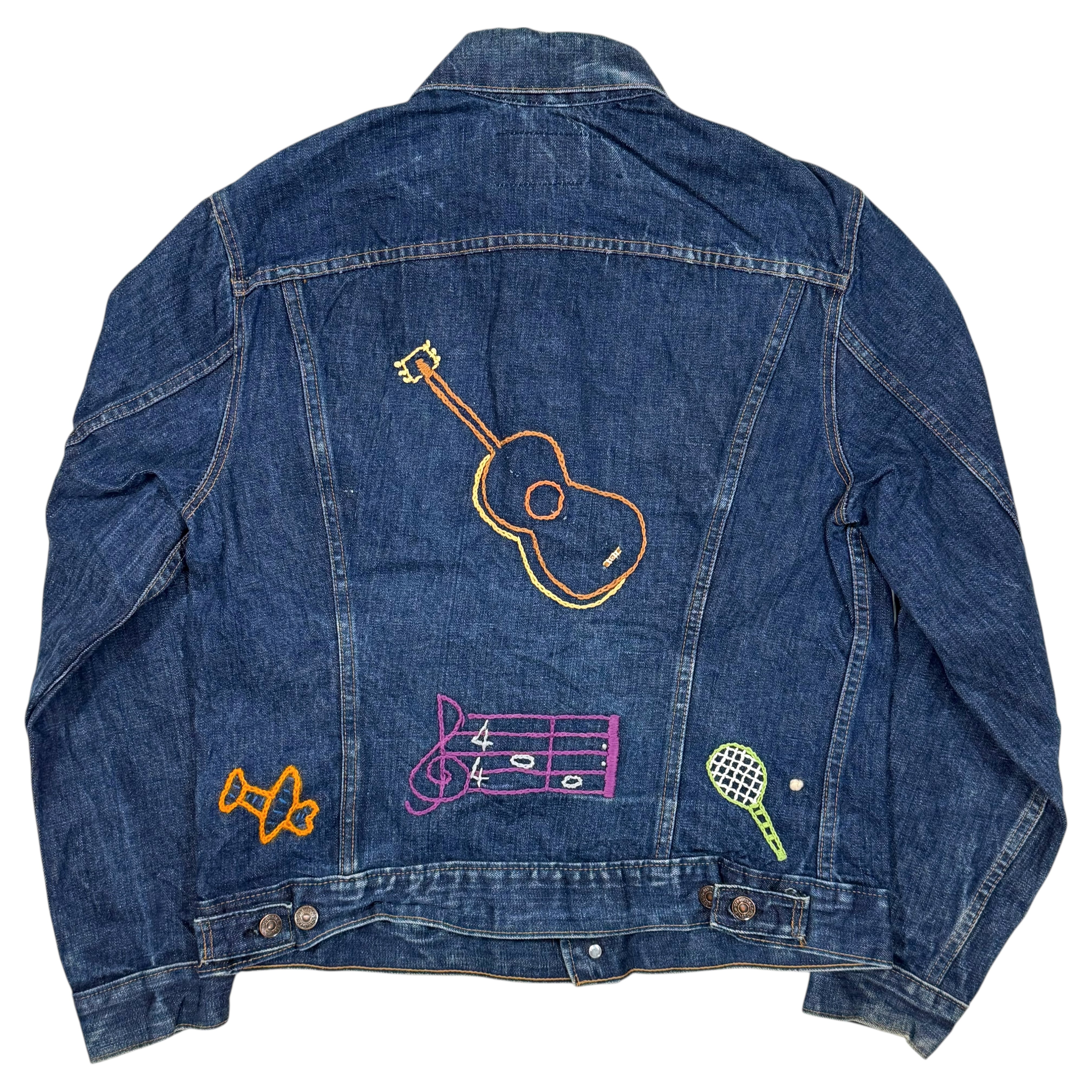 ベースになっているのは濃淡のコントラストがきれいに出たインディゴデニム。袖や身頃にかけて自然な色落ちが入りつつも、まだしっかり濃さの残ったコンディションです。その上からカラフルな糸でフクロウやリボン、サボテン、音符、ギター、ラケットなど、遊び心のあるモチーフが手縫いで散りばめられています。既製のワッペンではなく、1針ずつ入れられたラフなラインが良い意味で力の抜けた雰囲気を出してくれます。