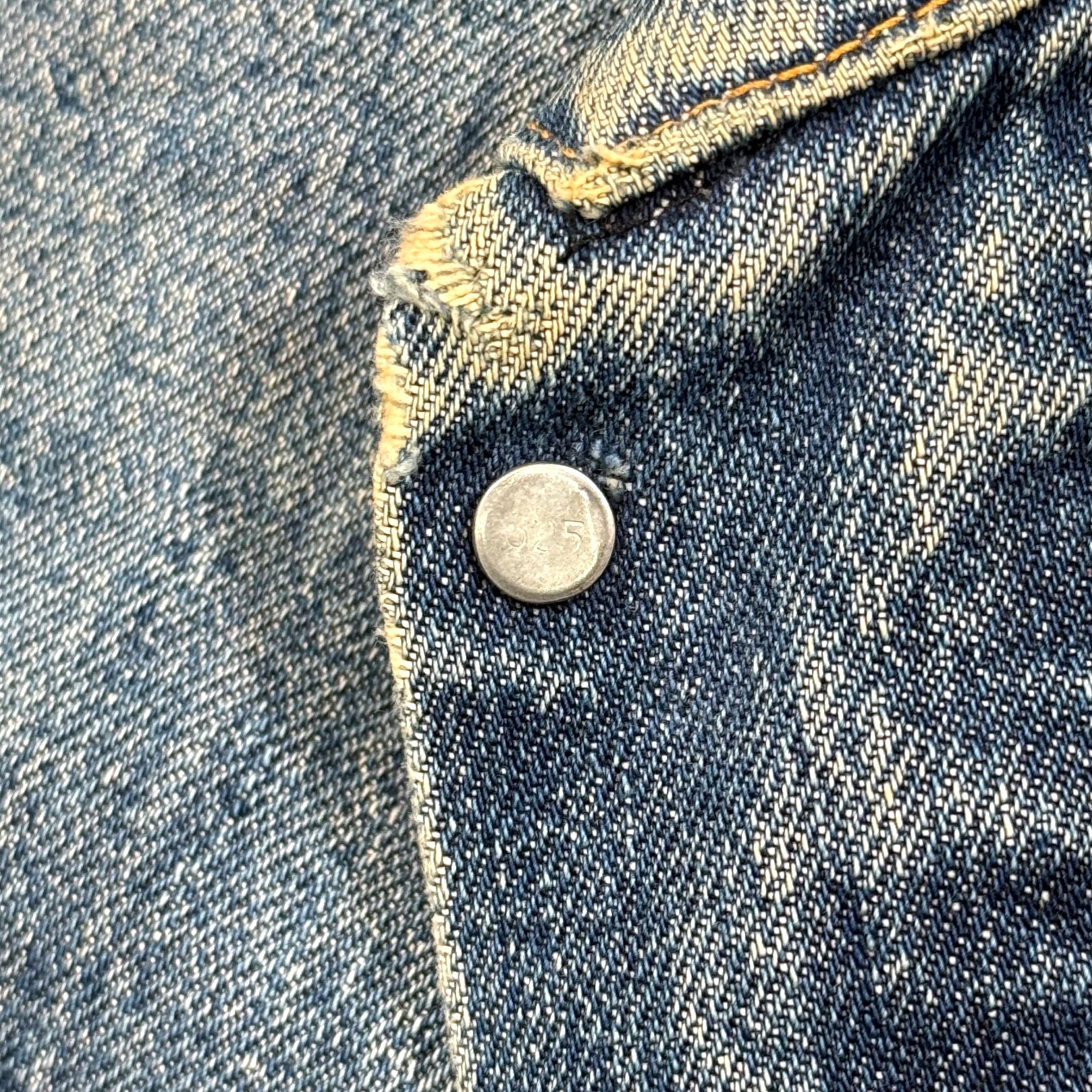 表地はインディゴデニムならではの色落ちがしっかり出ていて、肩や袖、前立て、ポケット口周りにかけてアタリが入り、縦落ちもよく出ています。