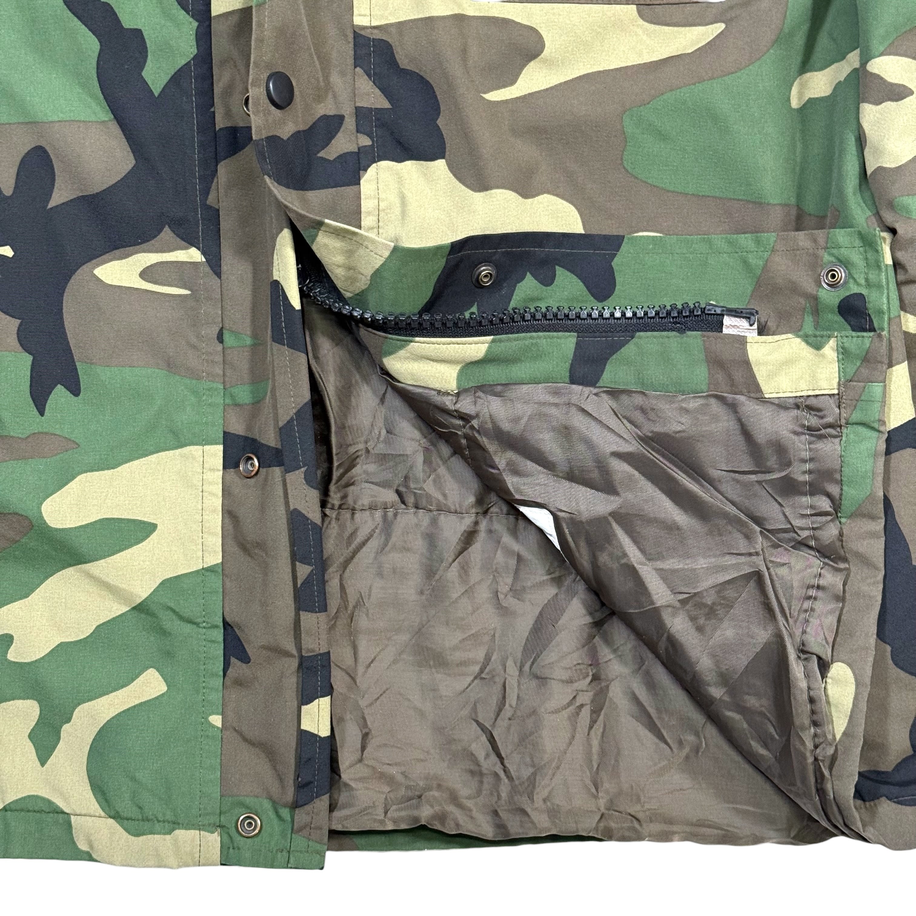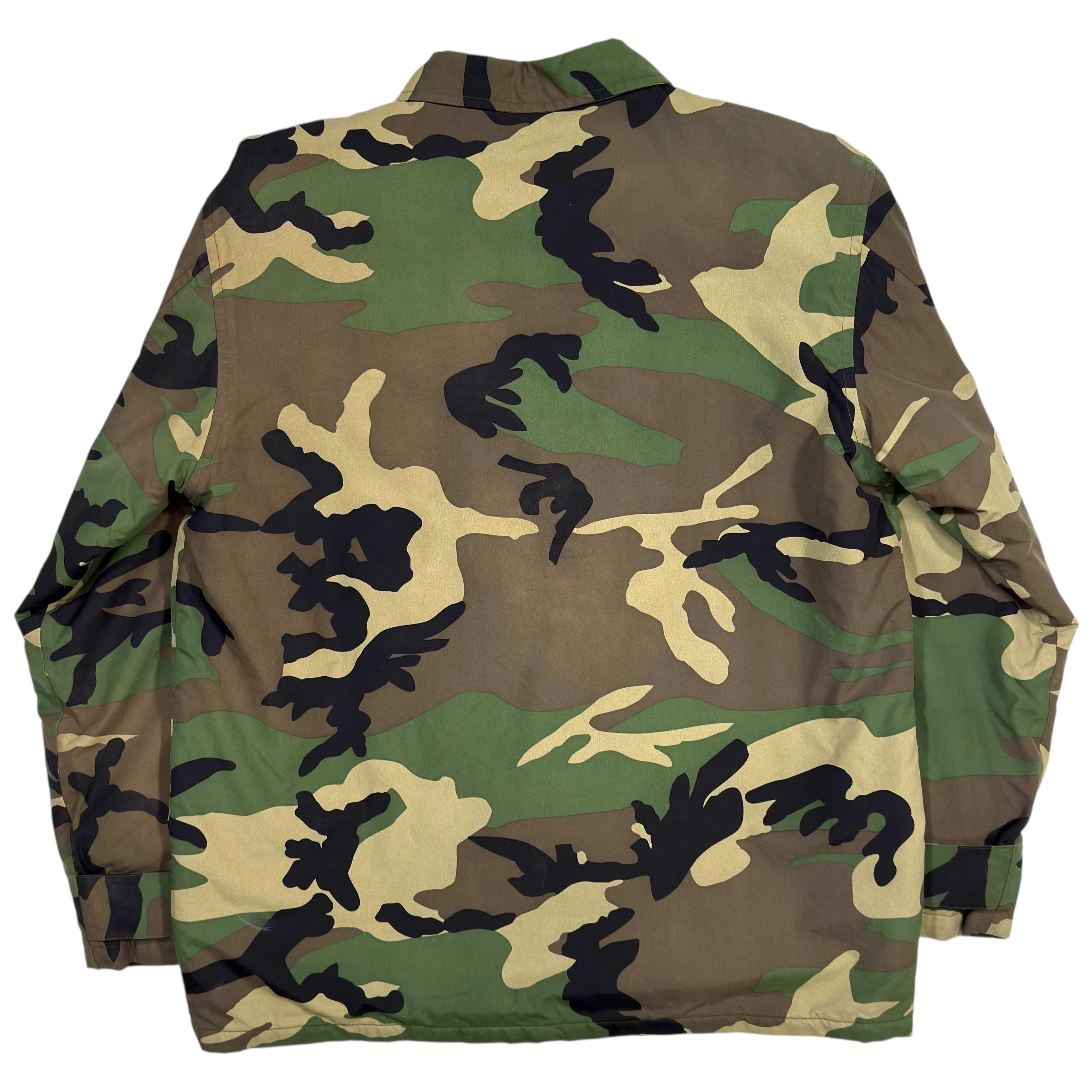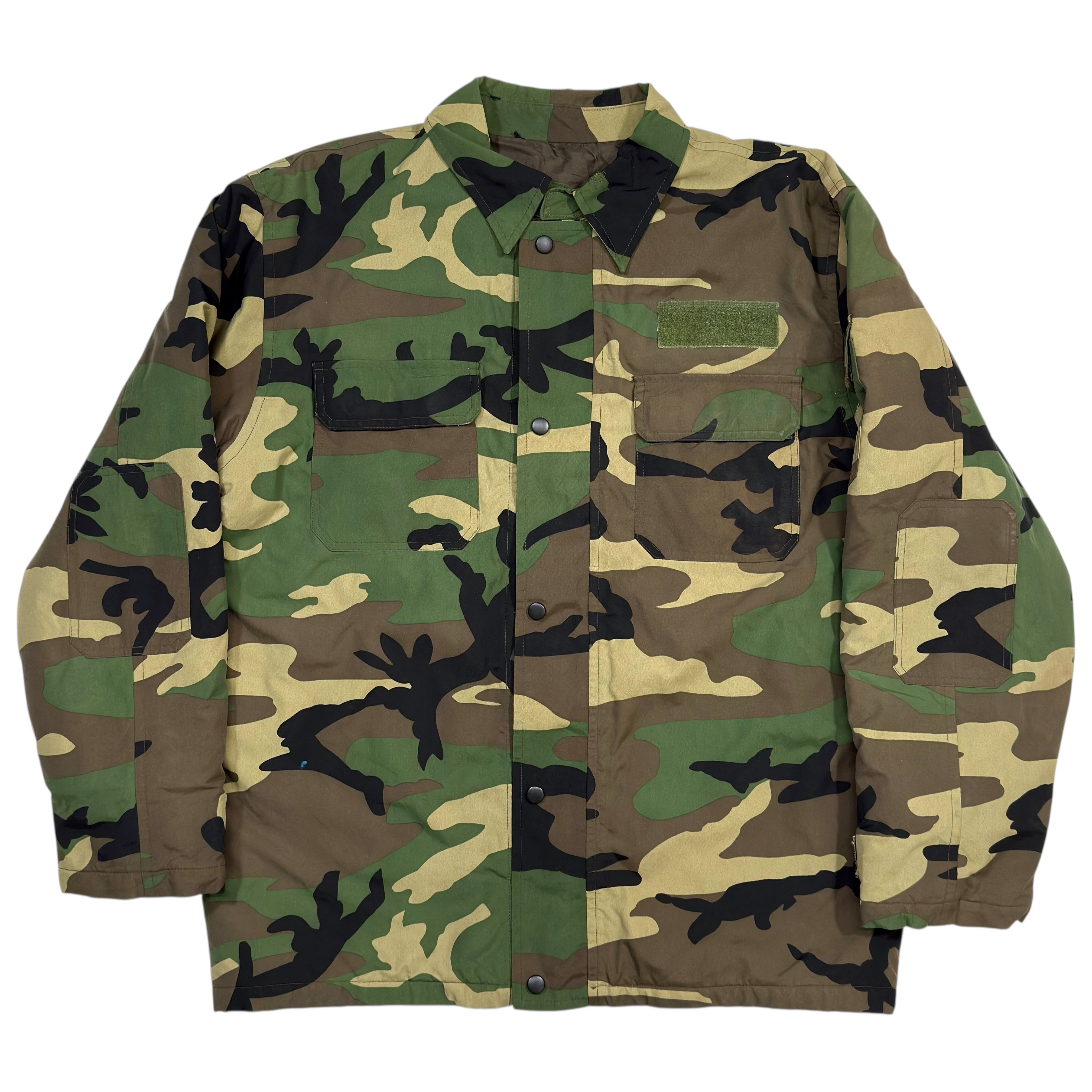 ウッドランドカモ柄の中綿入りフィールドジャケット。シャツカラーにスナップボタンフロントのつくりで、BDUシャツとアウターの中間くらいのバランスで着られる一枚です。