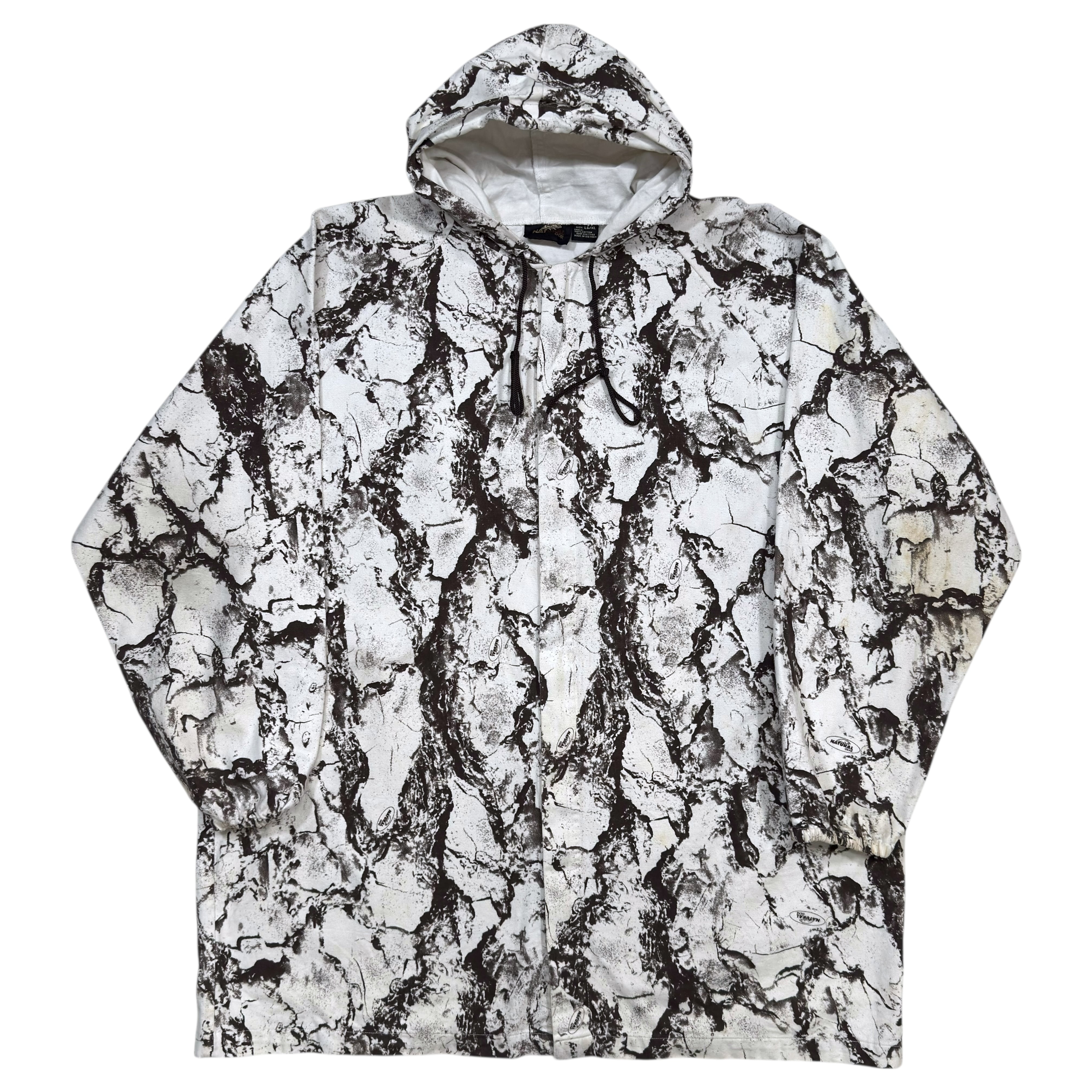 Natural Gearのスノーツリーバークカモフーディパーカ。白ベースに、ひび割れた樹皮みたいなフォトカモプリントが全面に入った一枚です。リアルツリー系の中でも少し無機質な柄で、ミリタリーとストリートの中間くらいのムードで着られます。