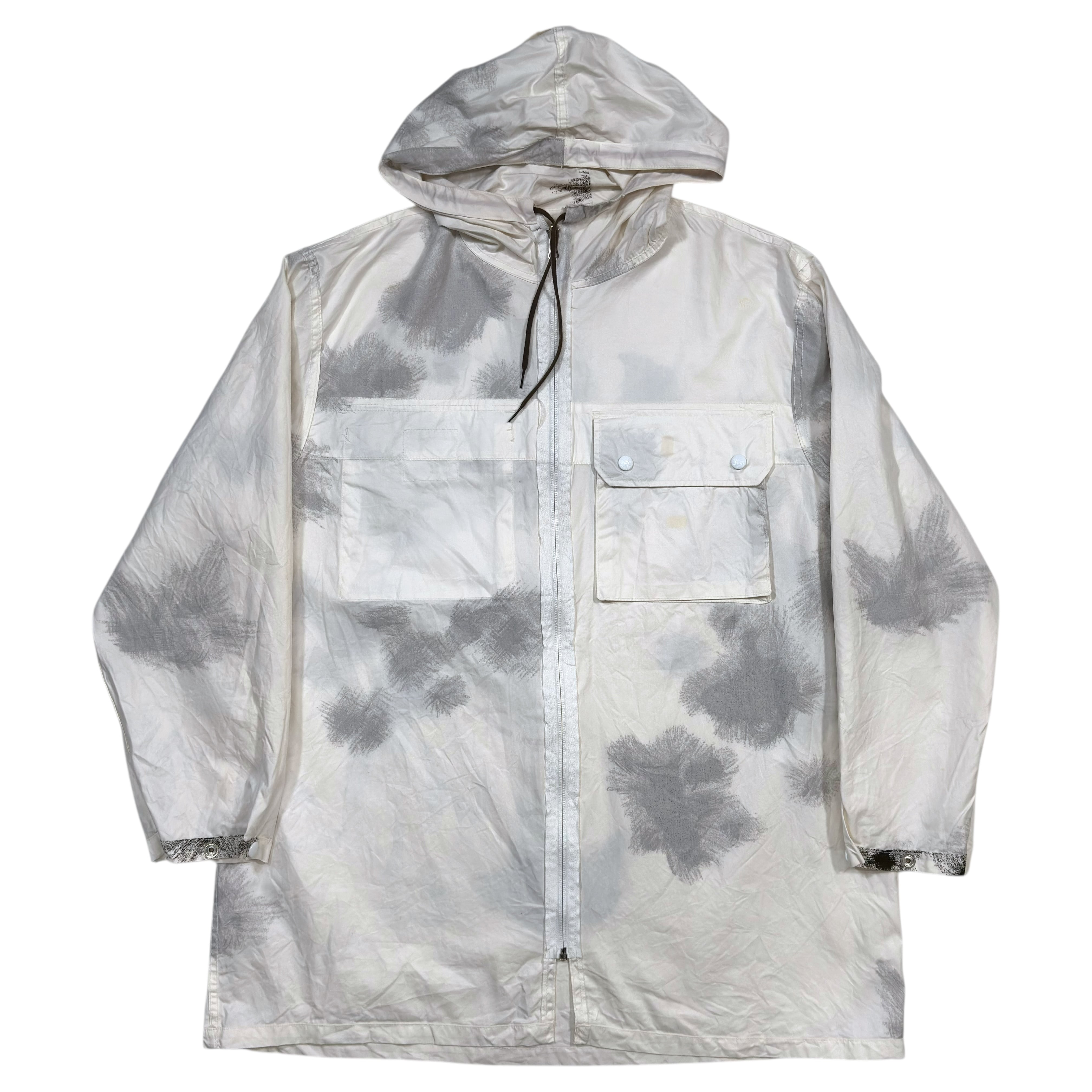 雪上でのカモフラージュ用オーバーパーカらしく、白地にブラシで掃いたようなスモークカモ柄が全面にプリントされています。