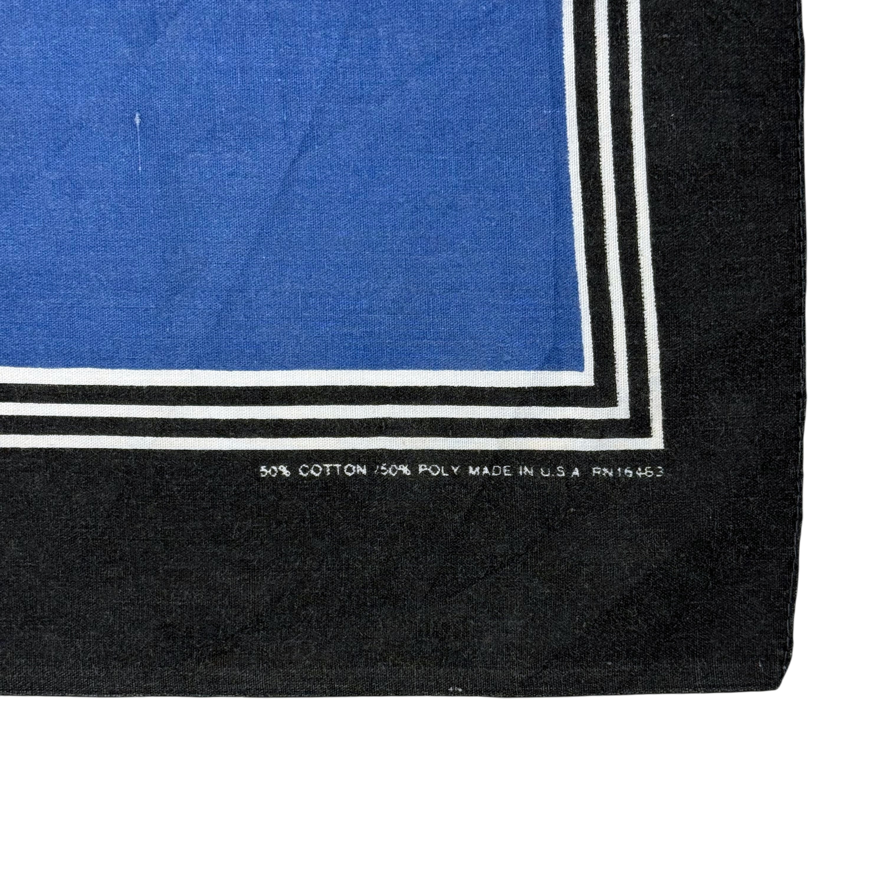 真ん中に咆哮するタイガーの顔が入ったバンダナ。ブラック×ブルーの配色にホワイトのフレームライン、その中にオレンジのトラが乗るデザイン。バッグに結んでも、壁に飾っても存在感を出してくれます。