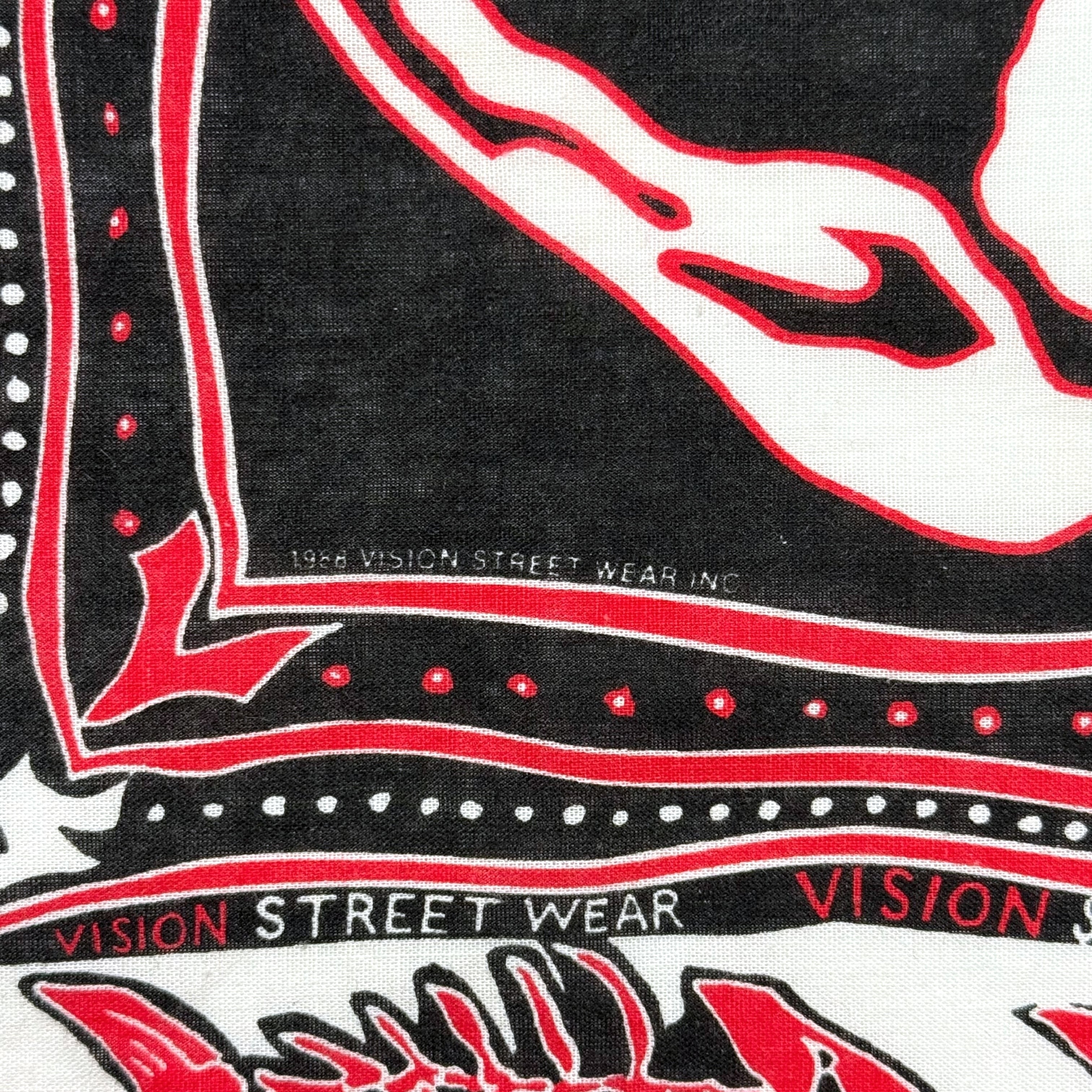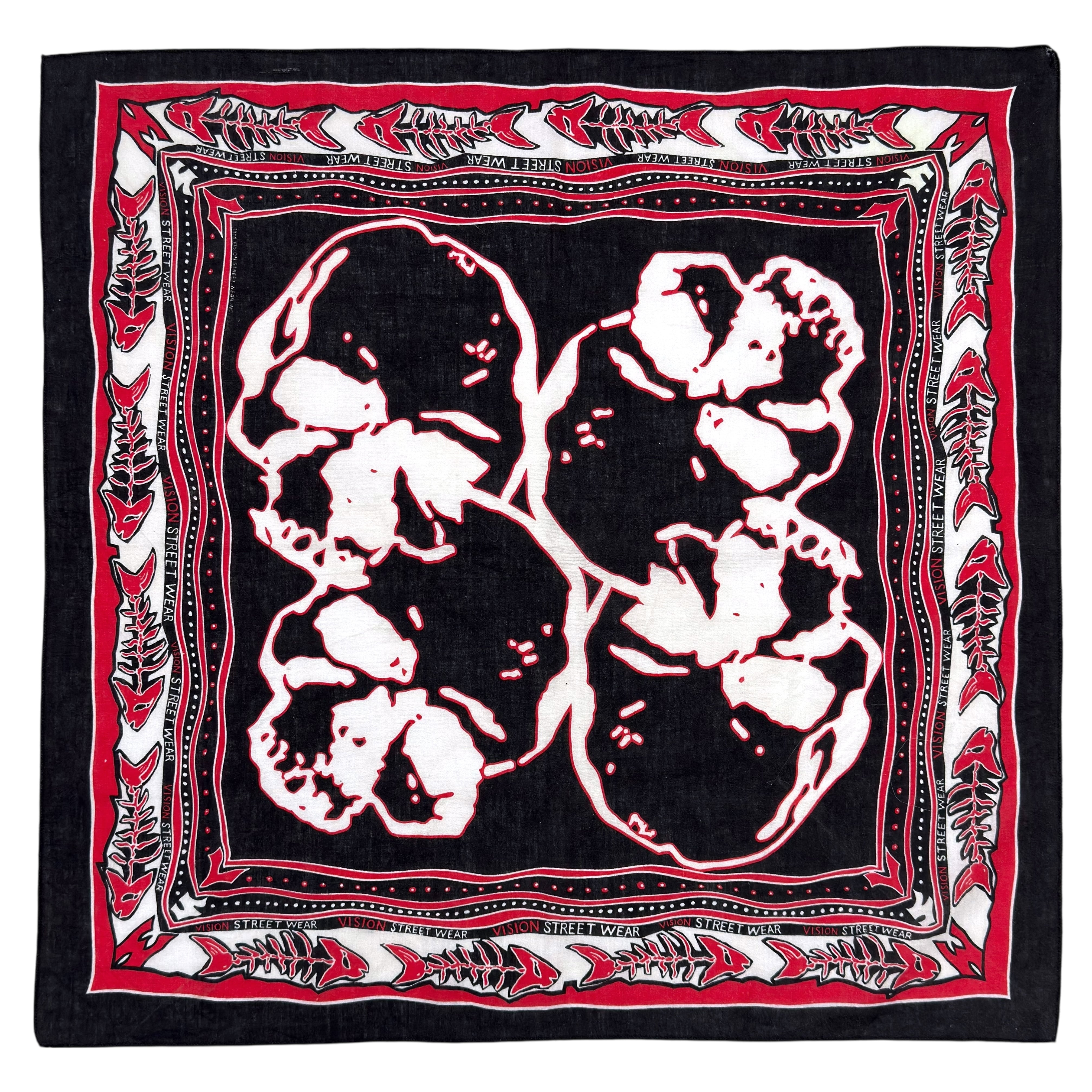 ブラック×レッドの配色で、中心にはスカルを4面に配置。縁には魚骨モチーフとVision Street Wearのロゴが連なるデザイン。