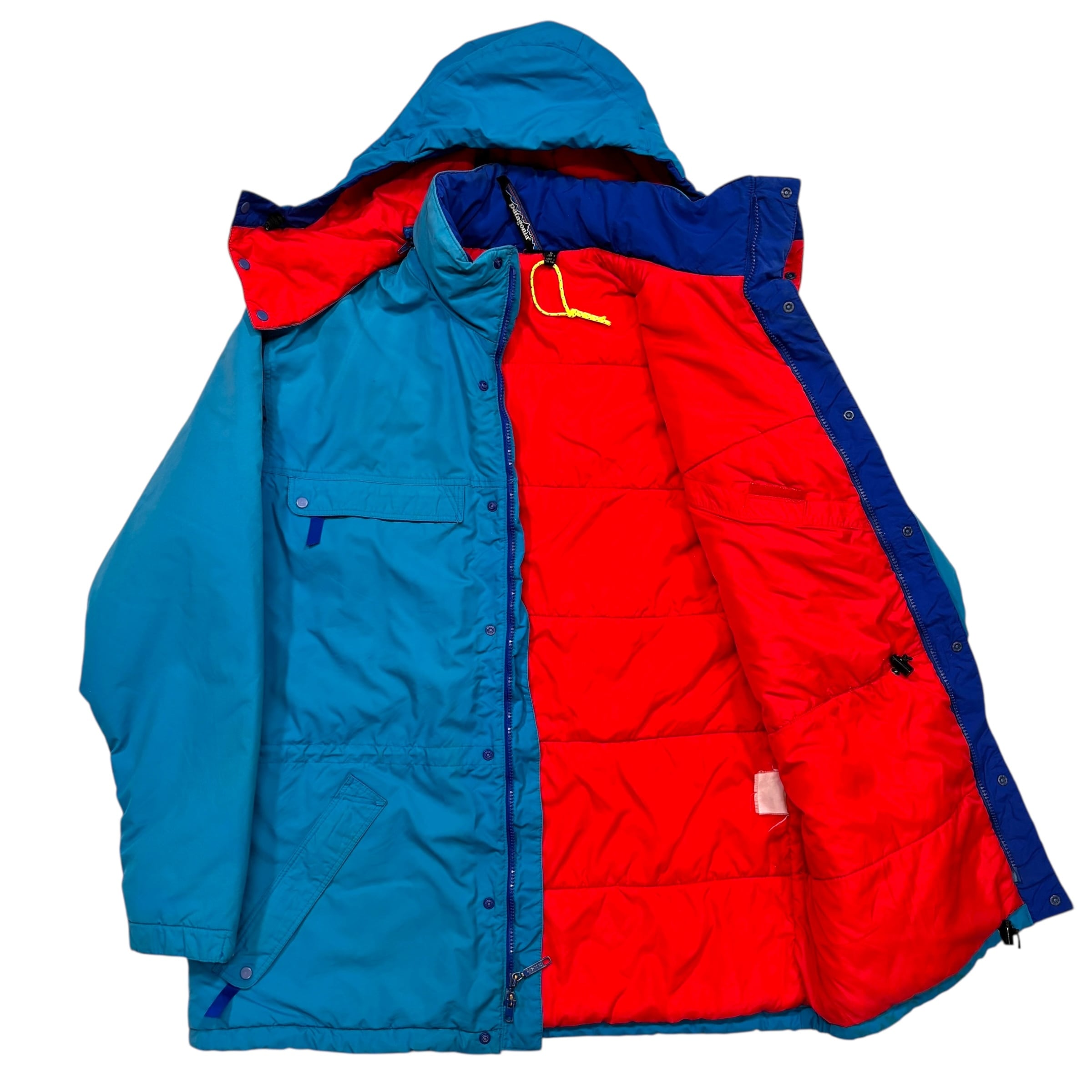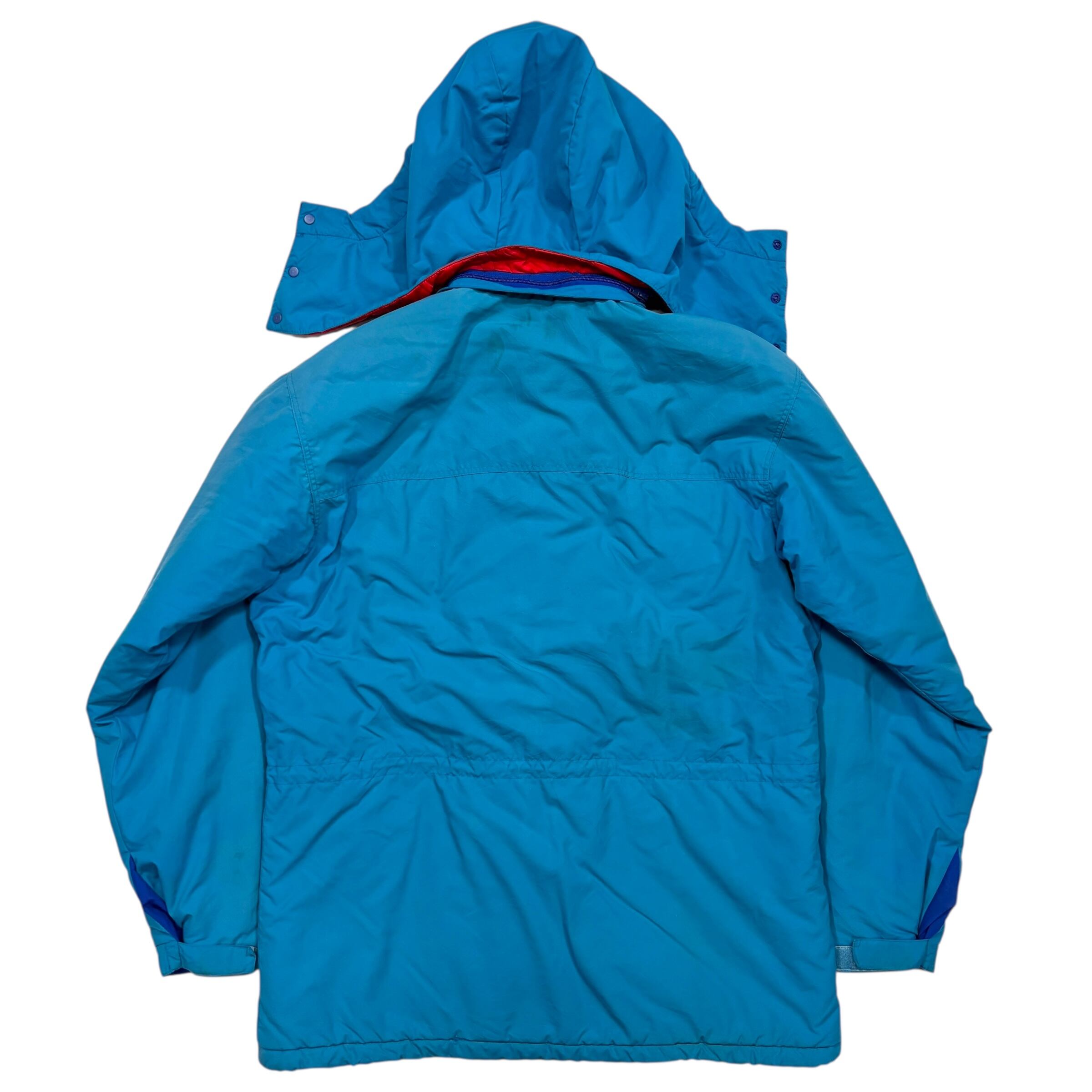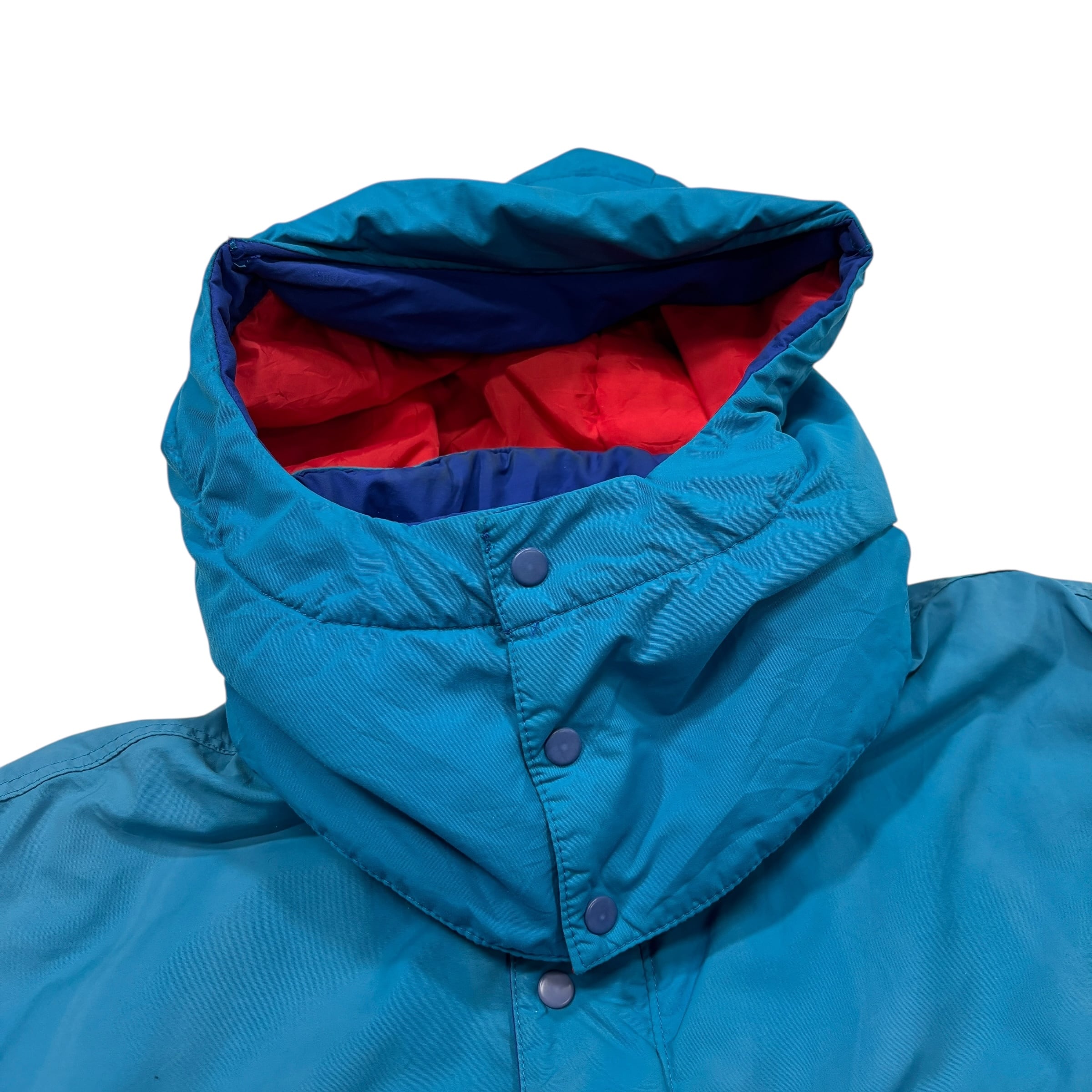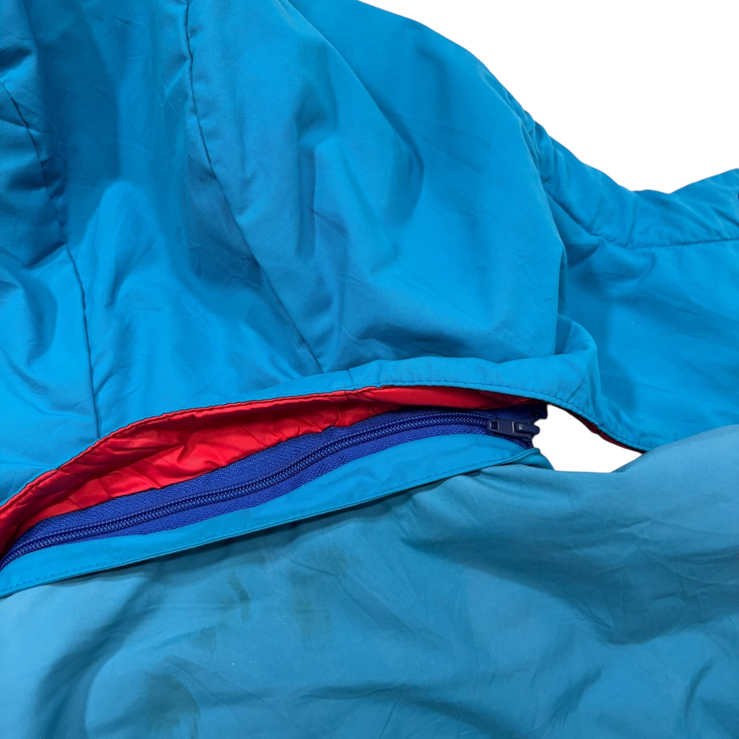 ターコイズにレッド、裏地のブルーが重なる、この年代らしいパタゴニアの配色センスが光る一着。薄中綿入りで実用面のバランスもグッド◎