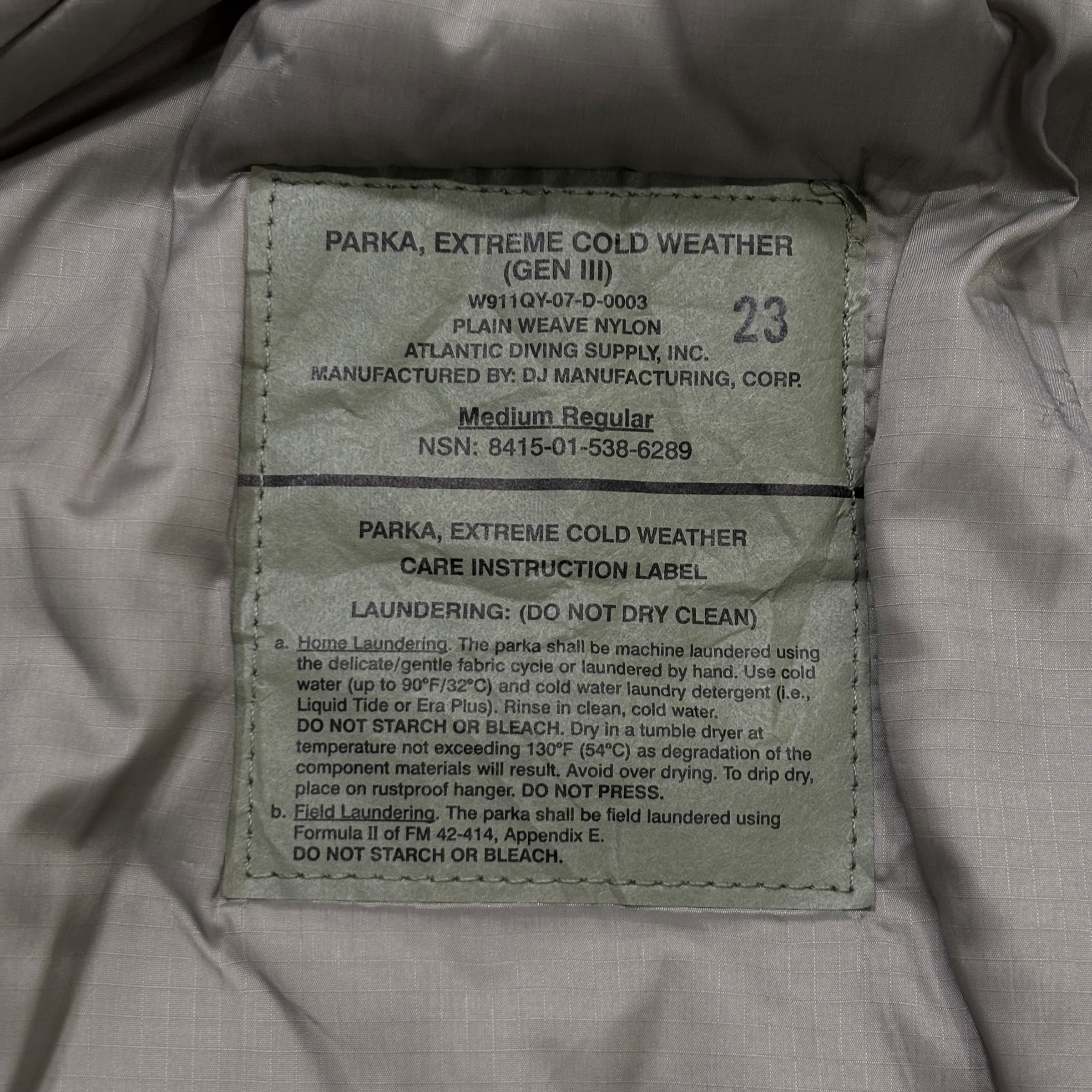 高機能中綿素材"PRIMALOFT"が使用され、アメリカ軍の寒冷地被服システムの第三世代において、7段階中最高レベルに位置することを意味するECWCS Gen3 Level7のジャケット。中綿はPRIMALOFT(米国ALBANY社がU.S.Armyのためにスリーピングバッグの中綿として開発した、ダウンの約8倍の暖かさがあると言われているポリエステルを使用したハイテク素材)を使用。ダウンウェアと違い、羽がとびだしたり手入れに手間がかかる事がなく洗濯機で洗えて軽量でやわらかな風合いが特徴です。フードは襟に収納型で、肘に補強入りです。新型米陸軍 ECWCS GENERATION3とは7種類のトップスと5種類のボトムから構成された、様々な気候やシチュエーションに対応したシステムの事を指し、このLevel 7はレイヤリング最終防寒アウターとして作製されています。