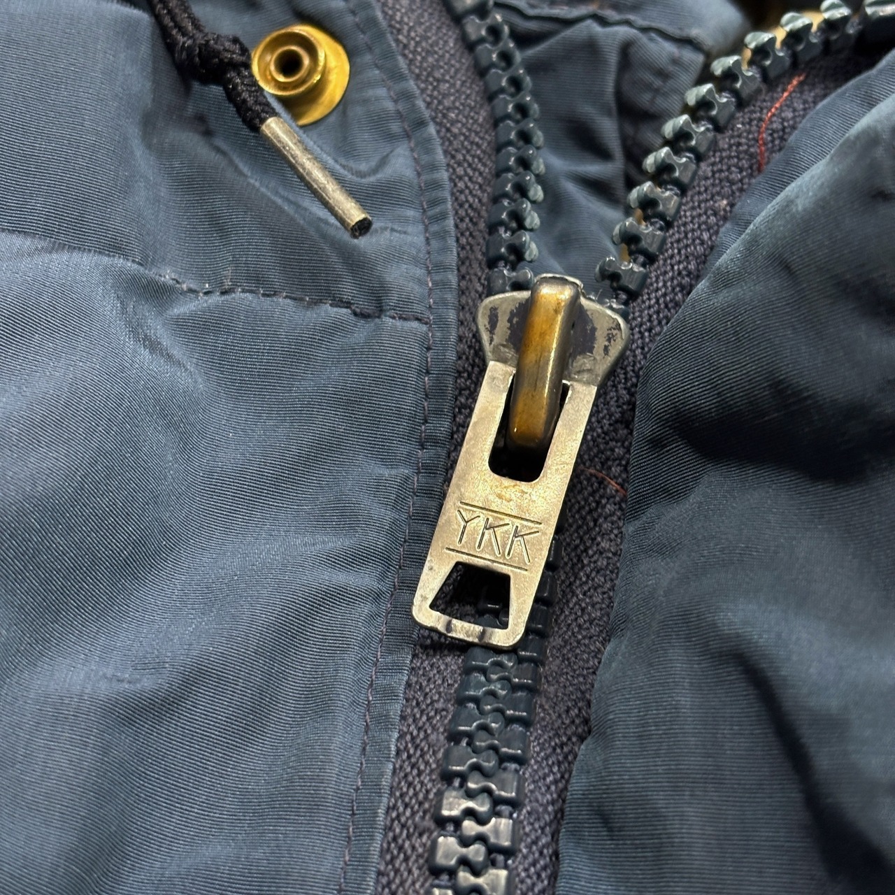 裏地はリップストップナイロン仕様、刻印入りのスナップボタンなど、抜け目のない作り込み。フロントはダブルジップ仕様。