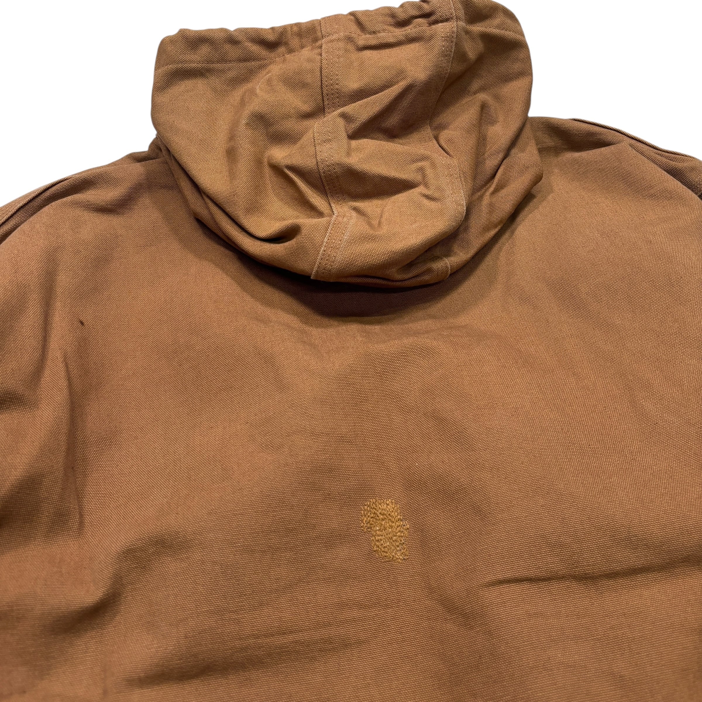 フード、袖口・裾のリブが風を防ぎつつ、全体的にゆったりめのシルエットでストリートに馴染むバランス。