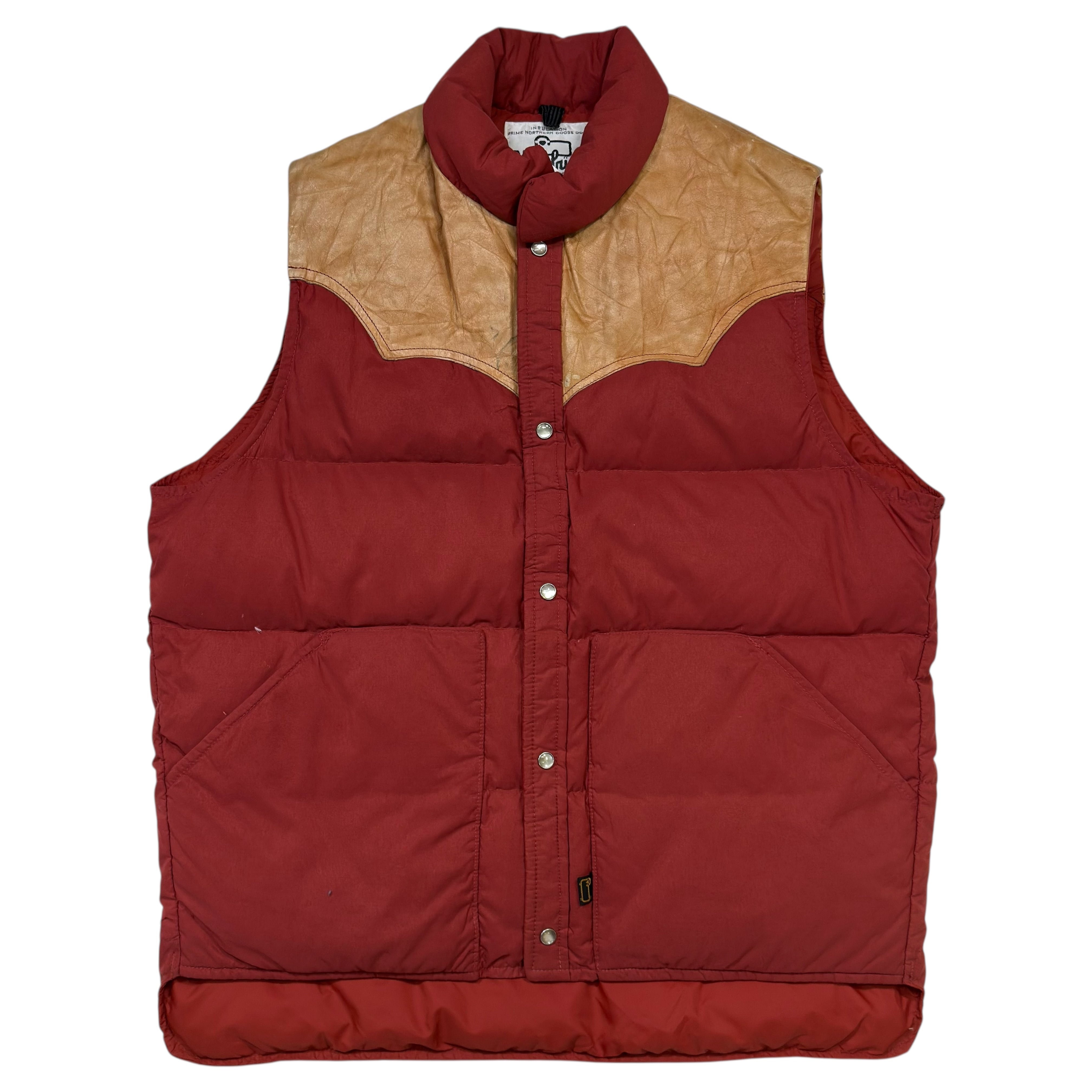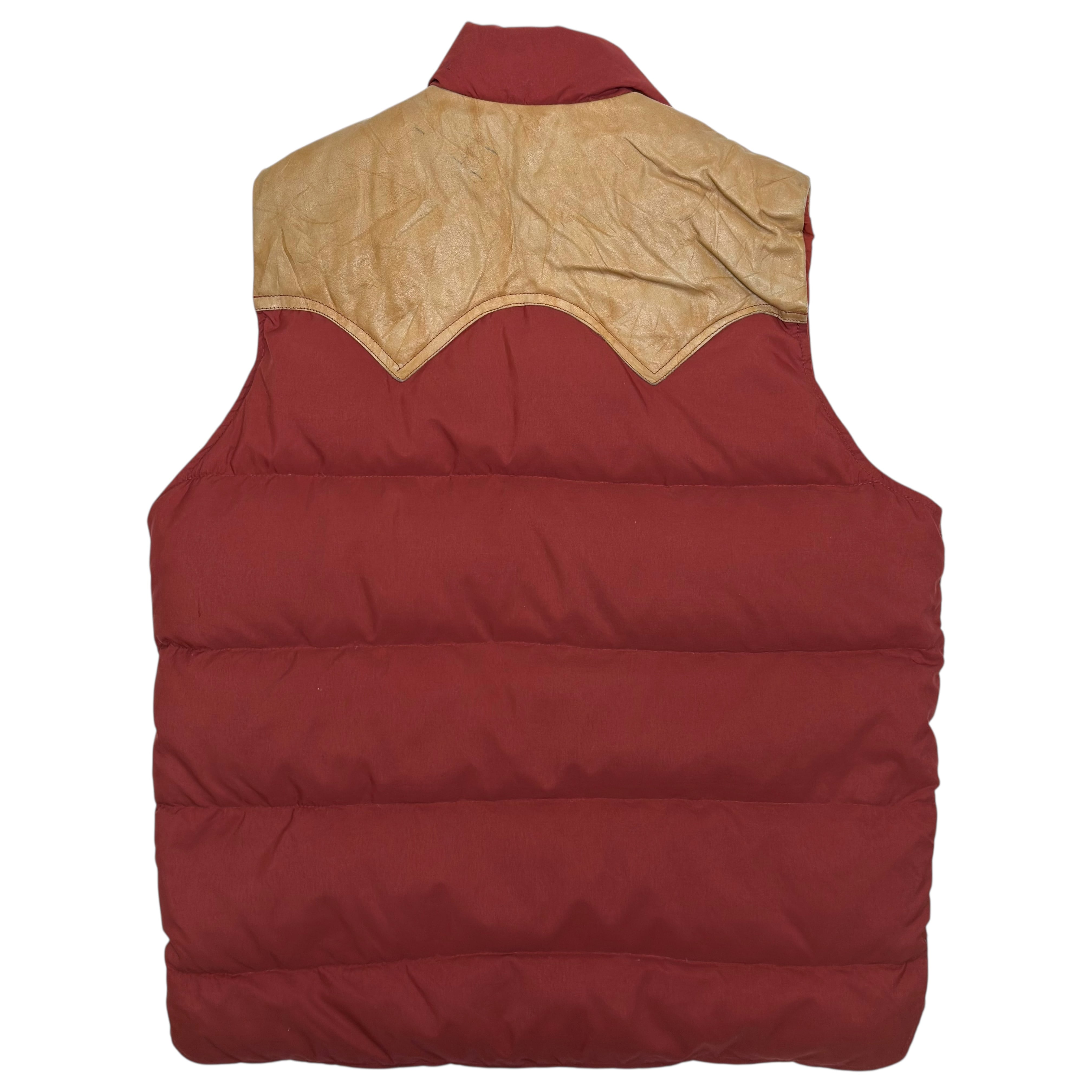 肩から胸にかけてのヨーク部分には本革を使用した、ウエスタンモチーフのダウンベスト。