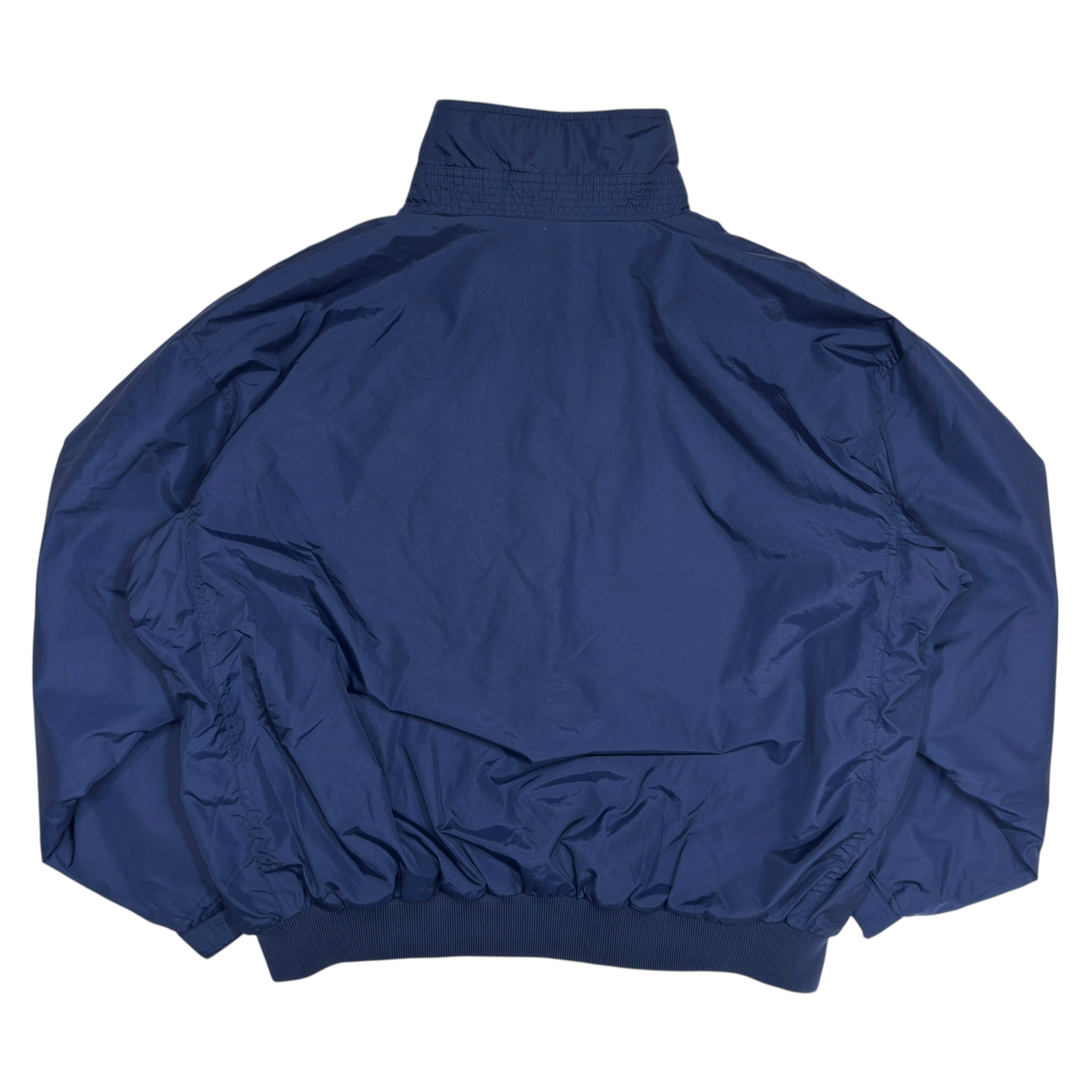 落ち着いたネイビーのシェルに、内側はブルーグレー系のフリースライニング、胸のロゴは控えめなワンポイント、背中は無地。フルジップ+立ち襟仕様で、両サイドにポケット。袖口はゴム、裾はリブなので風が入りにくく、着たときに裾が溜まるバランスになりやすいタイプです。