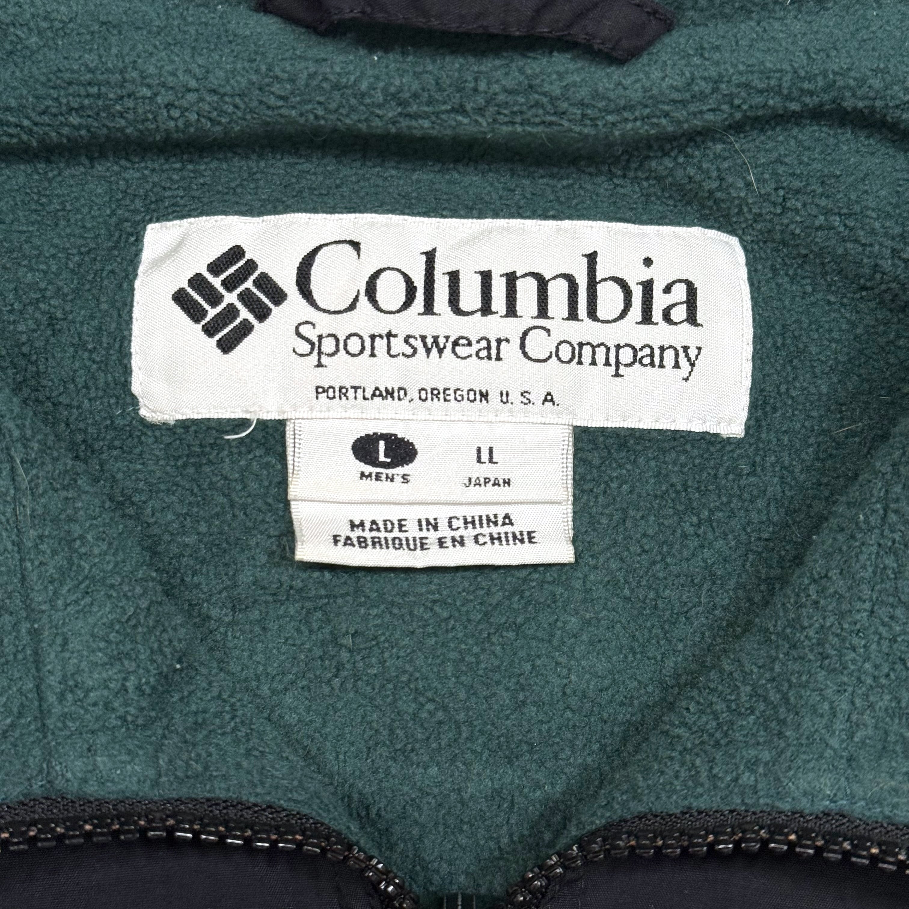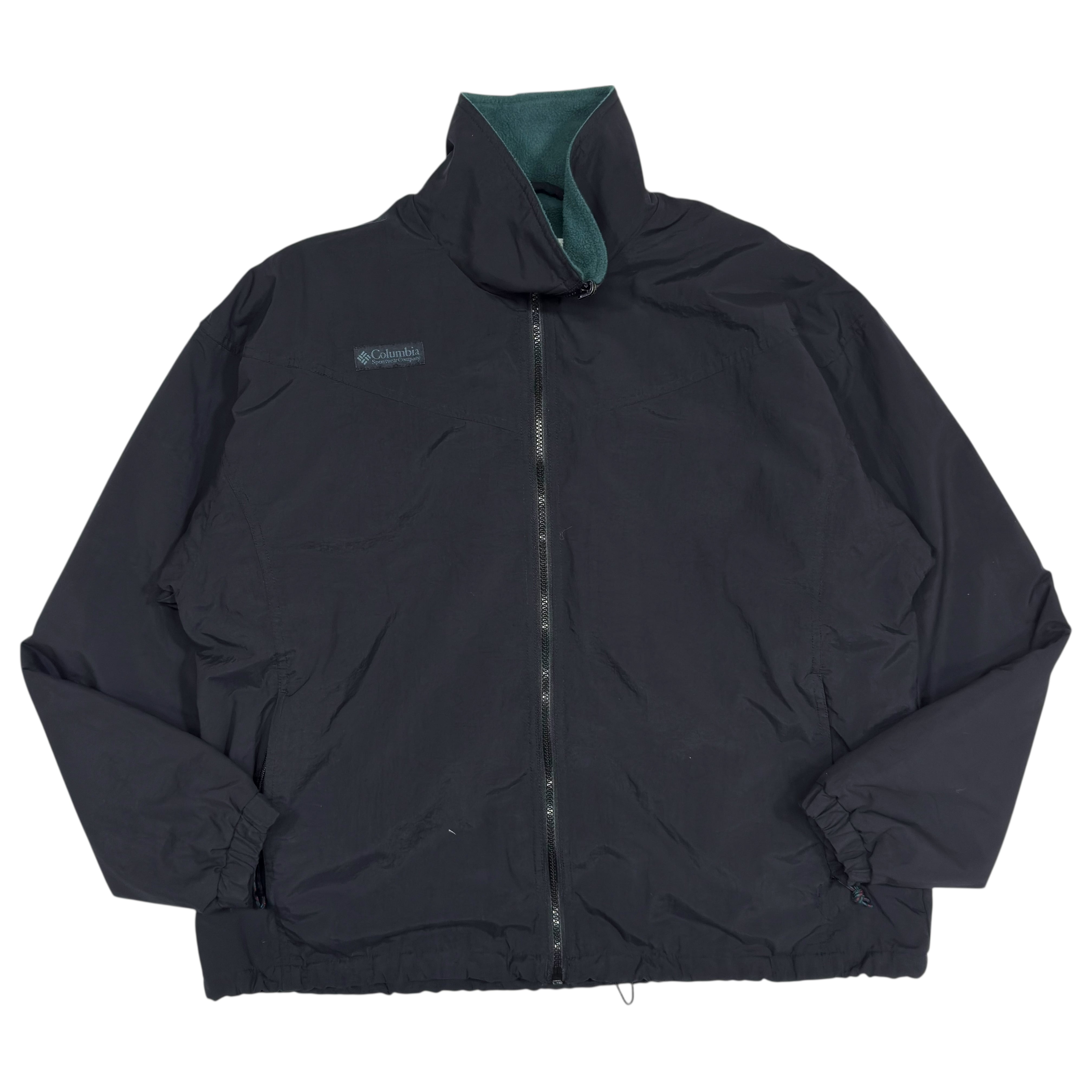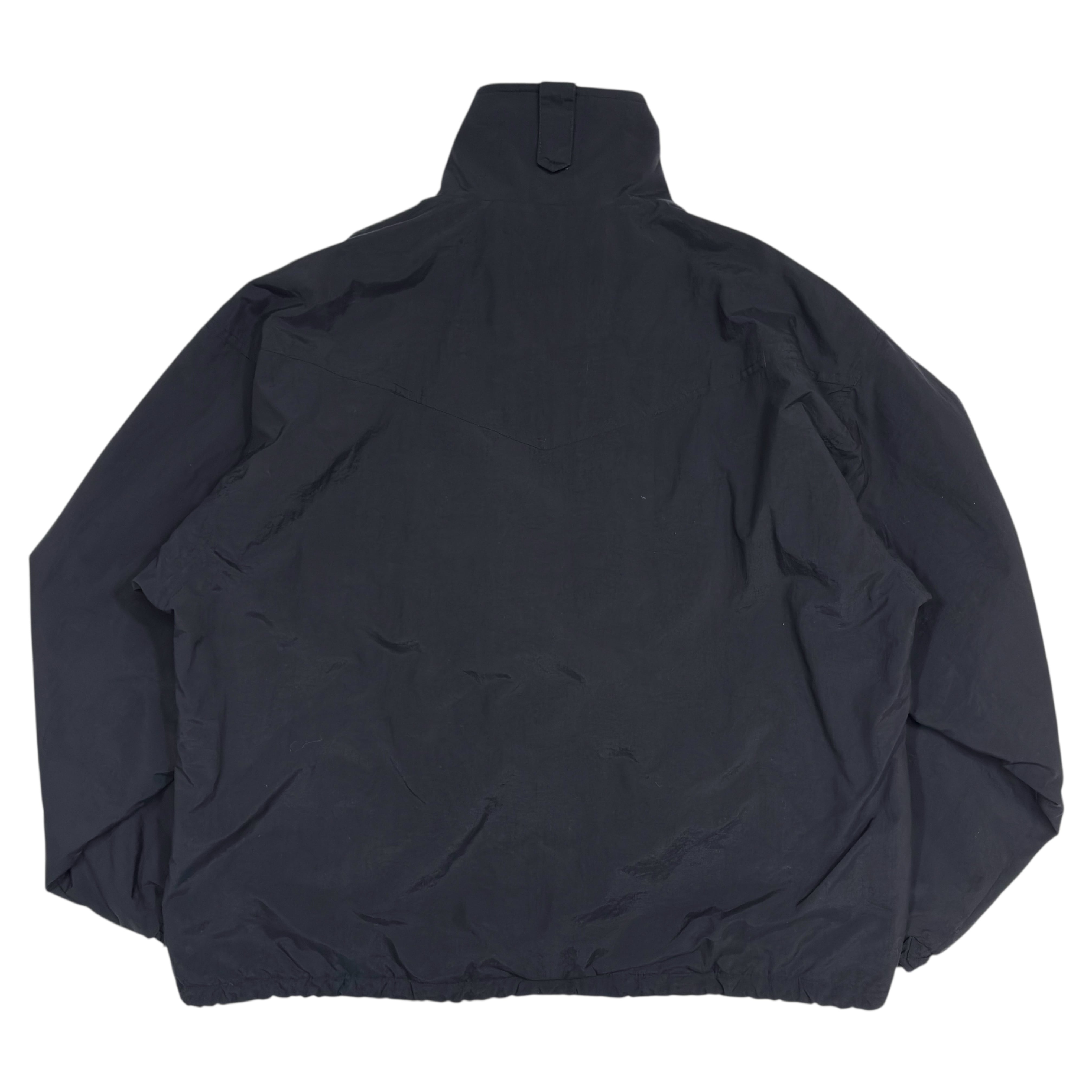 シェルはブラック、内側は深めのフォレストグリーン系フリースで、開けたときの差し色がちょうどいい1枚です。胸は控えめなロゴ、背中は無地で、合わせる服を選ばないミニマル寄りの仕上がり。首元は高めの立ち襟で、フルジップ仕様。両サイドのポケットはジップ付き、袖口はゴム、裾はドローコードで絞れるので、風を入れにくくシルエットの調整もしやすいです。