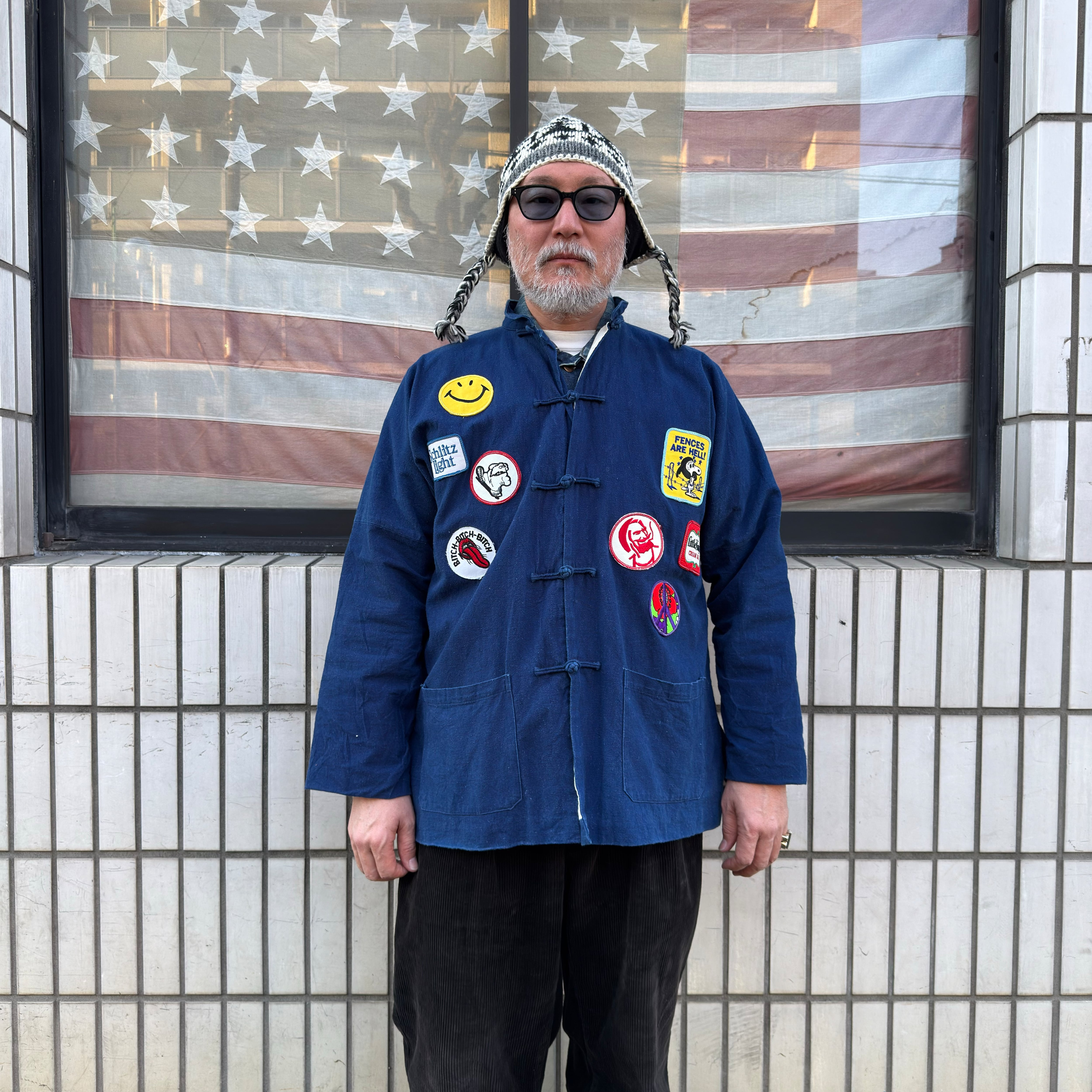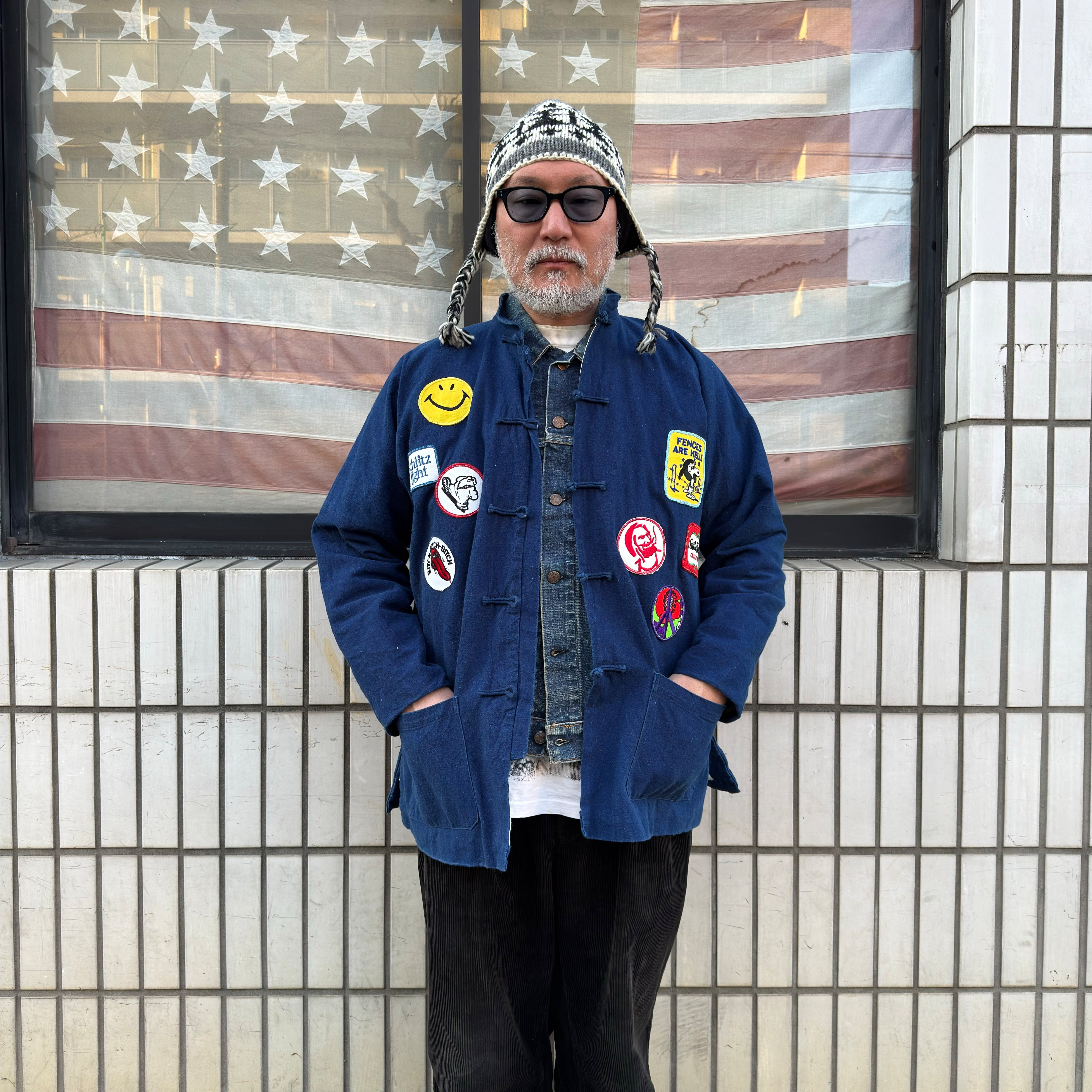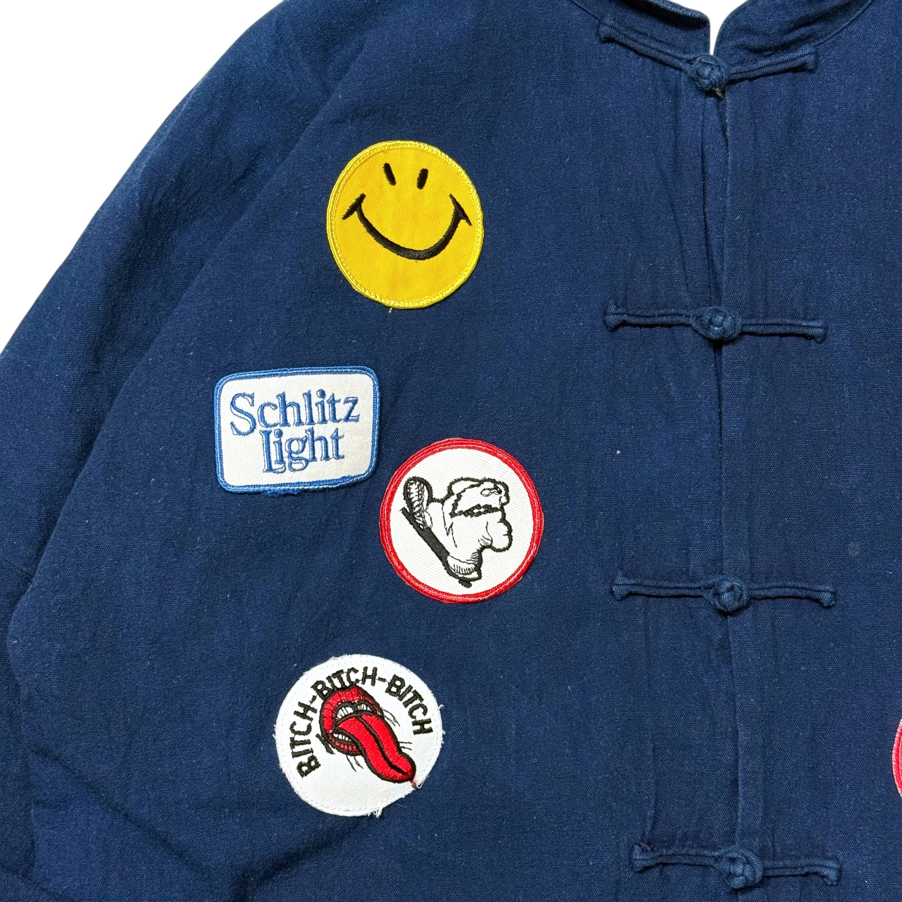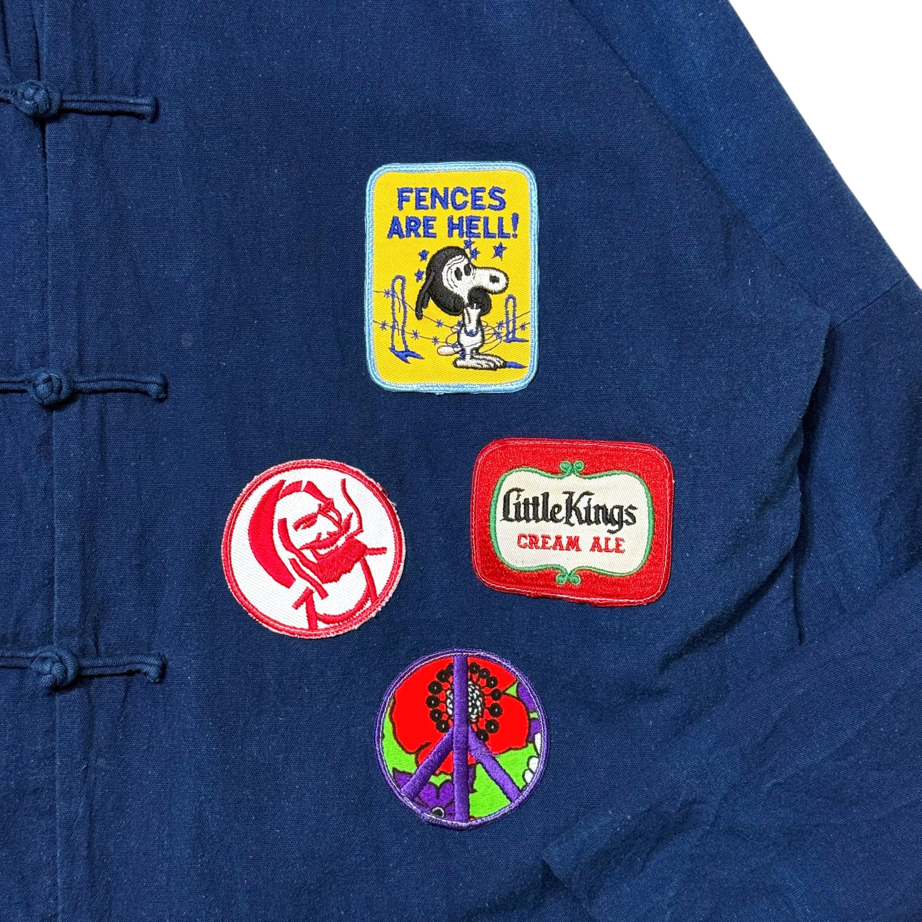 立ち襟+チャイナボタンで、フロントに入ったワッペンが主役急のインパクトを放つ一着。スマイル、ビール系、スヌーピー、ピースマークなど、ジャンル混ぜのワッペンが当時感を醸し出しており、アメリカ古着の中でもちょいヒッピー寄りのノリが強い一着です。