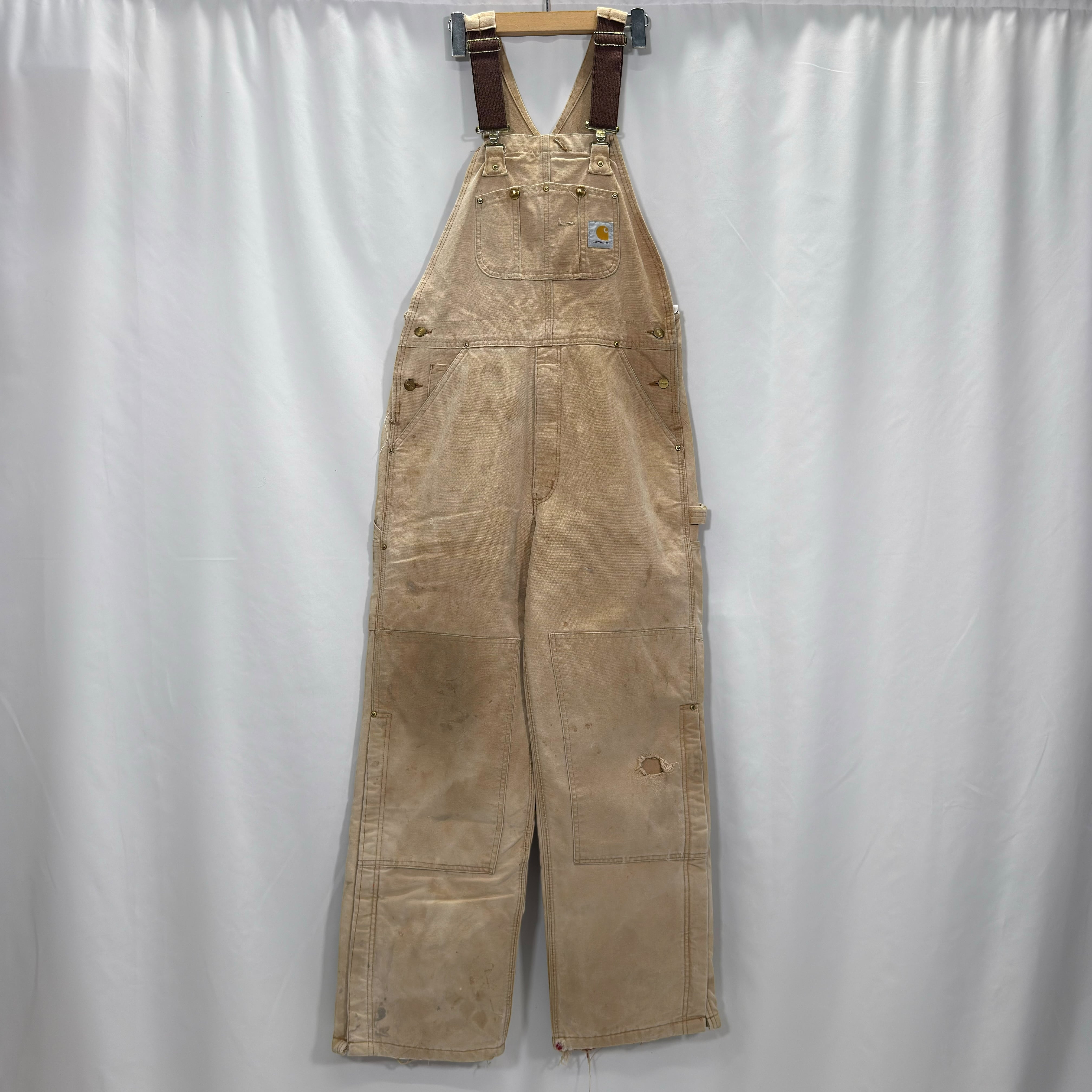 Carharttのダック素材オーバーオール。タフな生地感とワーク由来のディテールがしっかり詰まった1本です。フロントは大きめのビブポケット+サイドポケット、バックポケットも付く実用仕様で、普段使いでもちゃんと使える作り。