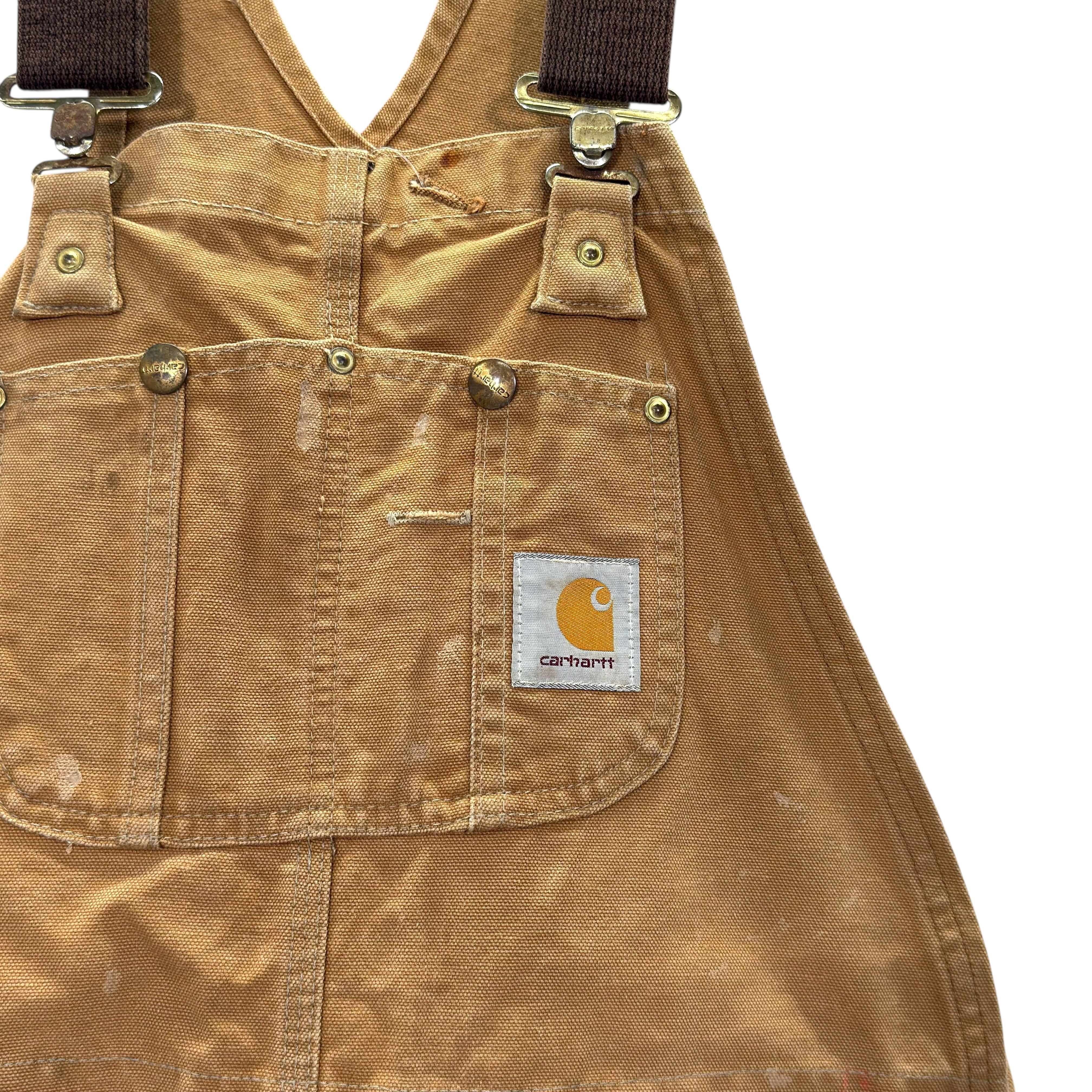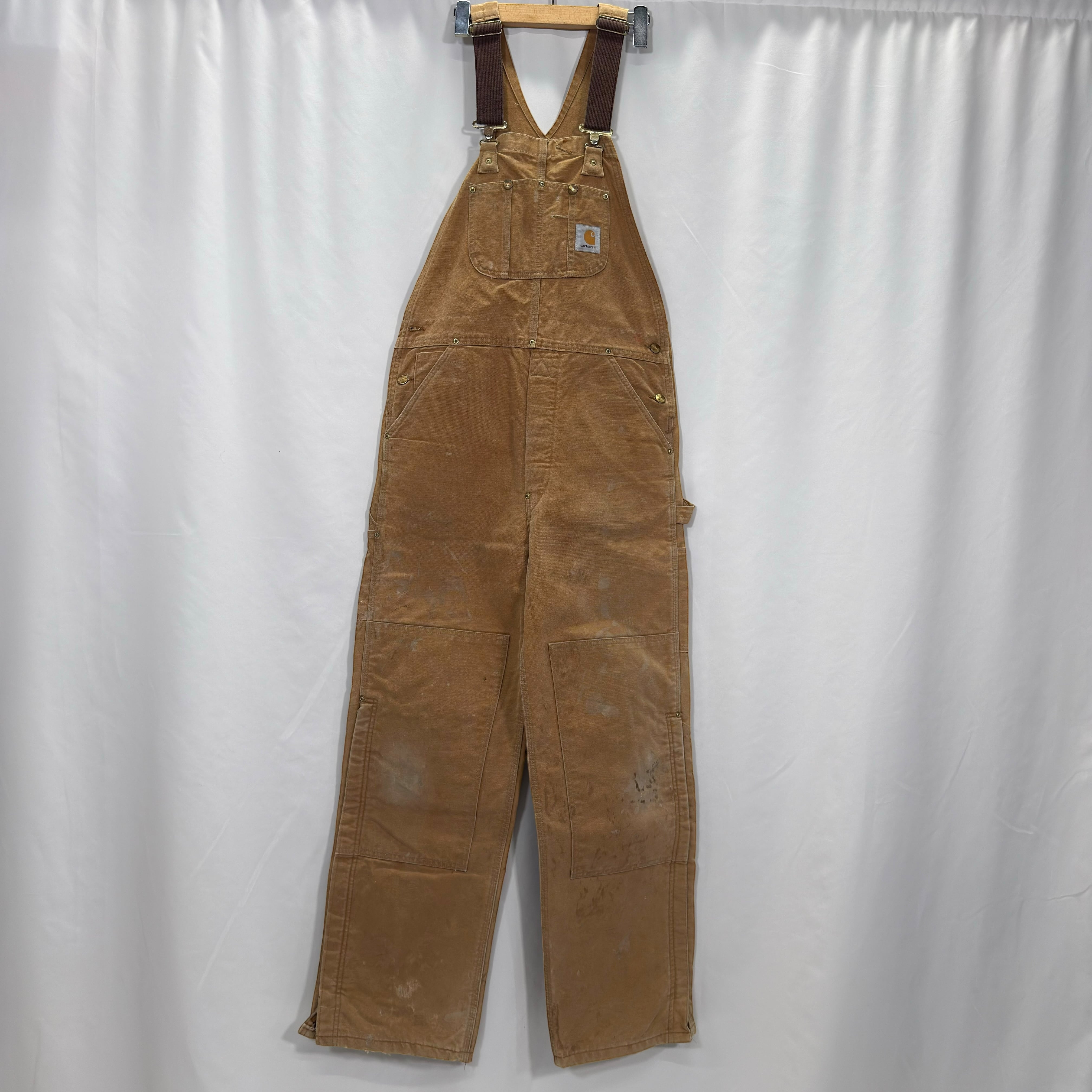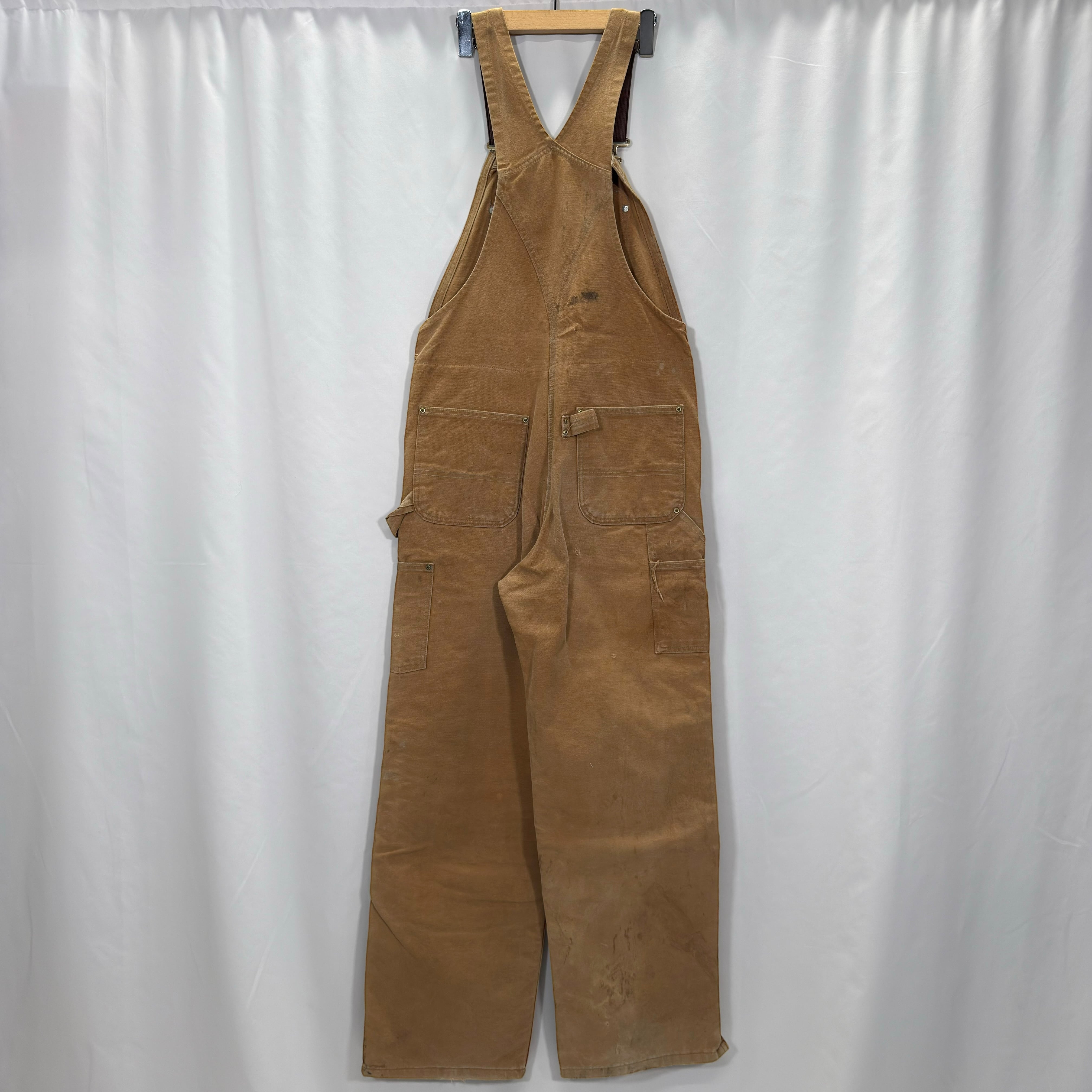 Carharttのダック素材オーバーオール。タフな生地感とワーク由来のディテールがしっかり詰まった1本です。フロントは大きめのビブポケット+サイドポケット、バックポケットも付く実用仕様で、普段使いでもちゃんと使える作り。