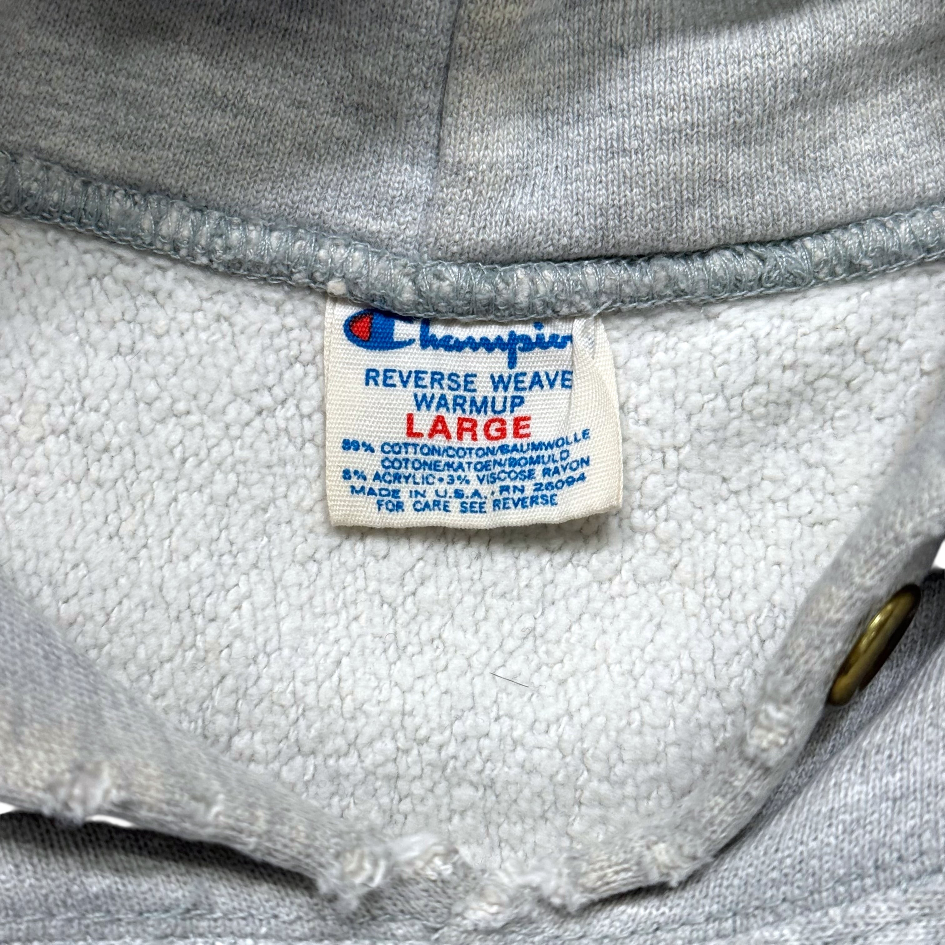 80年代ChampionトリコタグのReverse Weaveフーディ。フロントにはMARYLANDのロゴとUniversity of Marylandのプリントが入り、王道カレッジの良さがストレートに出た1枚です。霜降りグレーのボディに、赤×黒の配色がしっかり映えるので、シンプルに着てもちゃんと画になります。