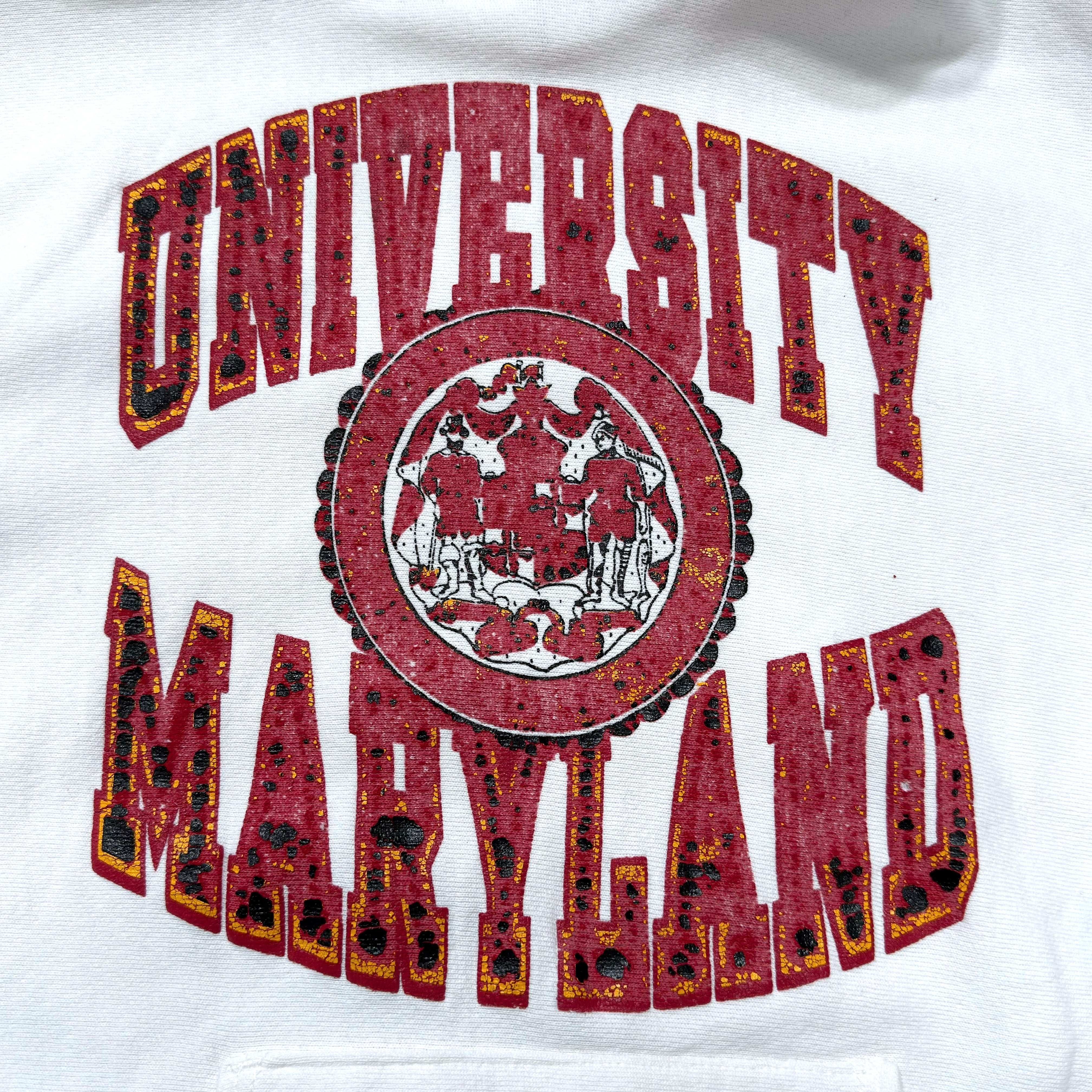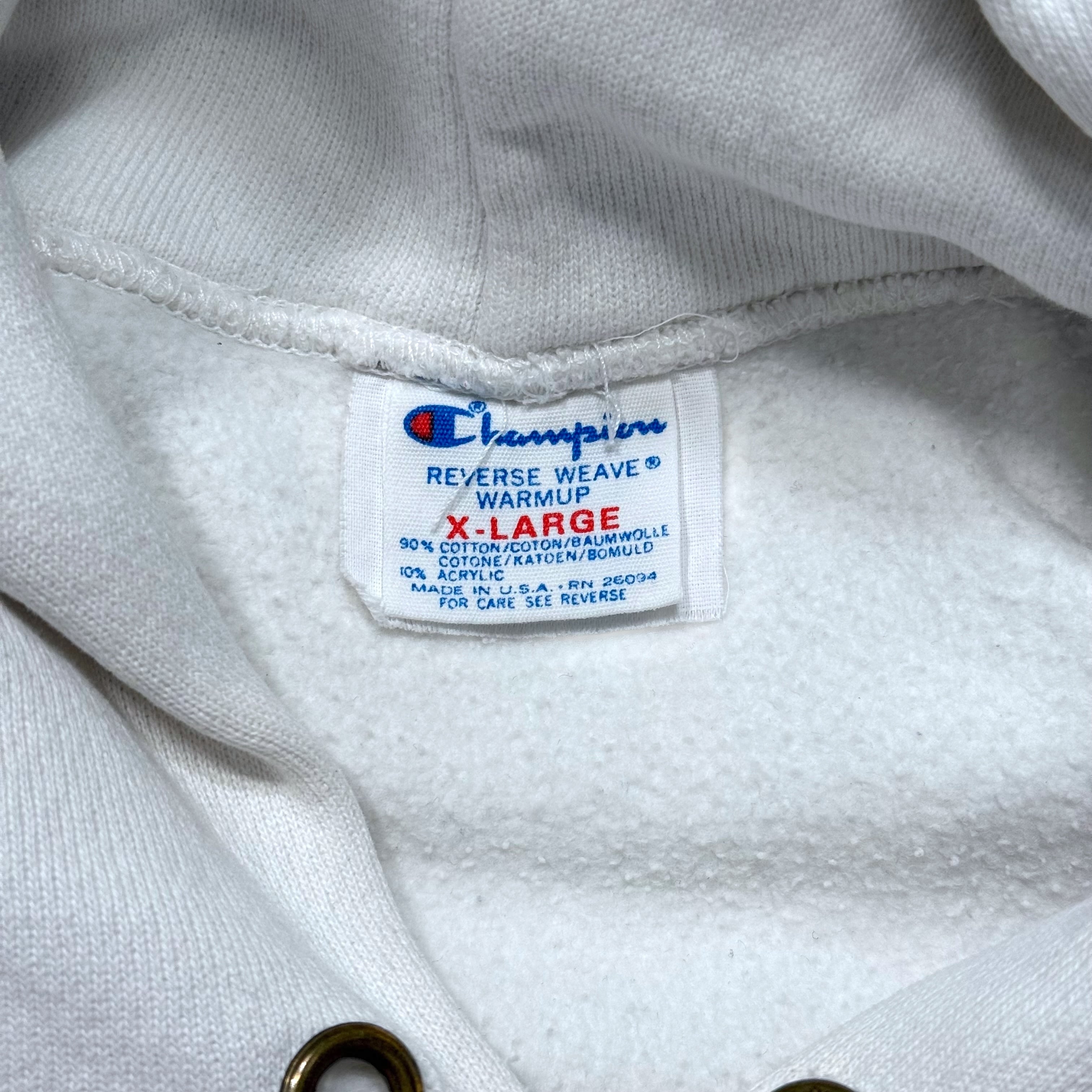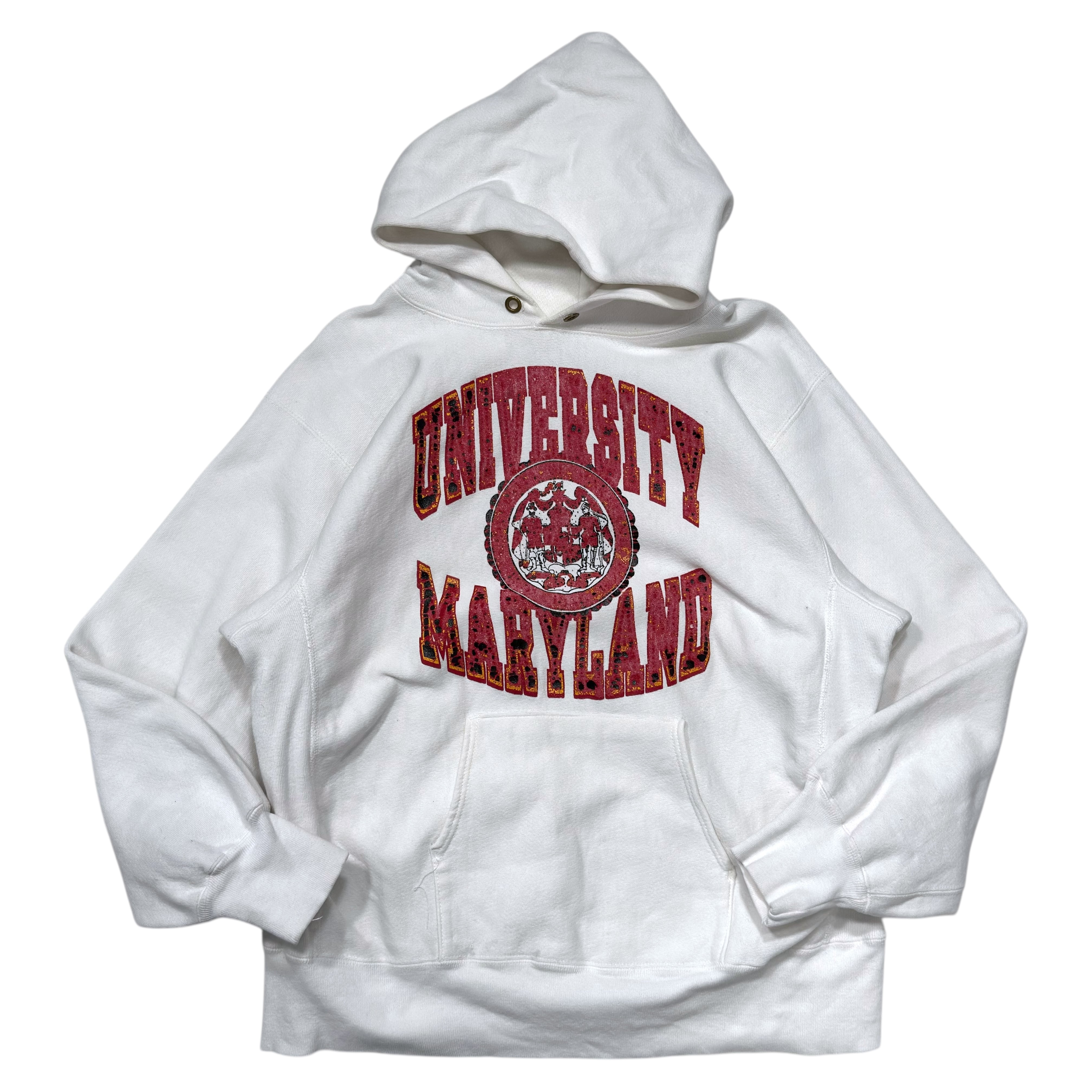 80年代Championのトリコタグが付くReverse Weaveフーディ。こちらは比較的珍しい白ボディで、フロントにはUNIVERSITY OF MARYLANDの大判ロゴ。