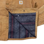 トリプルステッチやブランケットライニングなど、Carharttらしい無骨なディテールも健在。