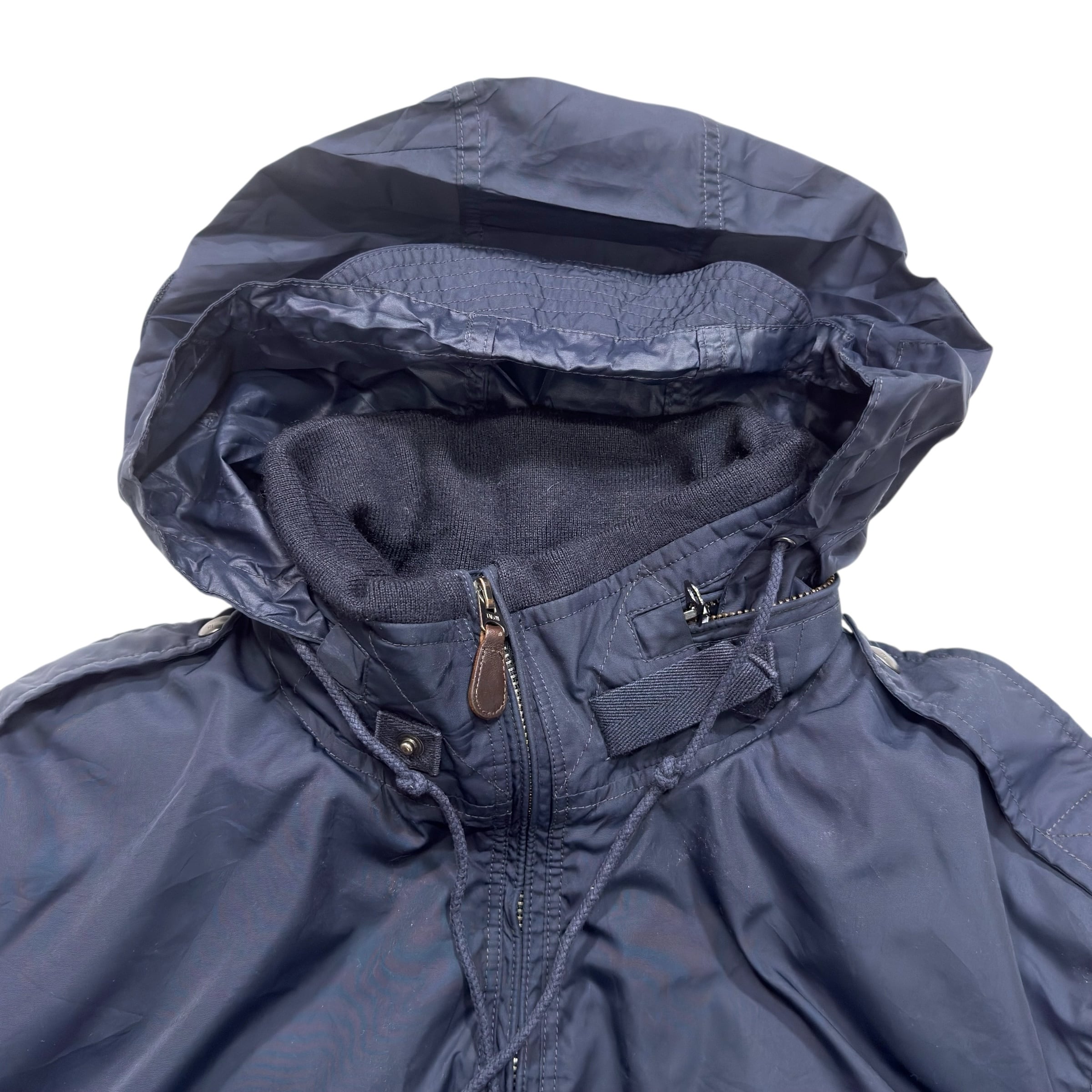 襟まわりは高さのあるスタンドカラーで、フードも内蔵されているタイプなので、必要な時だけ出して使えるのも◎