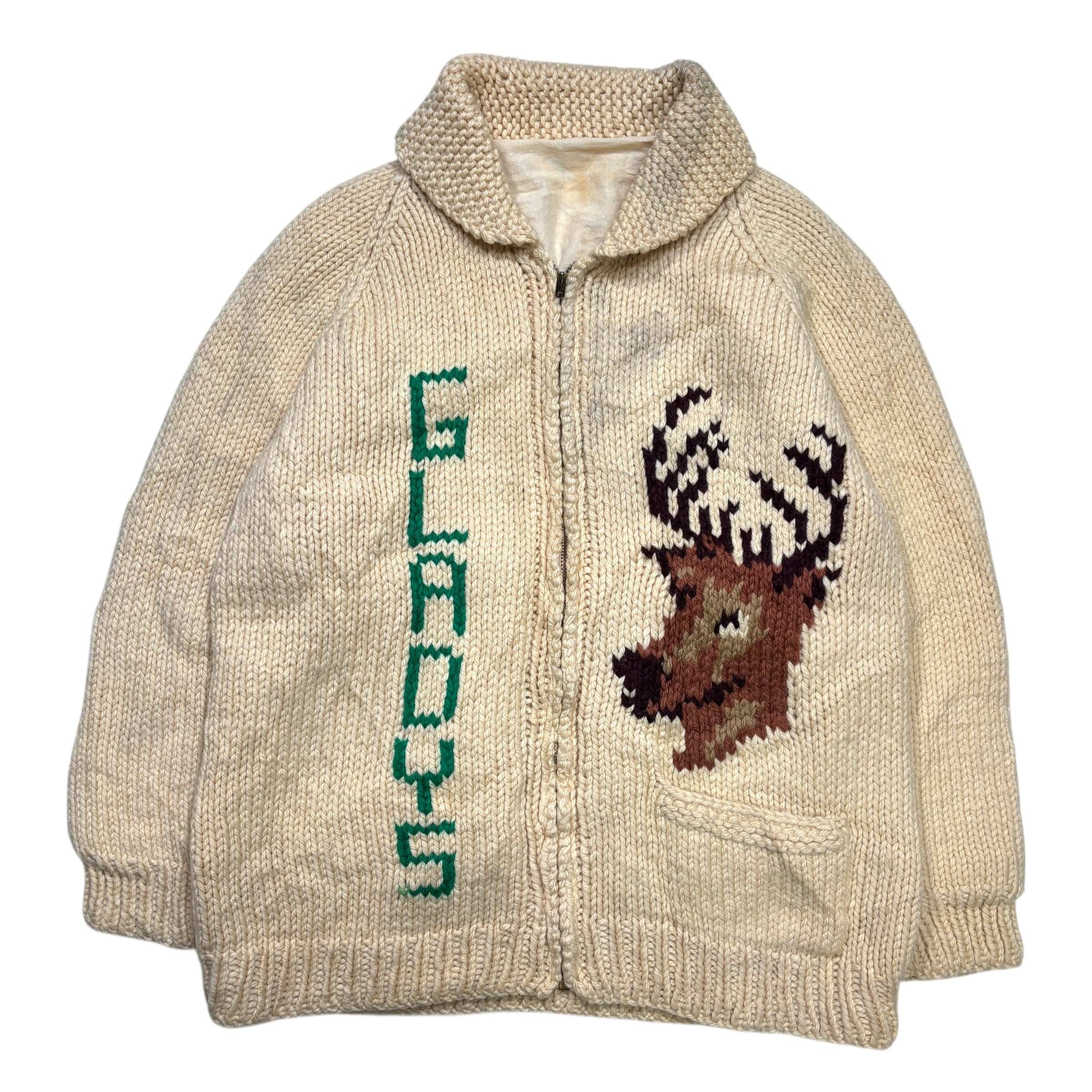 生成りベースの肉厚なウールニットに、フロントには縦書きの「GLADS」レタリング、バックには跳ねる鹿のモチーフが大きく編み込まれた一着。