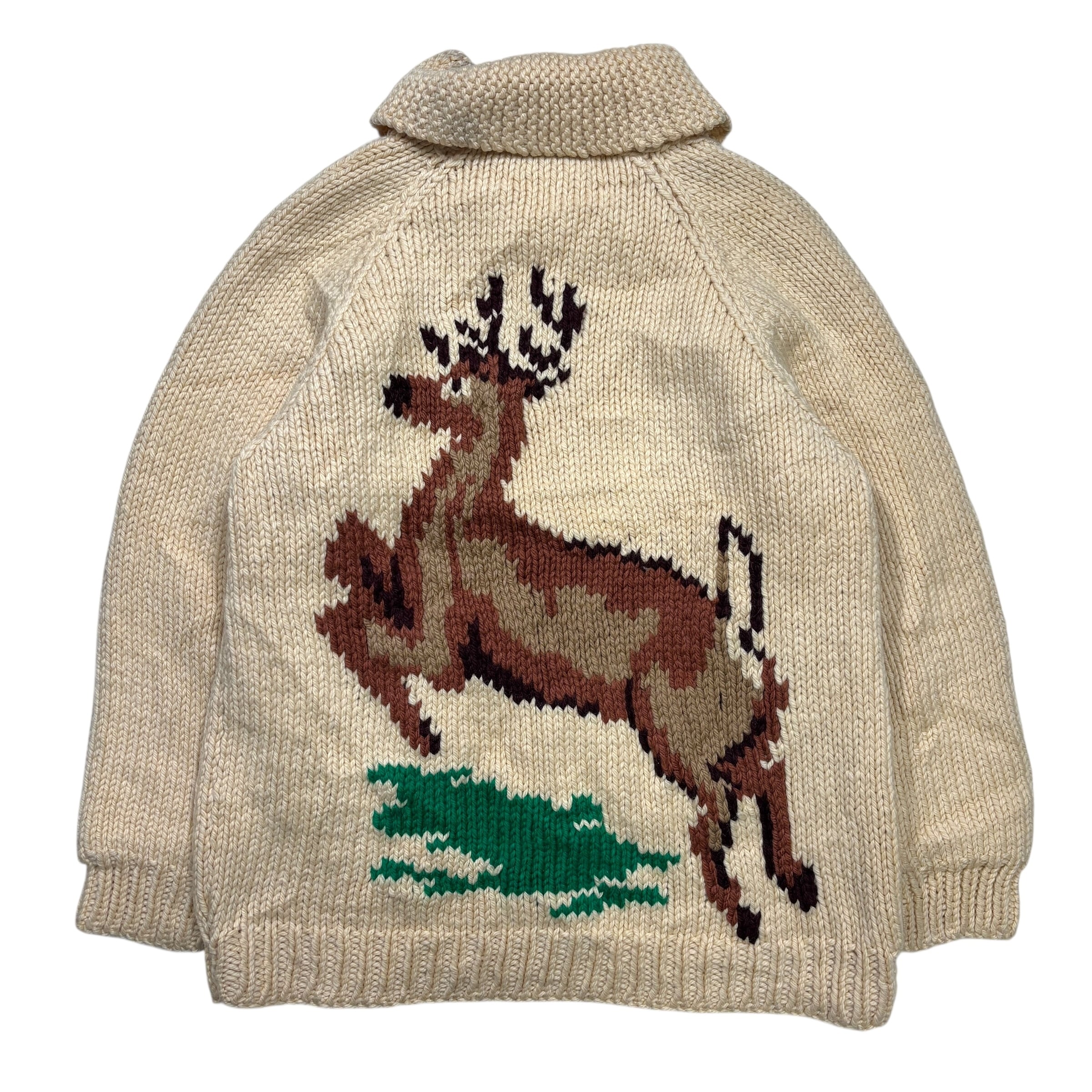 ハンティングやアウトドアを連想させるモチーフながら、いわゆる量産的なセーターとは一線を画す、当時らしい手間のかかった仕上がり。
