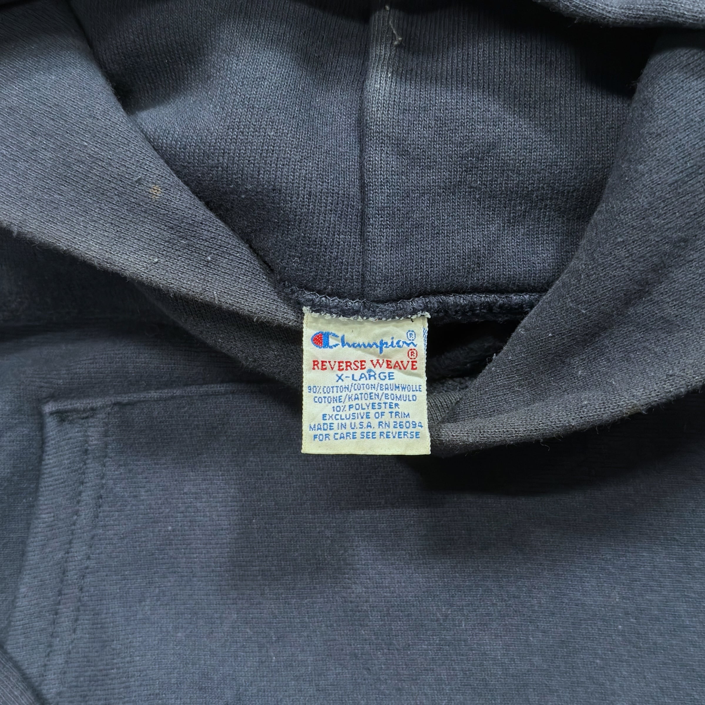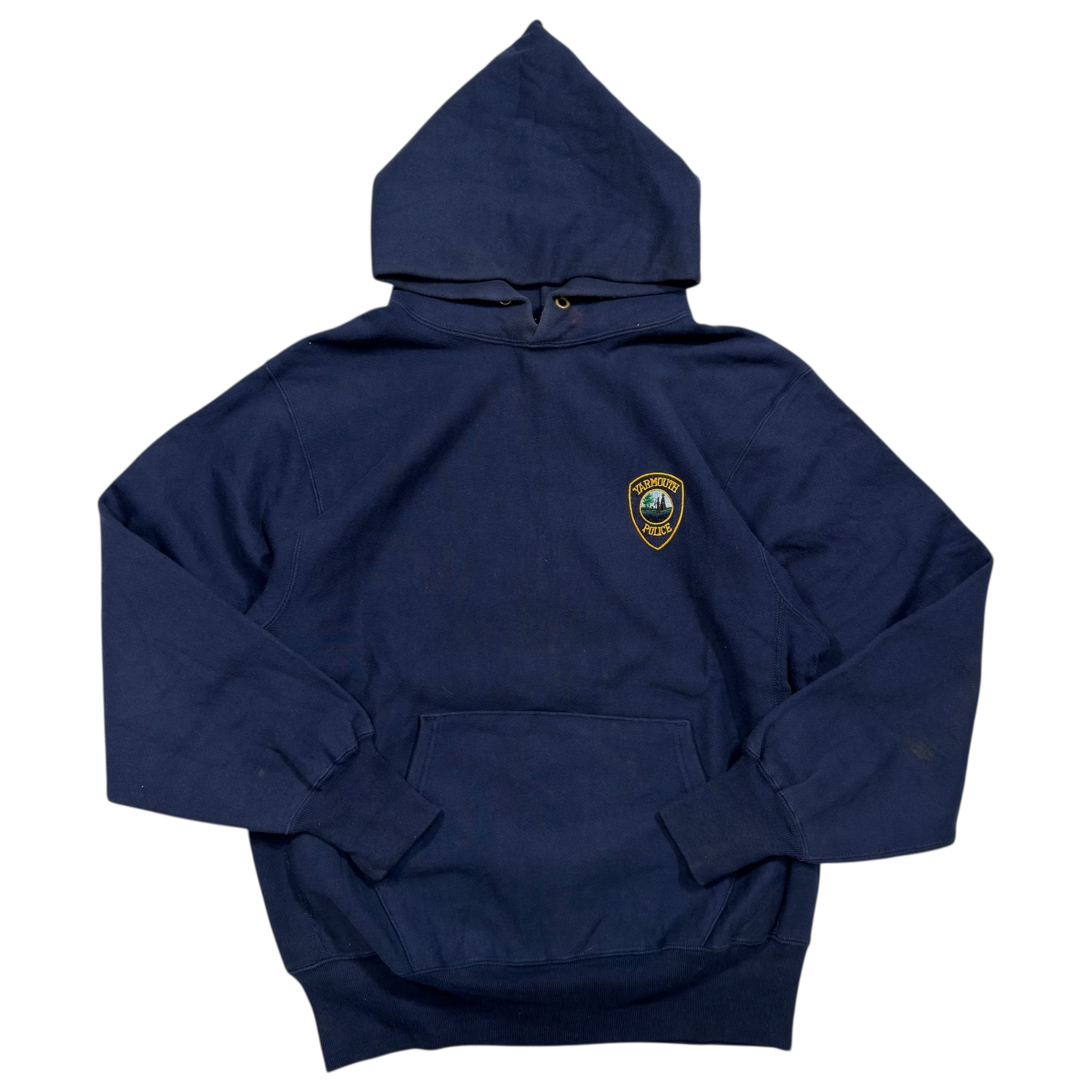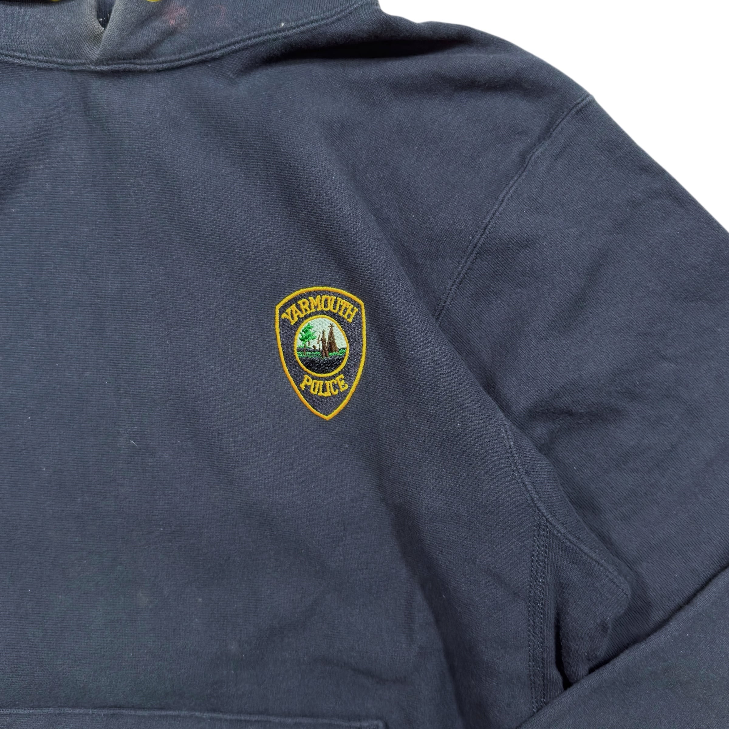 ChampionのReverse Weave プルオーバーフーディ。ボディは深めのネイビーで、左胸に「YARMOUTH POLICE」のシールド型刺繍パッチが付く1枚です。いわゆるカレッジのデカロゴとは違って、胸ワンポイントのバランスが良く、主張しすぎないのに“らしさ”がちゃんと残るタイプです。