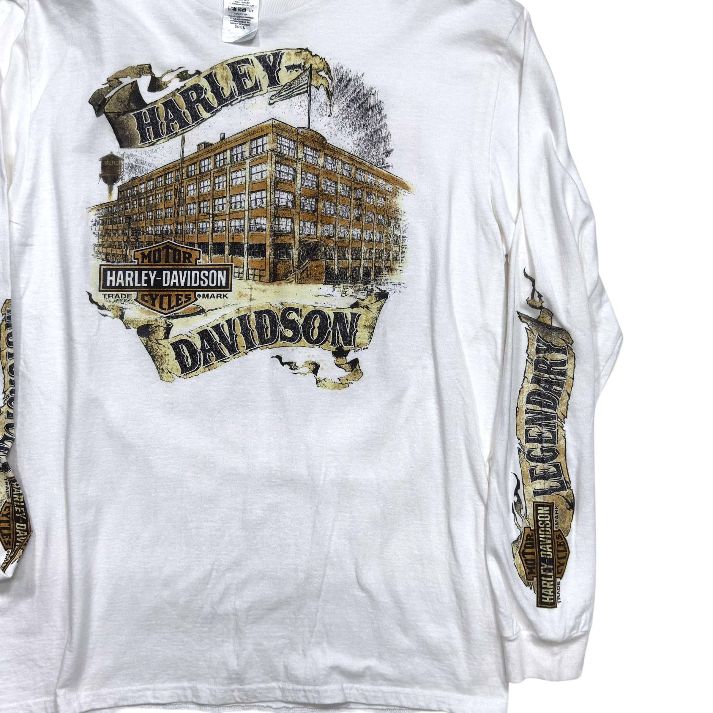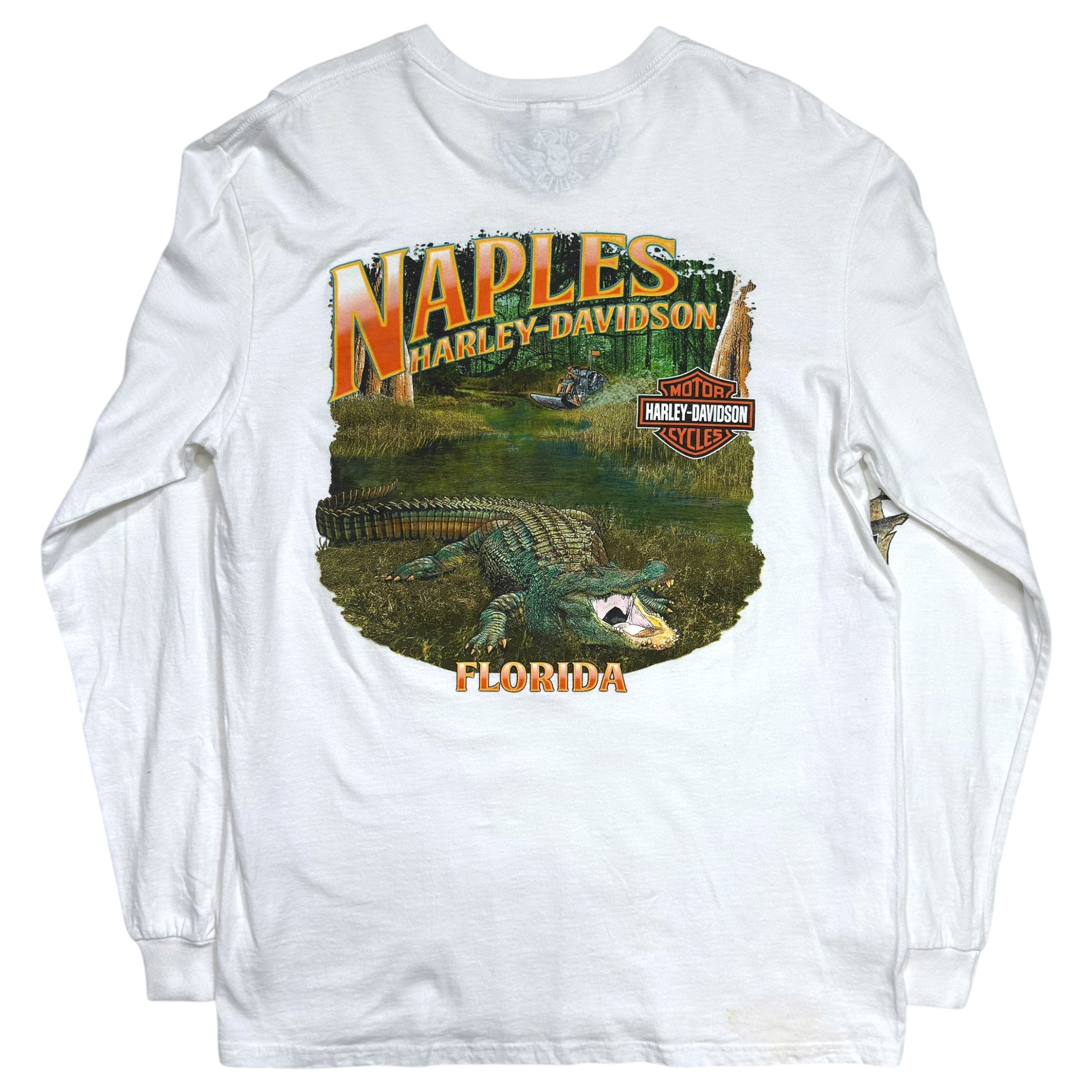 ホワイトボディに、フロントはHARLEY-DAVIDSONのファクトリーモチーフ、バックは“NAPLES HARLEY-DAVIDSON FLORIDA”のアリゲーターグラフィック、さらに袖にも同系統のペーパー調ロゴプリントが入るロングスリーブT。