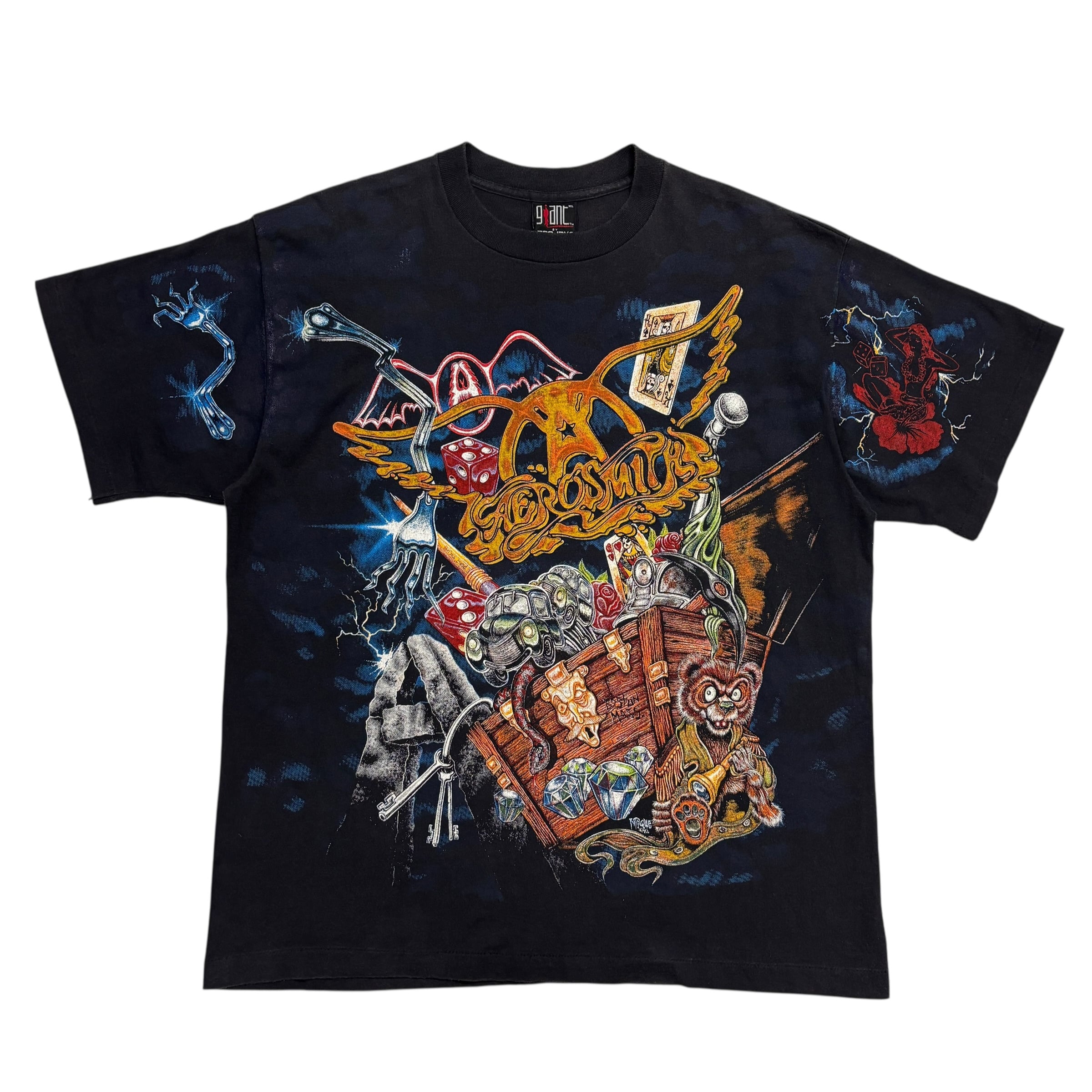 グラフィックは、彼らの代表曲であり名盤のタイトルでもある「Toys in the Attic」をテーマにしたもの。屋根裏のガラクタ箱からモンスターや宝石が溢れ出すような、毒気と遊び心が同居した圧巻のアートワークです。フロント、バック、さらに両袖にまで贅沢に施された大判のマルチプリントは、数多あるエアロスミスTでも、トップクラスの完成度かと。