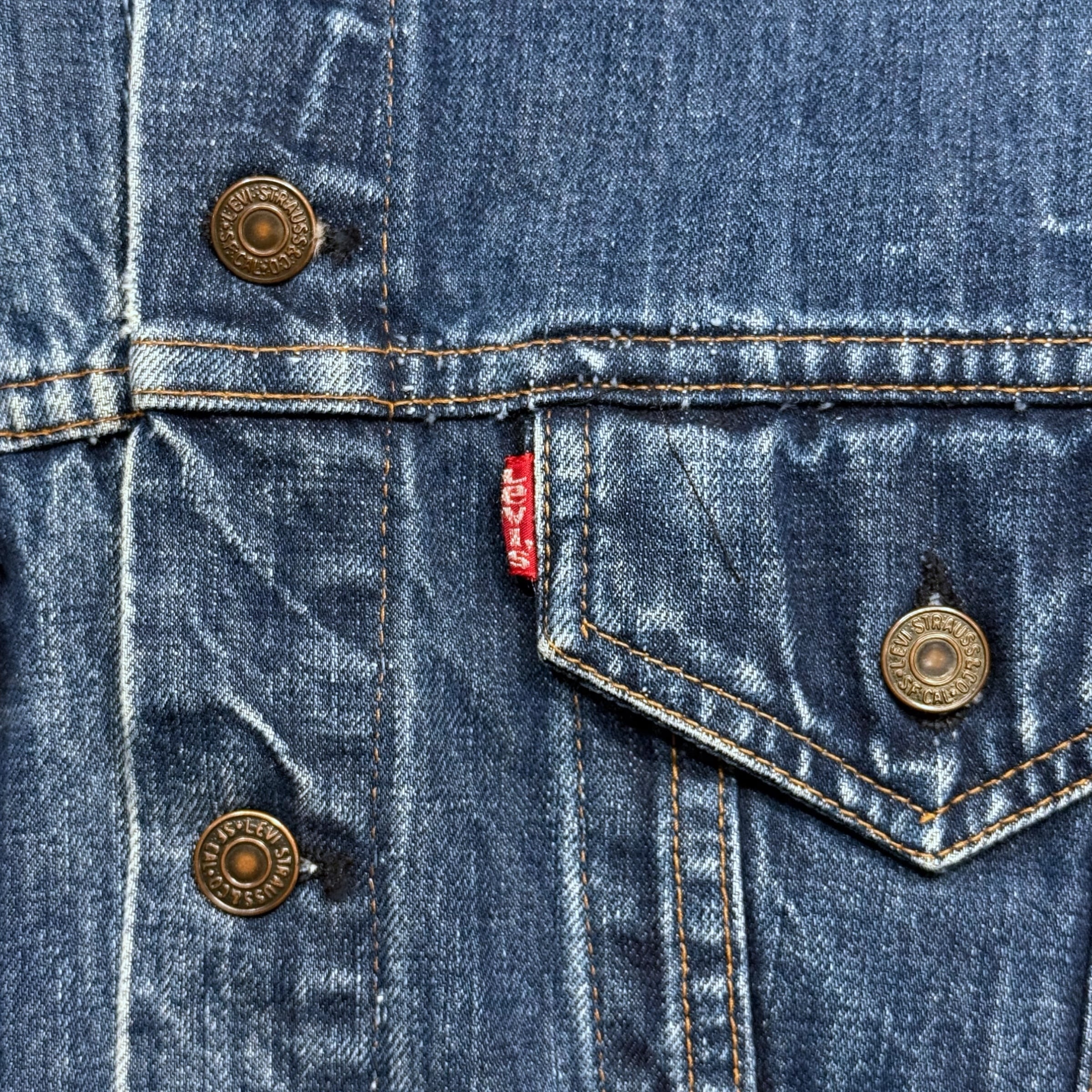 ヴィンテージデニムジャケットの完成形と称される、リーバイスの傑作"70505"モデルです。赤タブはスモールe、ボタン裏には「529」の刻印が入っております。