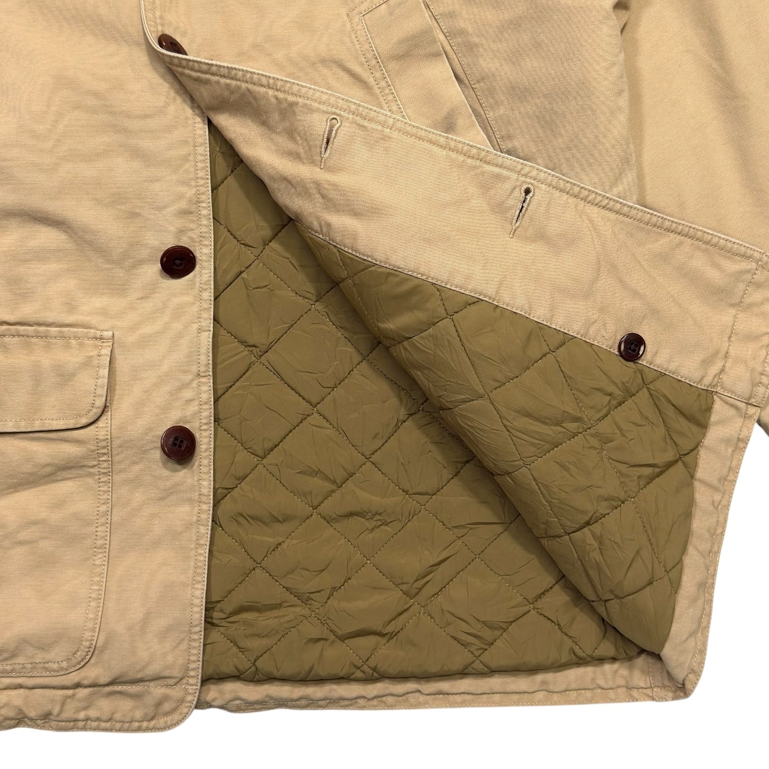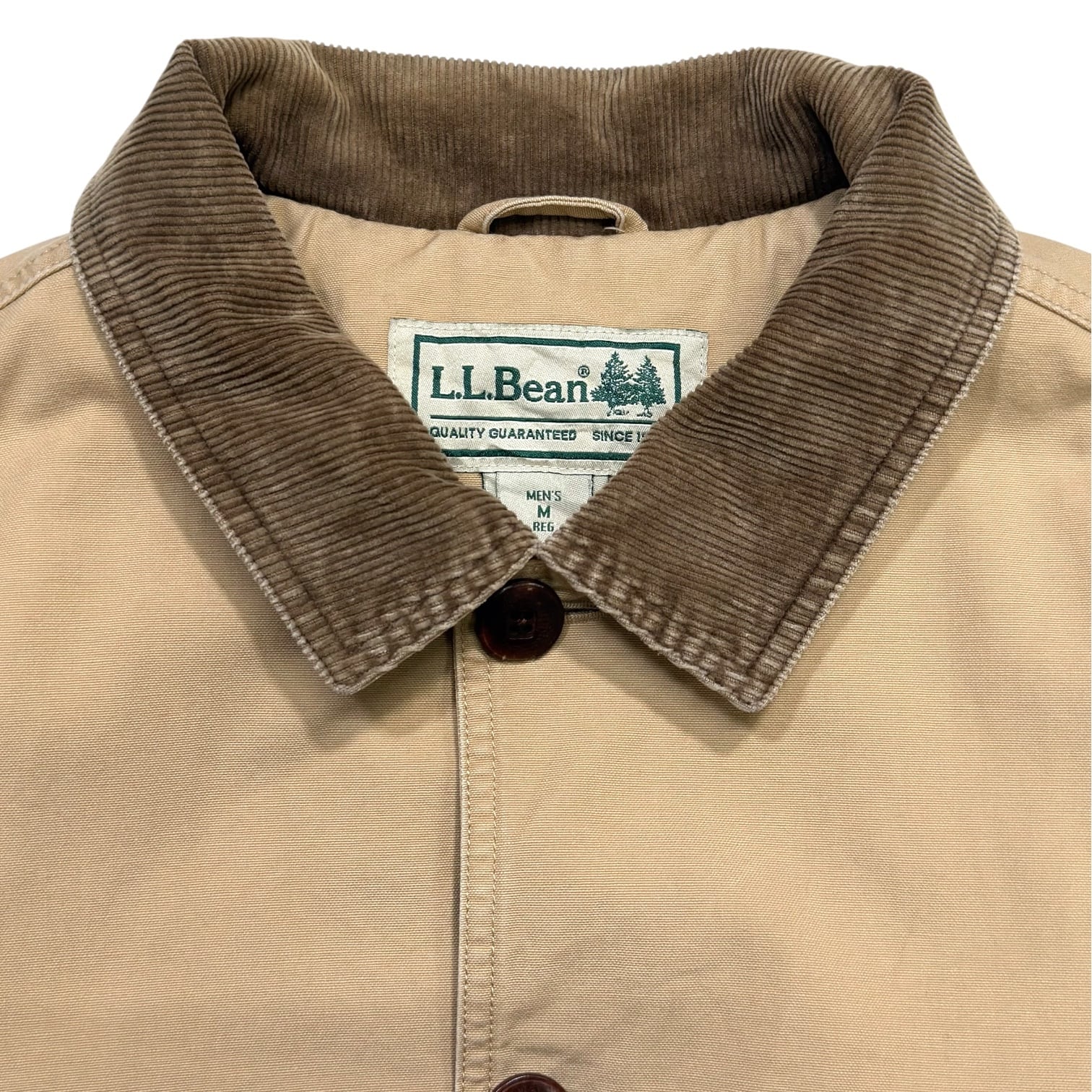タフなベージュのコットンキャンバス生地に、ブラウンのコーデュロイ襟を合わせた王道のデザイン。