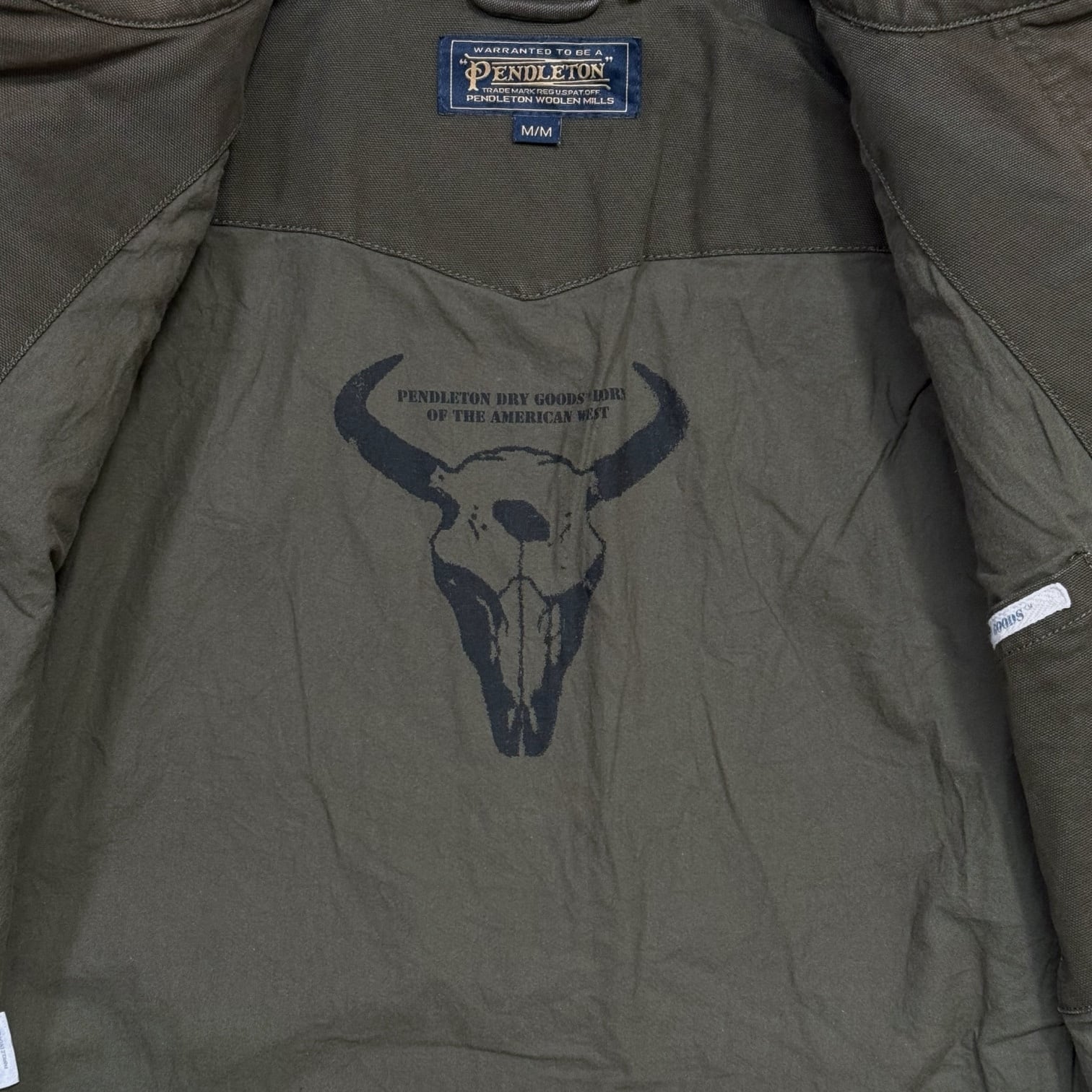 裏地にはバッファロースカルのプリント。「PENDLETON DRY GOODS OF THE AMERICAN WEST」のロゴと共に描かれたグラフィックは、ペンドルトンらしい男臭いウェスタンテイスト全開で、脱いだ時やハンガーに掛けた時も格好良いです。